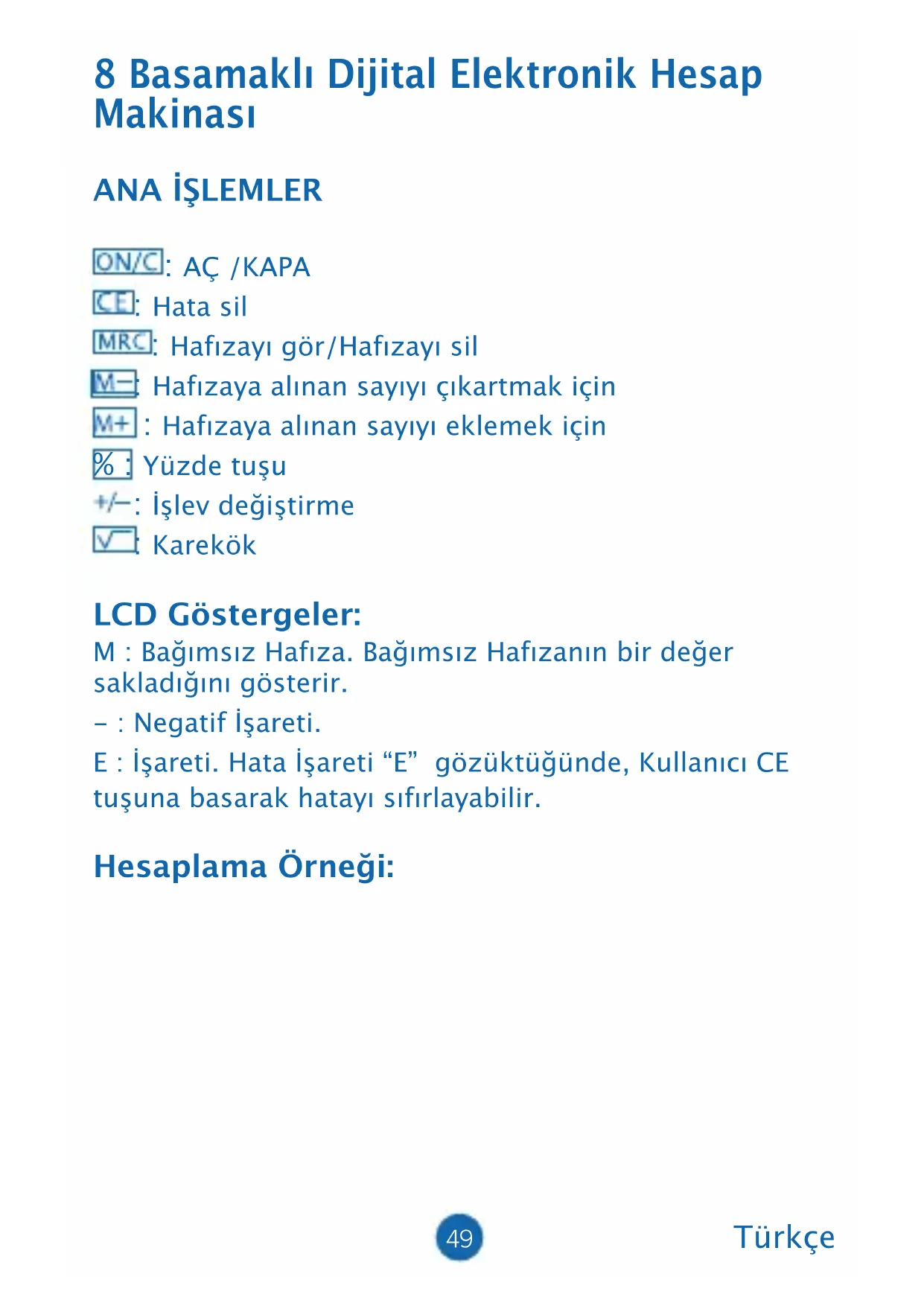 (4) Επανατοποθετήσετε το σκέπασμα και βιδώστε το (χωρίς να πιέσετε υπερβολικά) (5) Αυτόματη απενεργοποίηση: Κατά προσέγγιση μετά από 8 λεπτά.49 8 Basamaklı Dijital Elektronik Hesap Makinası ANA İŞLEMLER : AÇ /KAPA : Hata sil : Hafızayı gör/Hafızayı sil : Hafızaya alınan sayıyı çıkartmak için : Hafızaya alınan sayıyı eklemek için % : Yüzde tuşu : İşlev değiştirme : Karekök LCD Göstergeler: M : Bağımsız Hafıza. Bağımsız Hafızanın bir değer sakladığını gösterir. - : Negatif İşareti. E : İşareti. Hata İşareti “E” gözüktüğünde, Kullanıcı CE tuşuna basarak hatayı sıfırlayabilir. Hesaplama Örneği: Türkçe50 ON/C 5+6M 32-6M+ 36+17M- MRC