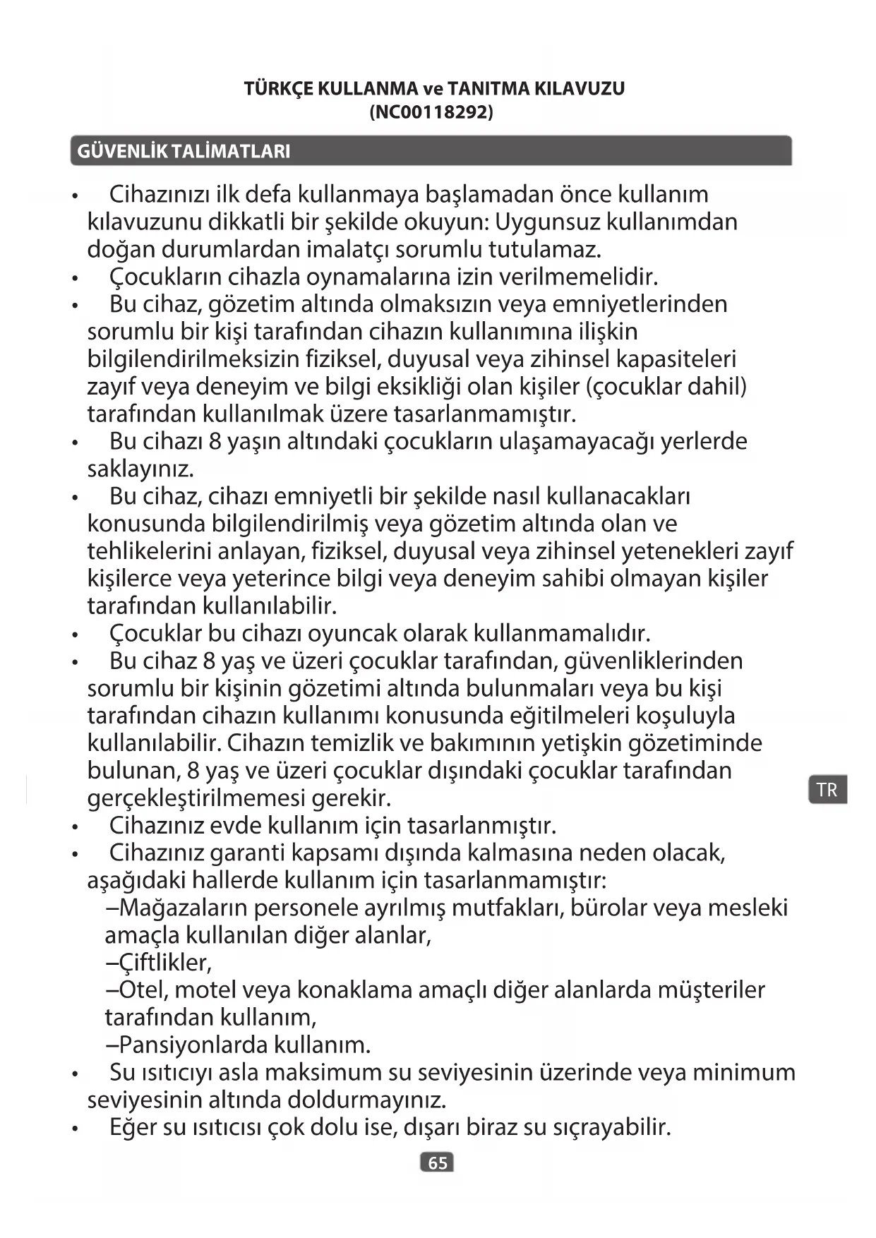 - Bu cihaz 8 yaş ve üzeri çocuklar tarafından, güvenliklerinden sorumlu bir kişinin gözetimi altında bulunmaları veya bu kişi tarafından cihazın kullanımı konusunda eğitilmeleri koşuluyla kullanılabilir. Cihazın temizlik ve bakımının yetişkin gözetiminde bulunan, 8 yaş ve üzeri çocuklar dışındaki çocuklar tarafından gerçekleştirilmemesi gerekir.