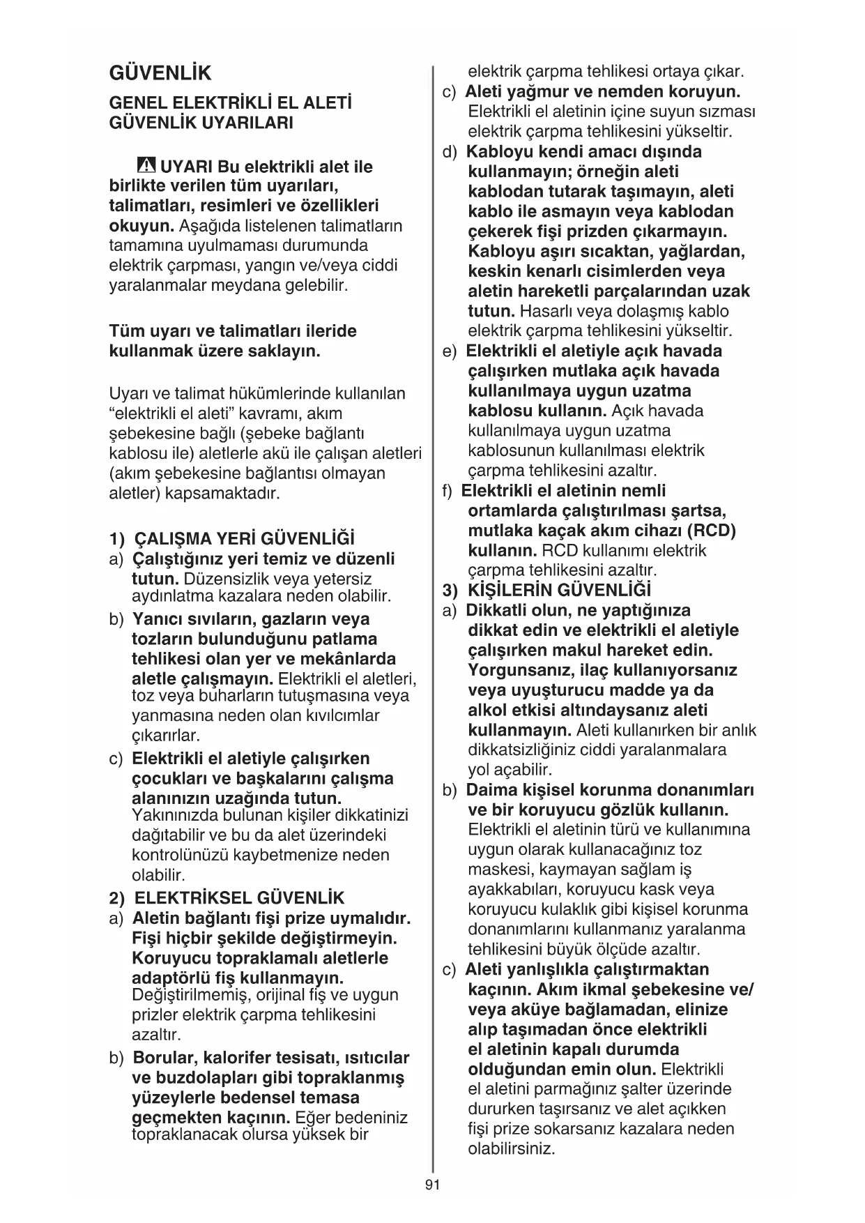 - UYARI Bu elektrikli alet ile birlikte verilen tüm uyarıları, talimatları, resimleri ve özellikleri okuyun. Aşağıda listelenen talimatların tamamına uyulmaması durumunda elektrik çarpması, yangın ve/veya ciddi yaralanmalar meydana gelebilir. Tüm uyarı ve talimatları ileride kullanmak üzere saklayın. Uyarı ve talimat hükümlerinde kullanılan “elektrikli el aleti” kavramı, akım şebekesine bağlı (şebeke bağlantı kablosu ile) aletlerle akü ile çalışan aletleri (akım şebekesine bağlantısı olmayan aletler) kapsamaktadır.