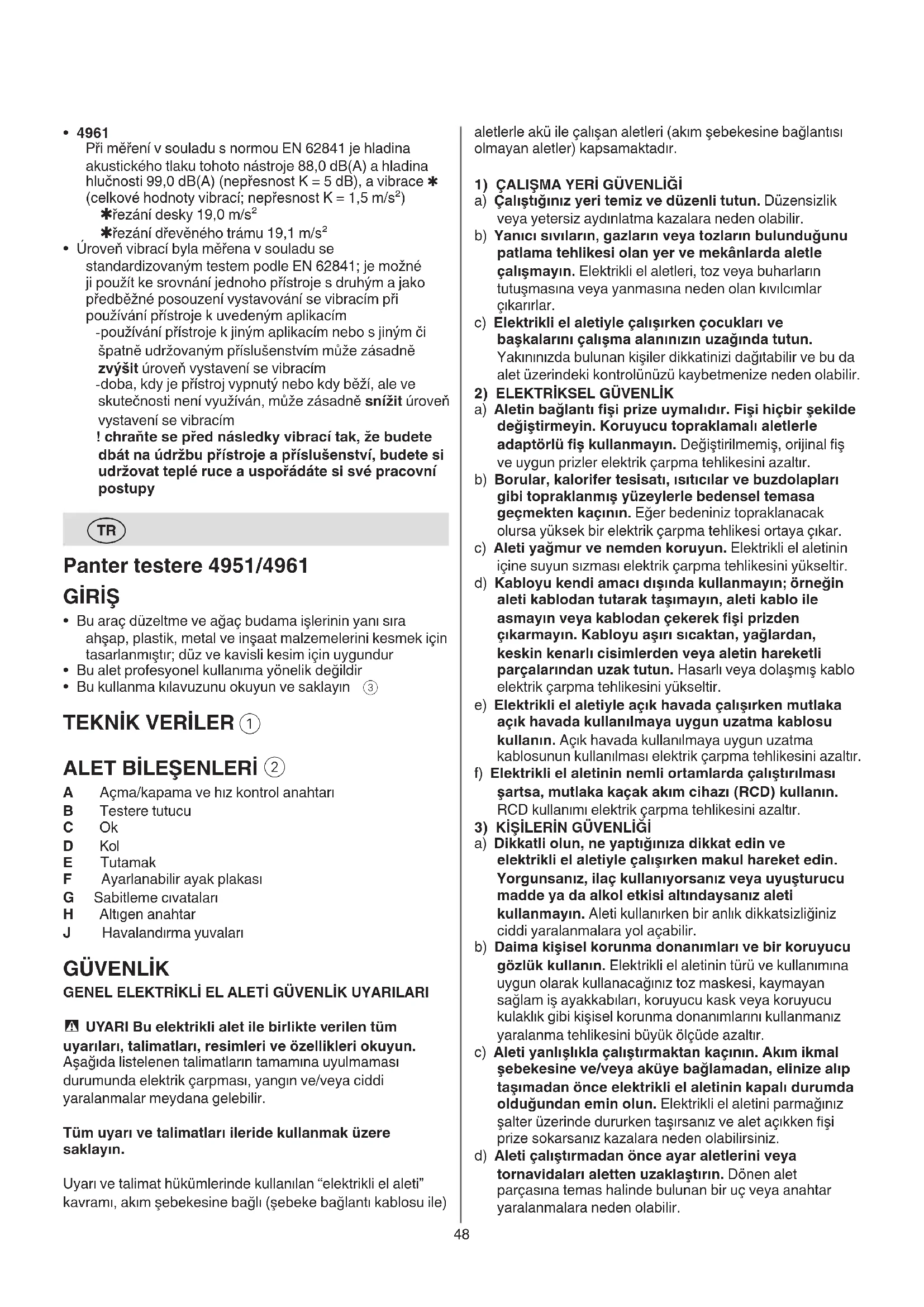 GENEL ELEKTRİKLİ EL ALETİ GÜVENLİK UYARILARI - UYARI Bu elektrikli alet ile birlikte verilen tüm uyarıları, talimatları, resimleri ve özellikleri okuyun. Aşağıda listelenen talimatların tamamına uyulmaması durumunda elektrik çarpması, yangın ve/veya ciddi yaralanmalar meydana gelebilir. Tüm uyarı ve talimatları ileride kullanmak üzere saklayın. Uyarı ve talimat hükümlerinde kullanılan “elektrikli el aleti” kavramı, akım şebekesine bağlı (şebeke bağlantı kablosu ile)49 PANTER TESTERELER İÇİN GÜVENLİK TALİMATI