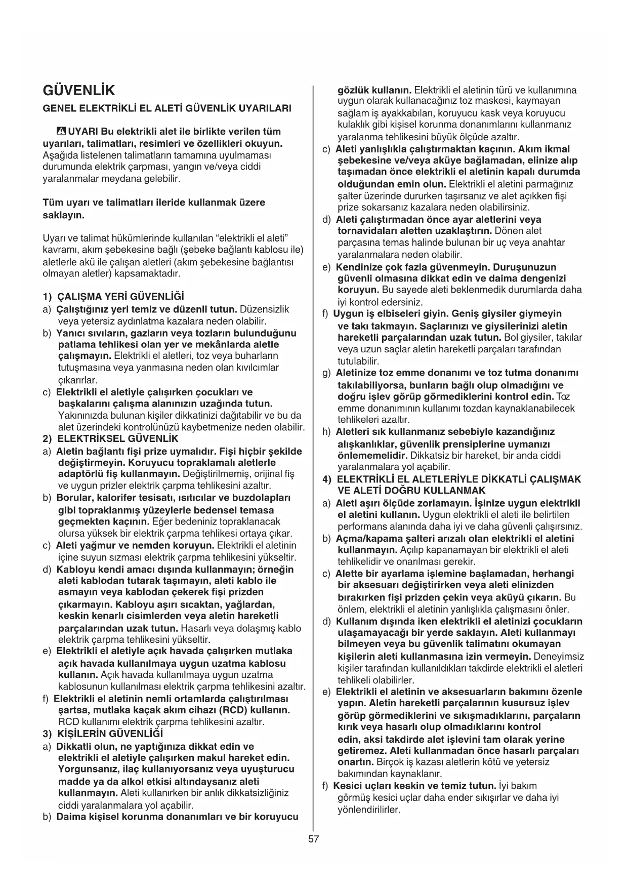 a) Dikkatli olun, ne yaptığınıza dikkat edin ve elektrikli el aletiyle çalışırken makul hareket edin. Yorgunsanız, ilaç kullanıyorsanız veya uyuşturucu madde ya da alkol etkisi altındaysanız aleti kullanmayın. Aleti kullanırken bir anlık dikkatsizliğiniz ciddi yaralanmalara yol açabilir. b) Daima kişisel korunma donanımları ve bir koruyucu58