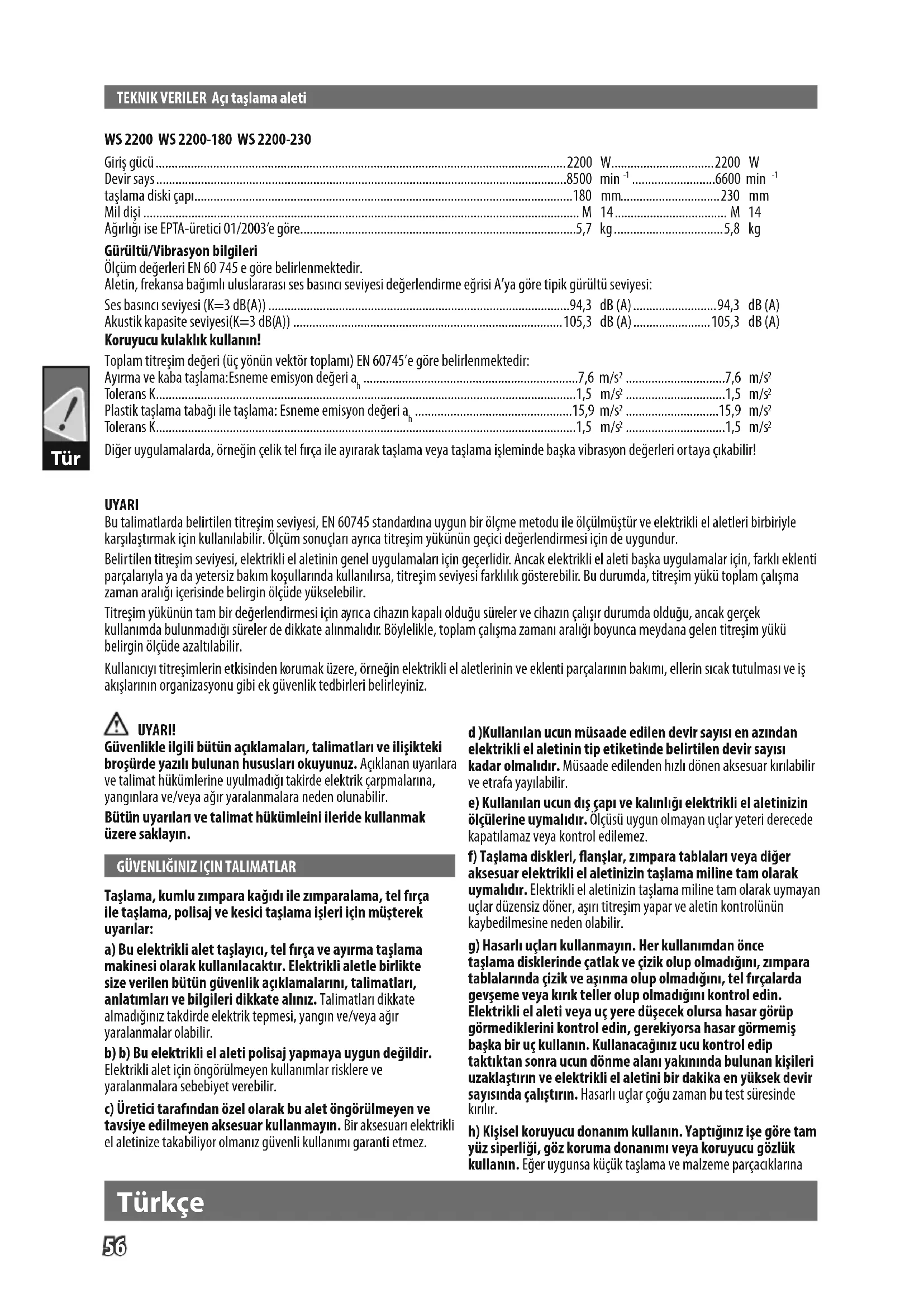taşlama diski çapı ......................................................................................................................180 mm...............................230 mm Mil dişi ........................................................................................................................................ M 14 ................................... M 14 Ağırlığı ise EPTA-üretici 01/2003‘e göre. .....................................................................................5,7 kg ..................................5,8 kg Gürültü/Vibrasyon bilgileri Ölçüm değerleri EN 60 745 e göre belirlenmektedir. Aletin, frekansa bağımlı uluslararası ses basıncı seviyesi değerlendirme eğrisi A’ya göre tipik gürültü seviyesi: Ses basıncı seviyesi (K=3 dB(A)) ..............................................................................................94,3 dB (A) ..........................94,3 dB (A) Akustik kapasite seviyesi(K=3 dB(A)) ....................................................................................105,3 dB (A) ........................105,3 dB (A) Koruyucu kulaklık kullanın! Toplam titreşim değeri (üç yönün vektör toplamı) EN 60745’e göre belirlenmektedir: Ayırma ve kaba taşlama:Esneme emisyon değeri a