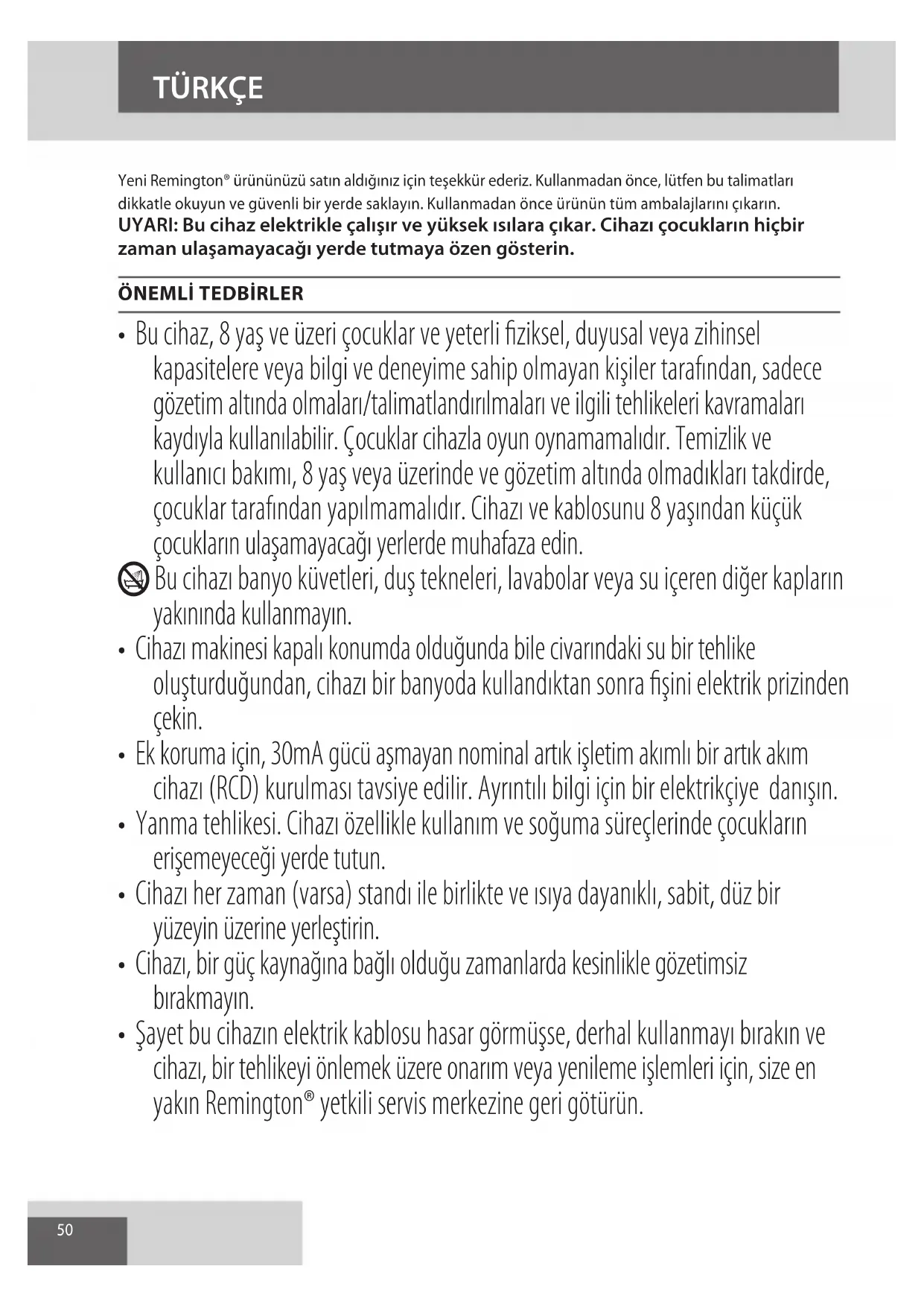 - Şayet bu cihazın elektrik kablosu hasar görmüşse, derhal kullanmayı bırakın ve cihazı, bir tehlikeyi önlemek üzere onarım veya yenileme işlemleri için, size en yakın Remington® yetkili servis merkezine geri götürün.