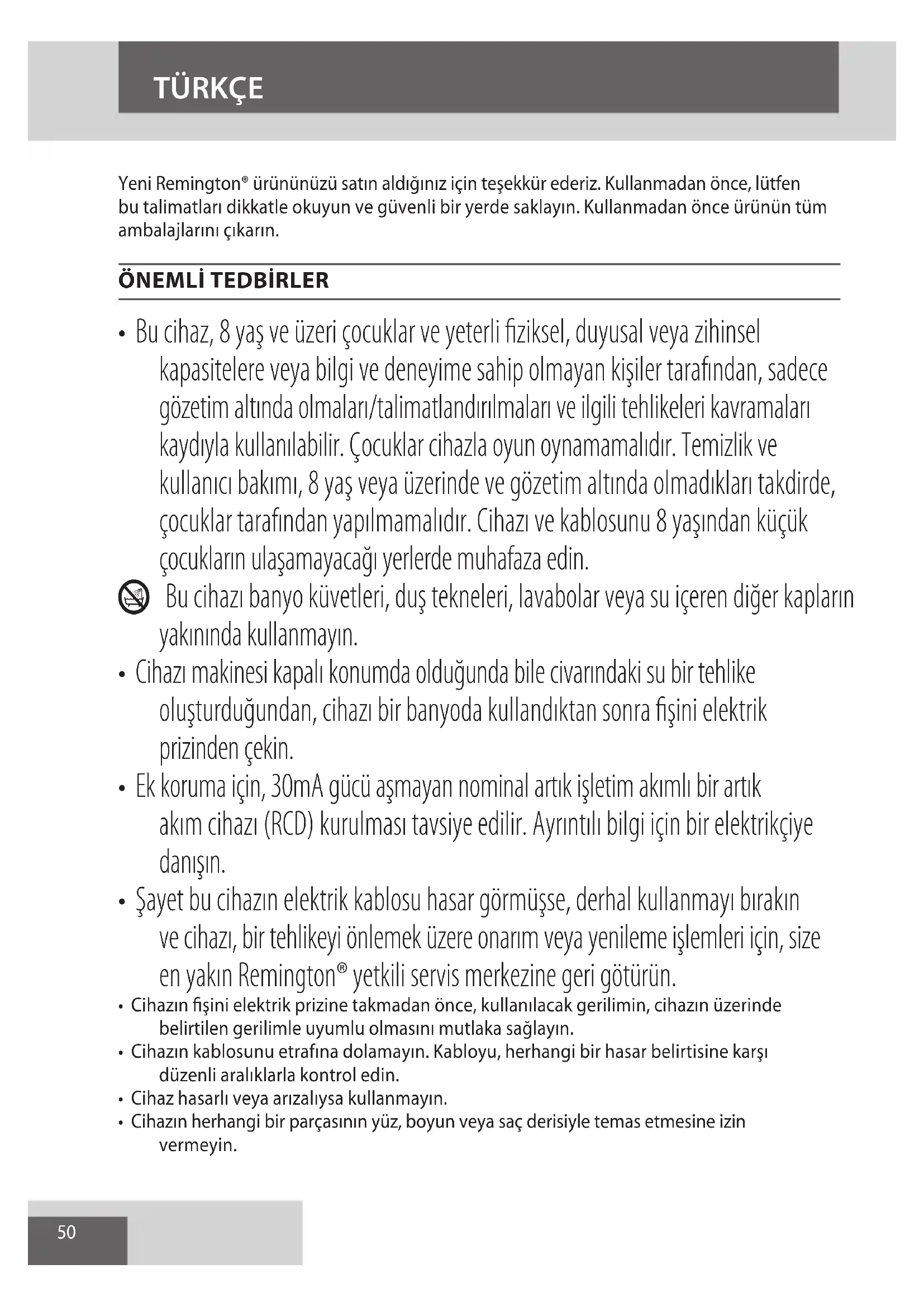 - Şayet bu cihazın elektrik kablosu hasar görmüşse, derhal kullanmayı bırakın ve cihazı, bir tehlikeyi önlemek üzere onarım veya yenileme işlemleri için, size en yakın Remington® yetkili servis merkezine geri götürün.