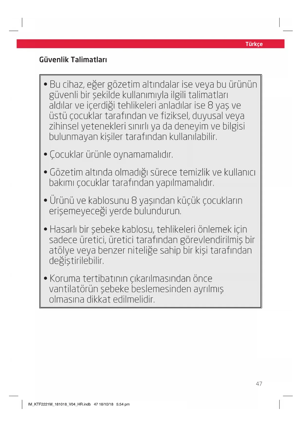 - Koruma tertibatının çıkarılmasından önce vantilatörün şebeke beslemesinden ayrılmış olmasına dikkat edilmelidir. IM_KTF2221M_181018_V04_HR.indb 47 18/10/18 5:54 pmTürkçe