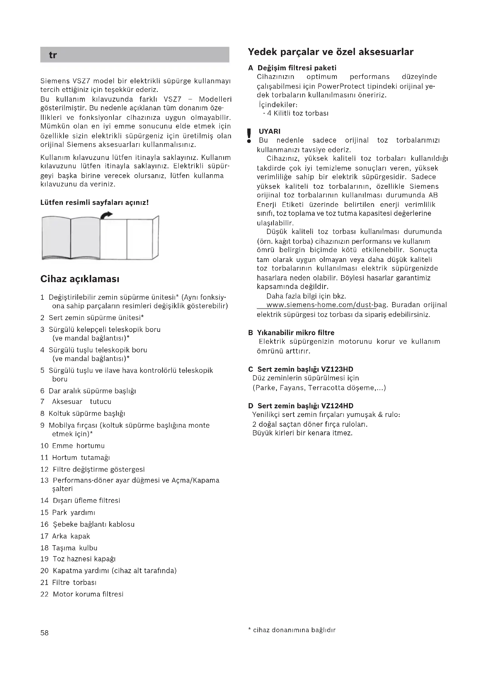 Siemens VSZ7 model bir elektrikli süpürge kullanmayı tercih ettiğiniz için teşekkür ederiz. Bu kullanım kılavuzunda farklı VSZ7 – Modelleri gösterilmiştir. Bu nedenle açıklanan tüm donanım öze- llikleri ve fonksiyonlar cihazınıza uygun olmayabilir. Mümkün olan en iyi emme sonucunu elde etmek için özellikle sizin elektrikli süpürgeniz için üretilmiş olan orijinal Siemens aksesuarları kullanmalısınız. Kullanım kılavuzunu lütfen itinayla saklayınız. Kullanım kılavuzunu lütfen itinayla saklayınız. Elektrikli süpür- geyi başka birine verecek olursanız, lütfen kullanma kılavuzunu da veriniz. Lütfen resimli sayfaları açınız! Cihaz açıklaması 1 Değiştirilebilir zemin süpürme ünitesiı* (Aynı fonksiy- ona sahip parçaların resimleri değişiklik gösterebilir) 2 Sert zemin süpürme ünitesi* 3 Sürgülü kelepçeli teleskopik boru (ve mandal bağlantısı)* 4 Sürgülü tuşlu teleskopik boru (ve mandal bağlantısı)* 5 Sürgülü tuşlu ve ilave hava kontrolörlü teleskopik boru 6 Dar aralık süpürme başlığı 7 Aksesuar tutucu 8 Koltuk süpürme başlığı 9 Mobilya fırçası (koltuk süpürme başlığına monte etmek için)* 10 Emme hortumu 11 Hortum tutamağı 12 Filtre değiştirme göstergesi 13 Performans-döner ayar düğmesi ve Açma/Kapama şalteri 14 Dışarı üfleme filtresi 15 Park yardımı 16 Şebeke bağlantı kablosu 17 Arka kapak 18 Taşıma kulbu 19 Toz haznesi kapağı 20 Kapatma yardımı (cihaz alt tarafında) 21 Filtre torbası 22 Motor koruma filtresi