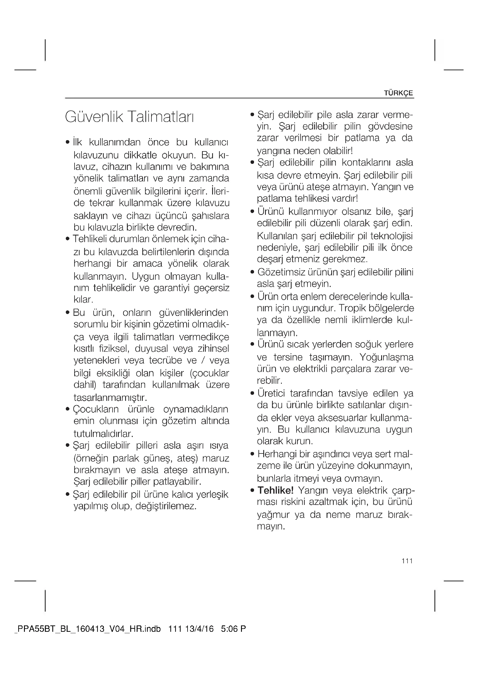 - Tehlike! Yangın veya elektrik çarp- ması riskini azaltmak için, bu ürünü yağmur ya da neme maruz bırak- mayın. IM_PPA55BT_BL_160413_V04_HR.indb 111 13/4/16 5:06 PMTÜRKÇE