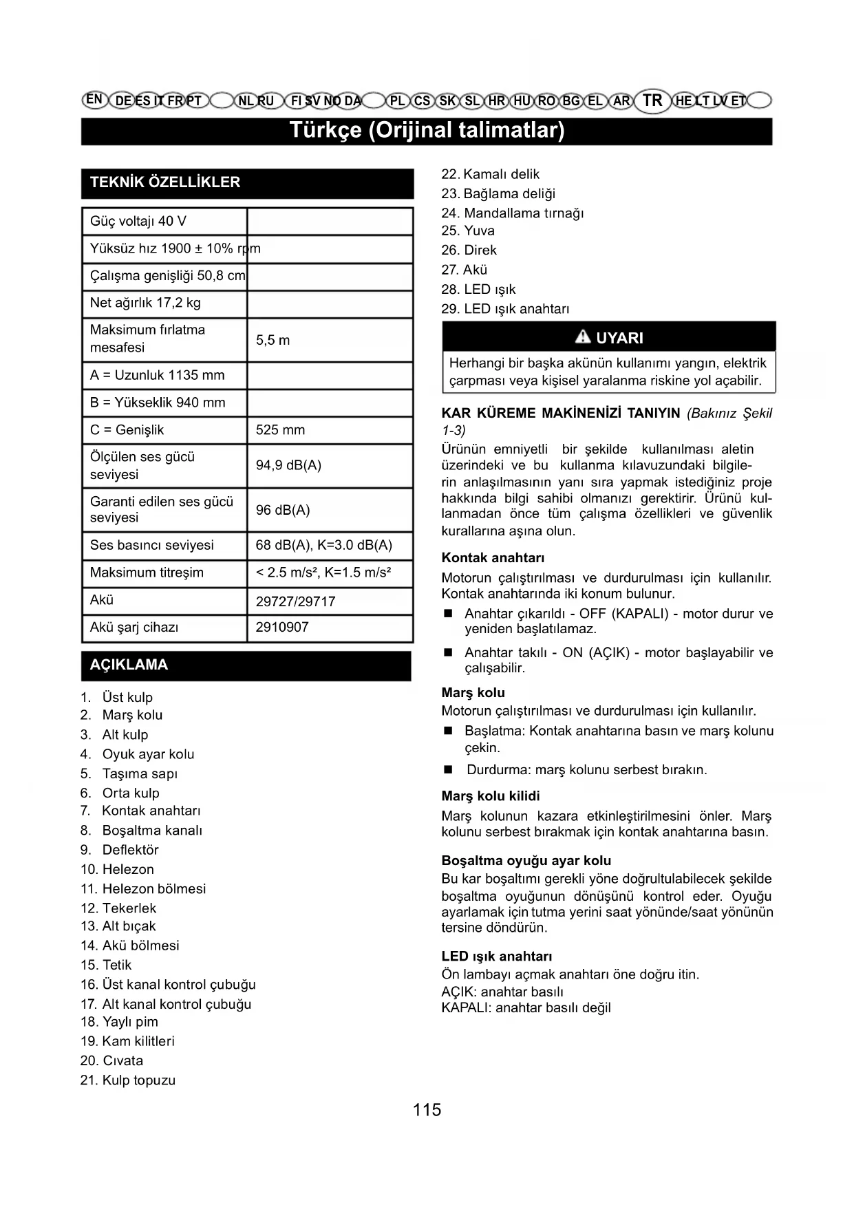 DE ES IT FR PTNL RUFI SV NO DA HE LT LV ETKuru ve normal kar20 cm yüksekliğe kadar olan kar eşit şekilde ilerleyerek hızlı bir şekilde kaldırılabilir. Daha derin ve birikmiş kar için hızı düşürün ve makinenin kendi ritminde çalışmasına izin verin.Islak veya kompakt karYavaşça ilerleyin. Kompakt kar ve buzu kaldırmak için alt bıçağı kullanmaktan kaçının.ÖNEMLİ: Makinenin ıslak veya kompakt karda yoğun kullanımı helezon bölmesinde arızalara sebep olabilir.ÇALIŞMADAN SONRA Hemen aküyü bölmesinden çıkarın. Makine üzerinde kalan karı bir fırça ile temizleyin. Tüm kontrolleri birkaç kez ileri ve geri hareket ettirin. Çalışma esnasında gevşemiş tüm cıvata ve somunları sıkın. Gevşek veya hasarlı parçalar bulunmadığından emin olun. Gerekirse hasarlı parçaları değiştirin. UYARI Motor halen sıcakken makineyi örtmeyin.Deflektör ayarı (Bakınız Şekil 10) Boşaltma kanalını ayarlamak için kanal ayar kulpunu karın püskürtülmesini istediğiniz yönde döndürün. Kanal deflektörünü (ve dolayısıyla kar püskürtme yüksekliğini) ayarlamak için tetiği sıkın ve kanal deflektörünü kaldırın veya indirin. BAKIM UYARI Tüm servis ve bakım kontrolleri motor kapalı halde sabit duran makinede yapılmalıdır. Herhangi bir bakım işleminden önce motoru kapatın ve anahtarı bölmeden çıkarın. UYARI Herhangi bir bakım yapmadan önce yeterli giysi, el-diven ve gözlük kullanılmalıdır. Orijinal olmayan yedek parça ve aksesuarların kullanılması makinenin çalışmasını ve güvenliğini olumsuz yönde etkileyebilir. Üretici bu gibi parçaların sebep olduğu yaralanmalar veya hasar durumunda tüm sorumluluğu reddeder. Orijinal parçalar yetkili servis atölyeleri ve bayiler tarafından tedarik edilir.ÖNEMLİ: Burada bahsi geçmeyen tüm bakım ve ayar işlemleri, satıcınız veya Yetkili Servis veya bayiniz tarafından yapılmalıdır.TEMİZLİK UYARI Temizlik işlemlerini makine kapalıyken yürütün. Önce aşağıdakileri yapmadan boşaltma oyuğundan karı çıkarmaya çalışmayın.• Helezon kontrolünü bırakma.• Kontak anahtarını çıkarma• Aküyü çıkarmaHer zaman kullanımdan sonra makineyi temizleyin.Makineyi temizlemek için aşağıda verilen talimatlara uyun: Motoru durdurun. Aküyü bölmesinden çıkarın. Kar küreme makinesini soğutun. Kar küreme makinesinin içini ve dışını yeterli bir fırça ve/veya basınçlı hava ile temizleyin. UYARI Asla kar küreme makinesini su ile yıkamayın, aksi halde elektrikli cihaz hasar görerek elektrik çarpması riskine neden olabilir.DEPOLAMA Makinenizi 30 günden daha uzun bir süre için depolamayı düşünüyorsanız: Kar küreme makinesini iyice temizleyin. Herhangi bir hasar olup olmadığını kontrol edin. Gerekirse, herhangi bir tamirin gerekli olup olmadığına bakın. Boyası zarar görmüşse, pas oluşmasını önlemek için rötuş yapın. Herhangi bir açıkta kalan metal yüzeyleri pasa karşı koruyun.YARDIM VE TAMİRBu kılavuz makineyi çalıştırmanız ve kullanıcı tarafından yapılabilecek doğru temel bakım işlemleri için gerekli tüm bilgileri içerir. Burada anlatılmayan düzenleme ve bakım çalışmaları, çalışmanın doğru şekilde, doğru emniyet seviyesi ve makinenin orijinal çalışma koşulları korunarak yapıldığını sağlamak için gerekli bilgi ve ekipmana sahip Bayi veya Yetkili Servis Merkezi tarafından yapılmalıdır. Yetkili olmayan merke-zler veya kişiler tarafından yapılan çalışmalar Garantiyi ve üreticinin tüm yükümlülük ve sorumluluklarını tama-men geçersiz kılacaktır.