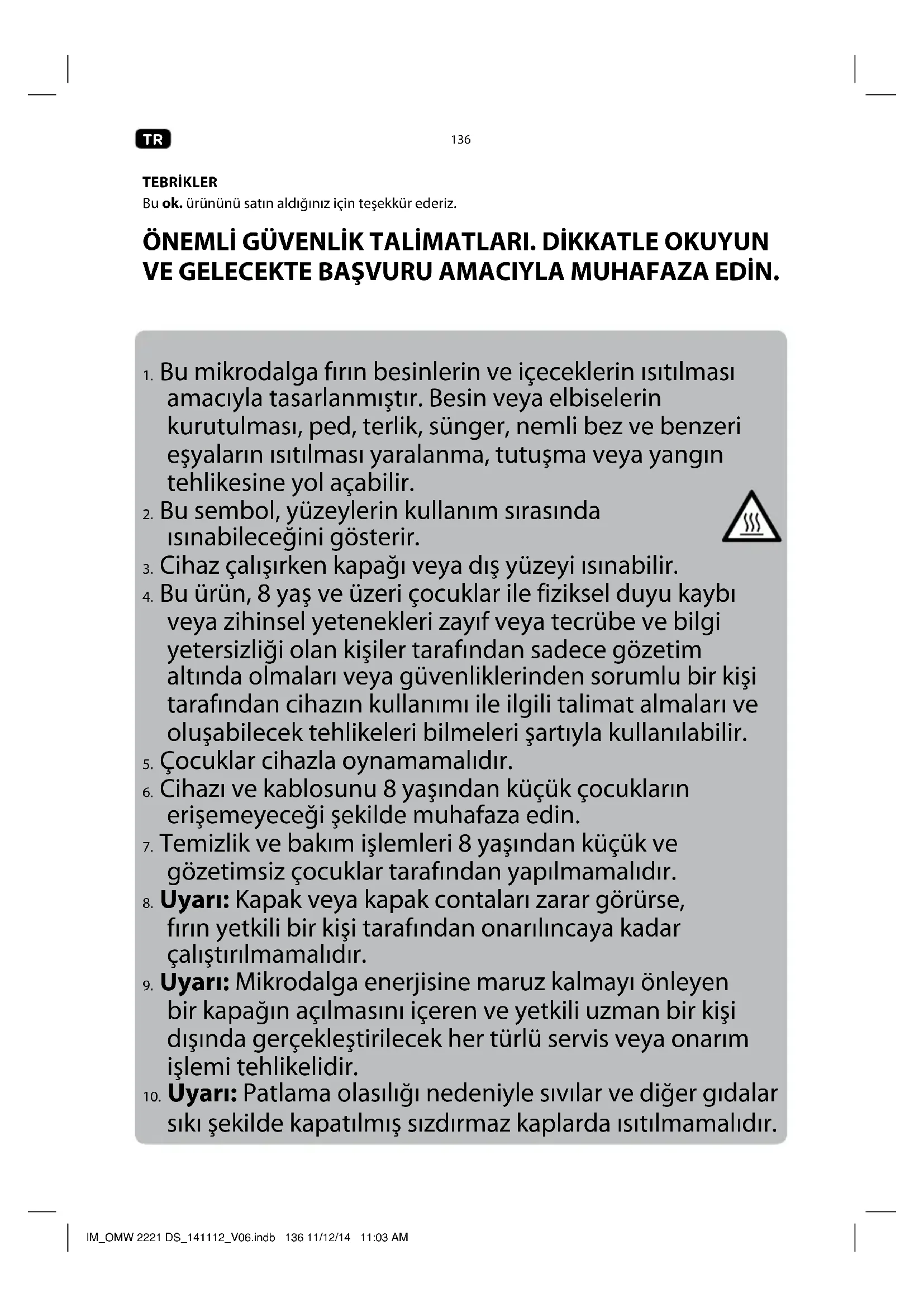 TEBRİKLER Bu ok. ürününü satın aldığınız için teşekkür ederiz. ÖNEMLİ GÜVENLİK TALİMATLARI. DİKKATLE OKUYUN VE GELECEKTE BAŞVURU AMACIYLA MUHAFAZA EDİN.
