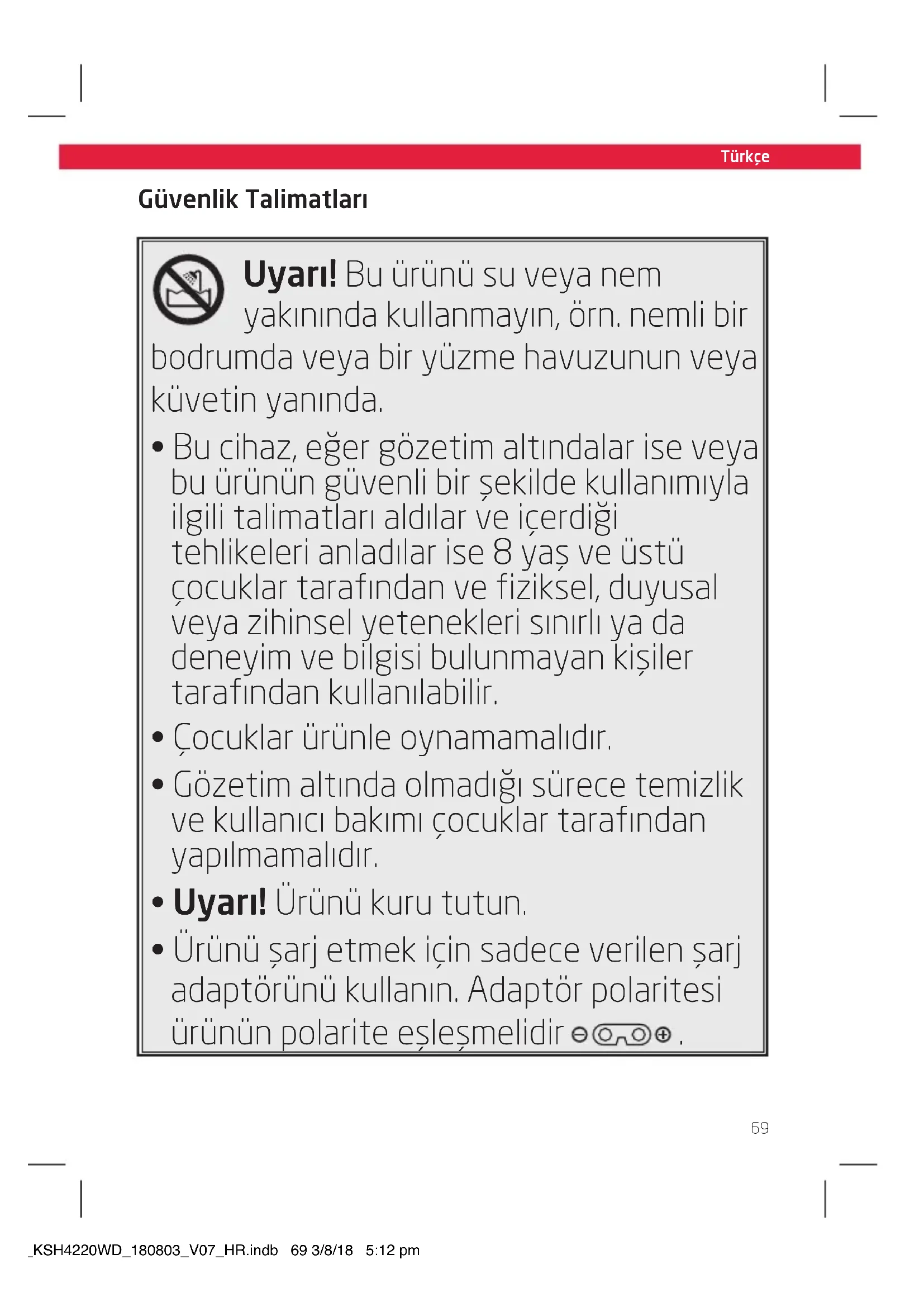 enligt beskrivning i kapitlet Rengöring och underhåll. IM_KSH4220WD_180803_V07_HR.indb 68 3/8/18 5:12 pm69 Türkçe Güvenlik Talimatları Uyarı! Bu ürünü su veya nem yakınında kullanmayın, örn. nemli bir bodrumda veya bir yüzme havuzunun veya küvetin yanında.