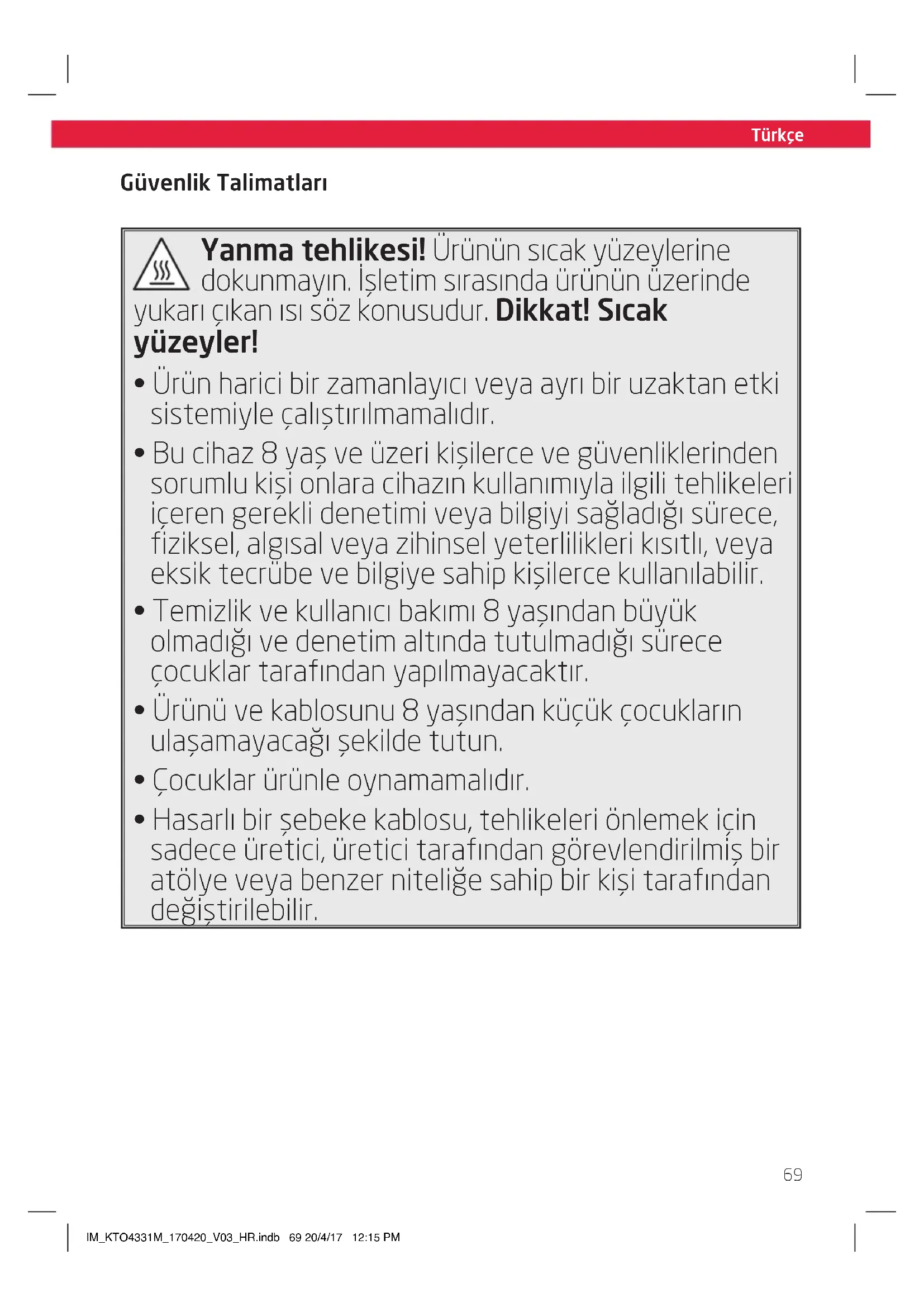 - Hasarlı bir şebeke kablosu, tehlikeleri önlemek için sadece üretici, üretici tarafından görevlendirilmiş bir atölye veya benzer niteliğe sahip bir kişi tarafından değiştirilebilir. IM_KTO4331M_170420_V03_HR.indb 69 20/4/17 12:15 PMTürkçe