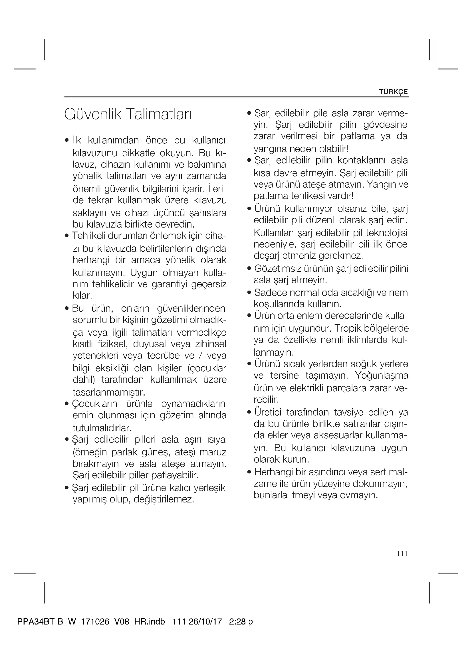 - Üründe hasar meydana gelirse ürü- nü kullanmaya devam etmeyin ve bir uzman tarafından onarılmasını sağ- layın veya müşteri servis departma- nımıza başvurun. Ürünü ayırmayın ve kendiniz onarmaya çalışmayın. IM_PPA34BT-B_W_171026_V08_HR.indb 112 26/10/17 2:28 pm113