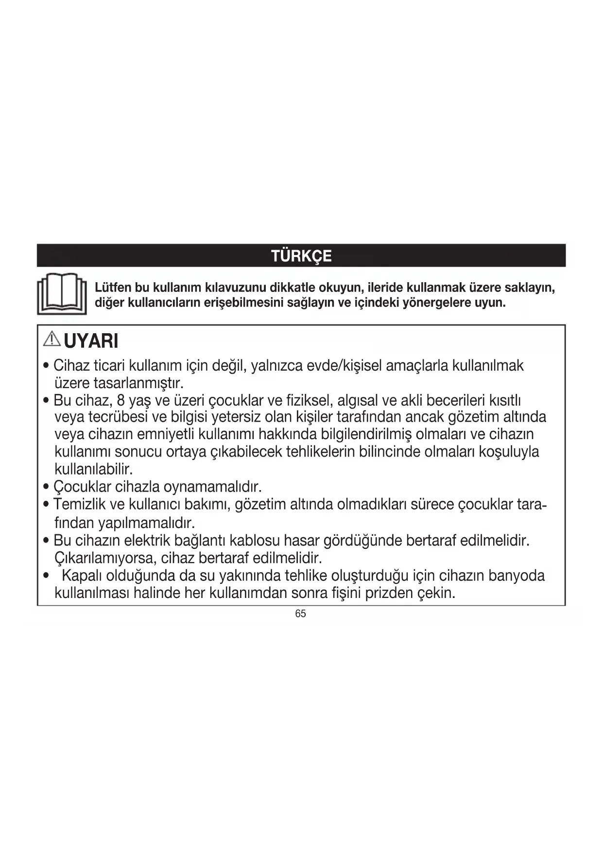 - Kapalı olduğunda da su yakınında tehlike oluşturduğu için cihazın banyoda kullanılması halinde her kullanımdan sonra fişini prizden çekin. Lütfen bu kullanım kılavuzunu dikkatle okuyun, ileride kullanmak üzere saklayın, diğer kullanıcıların erişebilmesini sağlayın ve içindeki yönergelere uyun.66
