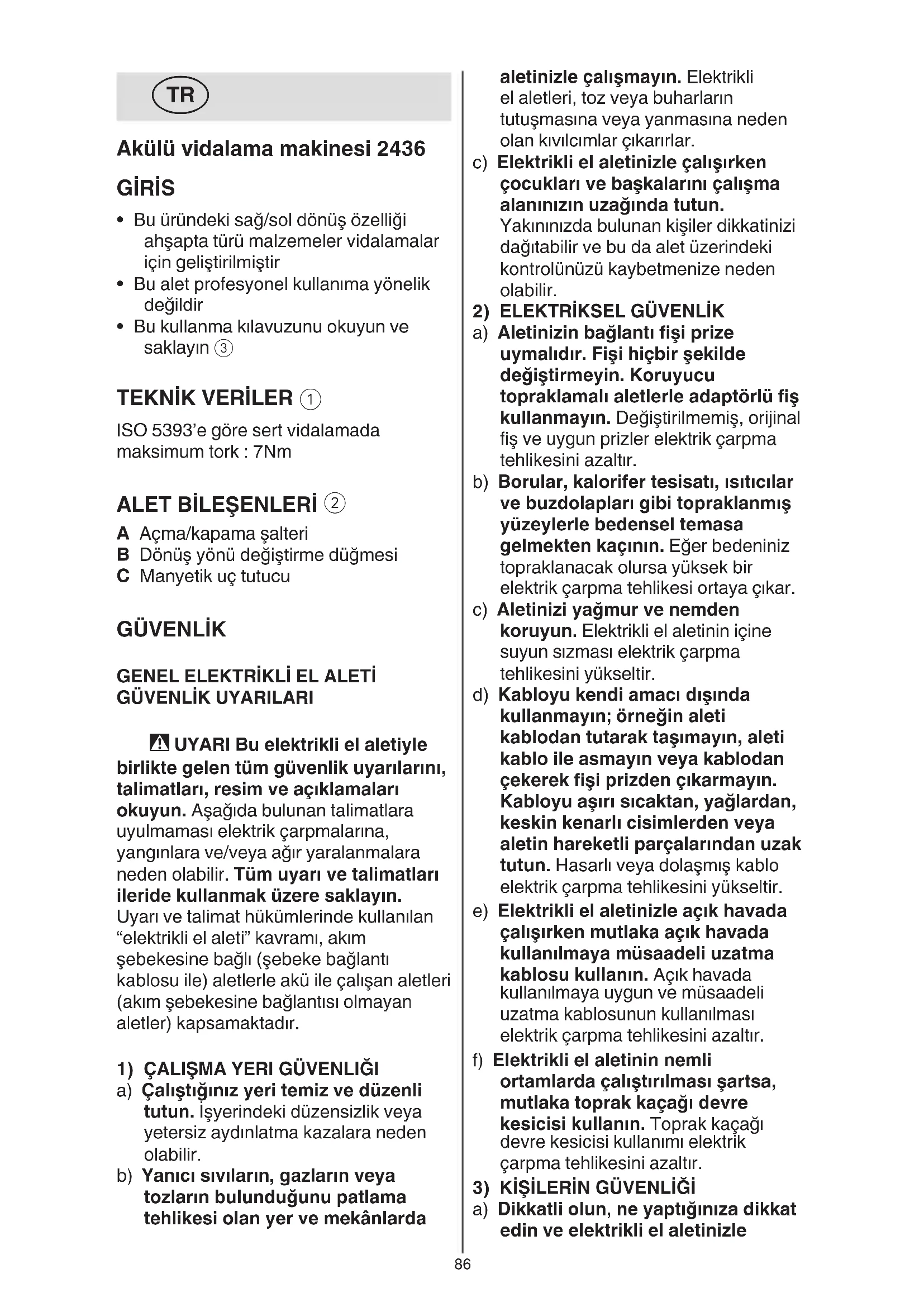 - UYARI Bu elektrikli el aletiyle birlikte gelen tüm güvenlik uyarılarını, talimatları, resim ve açıklamaları okuyun. Aşağıda bulunan talimatlara uyulmaması elektrik çarpmalarına, yangınlara ve/veya ağır yaralanmalara neden olabilir. Tüm uyarı ve talimatları ileride kullanmak üzere saklayın. Uyarı ve talimat hükümlerinde kullanılan “elektrikli el aleti” kavramı, akım şebekesine bağlı (şebeke bağlantı kablosu ile) aletlerle akü ile çalışan aletleri (akım şebekesine bağlantısı olmayan aletler) kapsamaktadır.