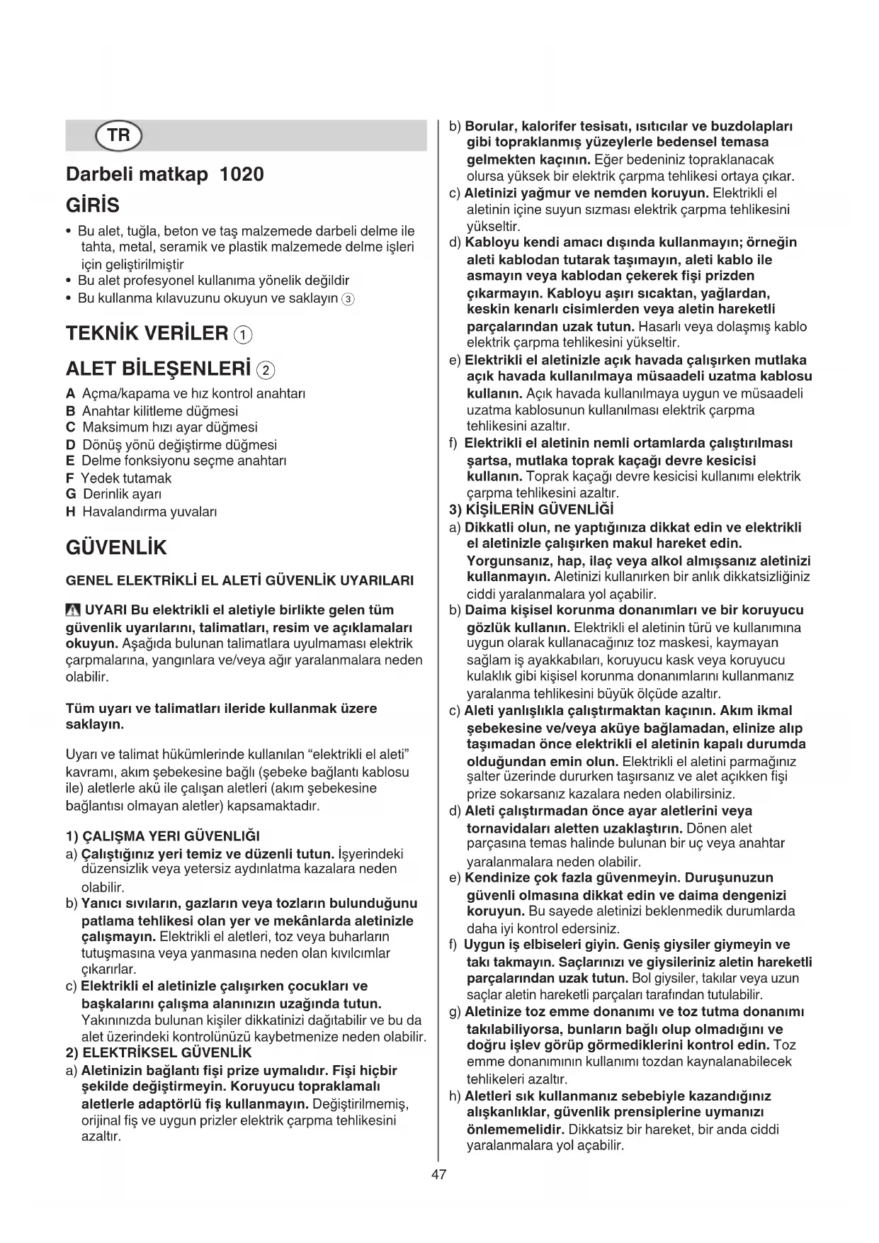 a) Aletinizi sadece uzman bir elemana ve orijinal yedek parçalar kullandırarak onartın. Böylelikle aletin güvenliğini korumuş olursunuz. DARBELI MATKAP İÇİN GÜVENLİK TALİMATI GENEL