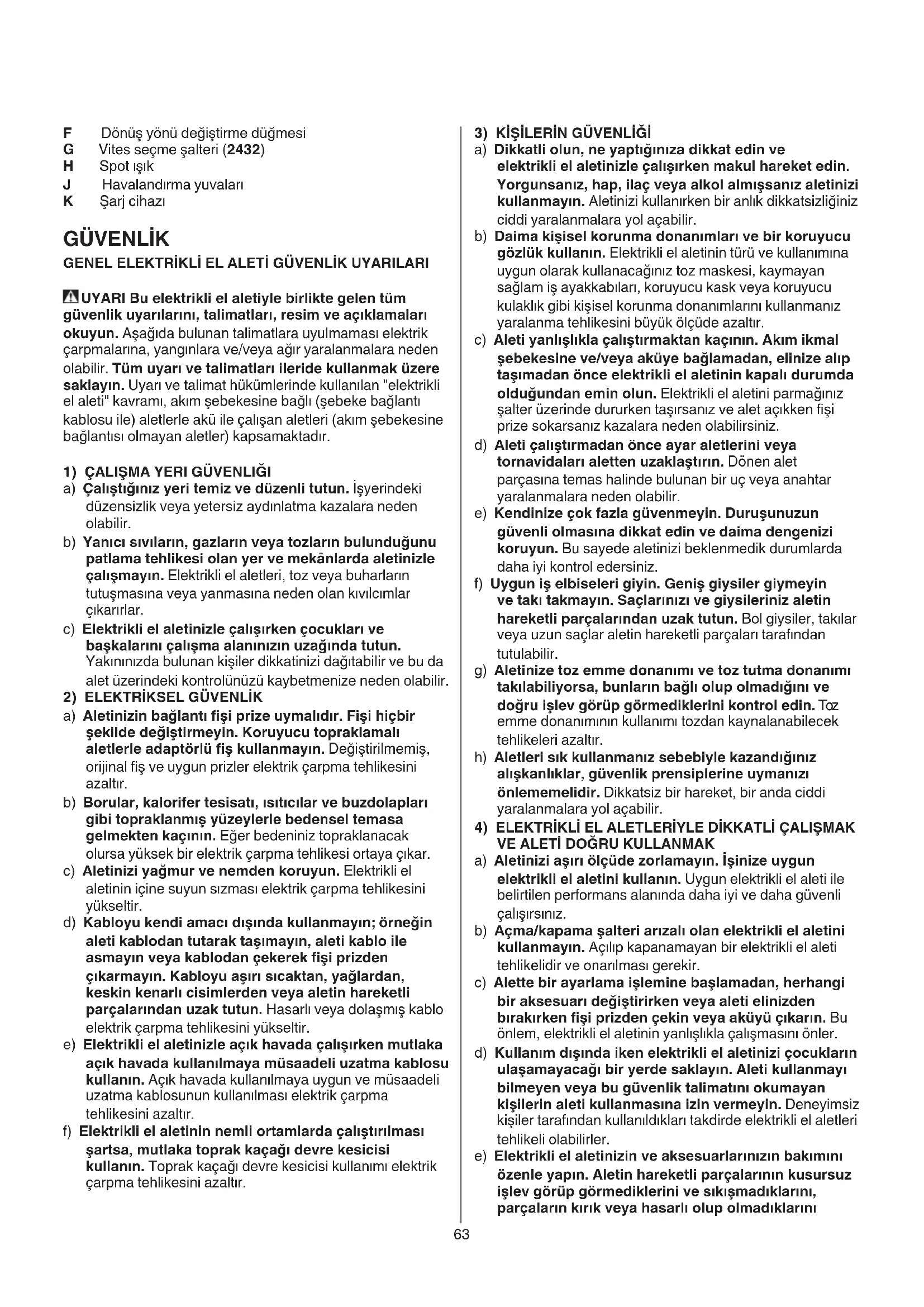 a) Aletinizi aşırı ölçüde zorlamayın. İşinize uygun elektrikli el aletini kullanın. Uygun elektrikli el aleti ile belirtilen performans alanında daha iyi ve daha güvenli çalışırsınız. b) Açma/kapama şalteri arızalı olan elektrikli el aletini kullanmayın. Açılıp kapanamayan bir elektrikli el aleti tehlikelidir ve onarılması gerekir. c) Alette bir ayarlama işlemine başlamadan, herhangi bir aksesuarı değiştirirken veya aleti elinizden bırakırken şi prizden çekin veya aküyü çıkarın. Bu önlem, elektrikli el aletinin yanlışlıkla çalışmasını önler. d) Kullanım dışında iken elektrikli el aletinizi çocukların ulaşamayacağı bir yerde saklayın. Aleti kullanmayı bilmeyen veya bu güvenlik talimatını okumayan kişilerin aleti kullanmasına izin vermeyin. Deneyimsiz kişiler tarafından kullanıldıkları takdirde elektrikli el aletleri tehlikeli olabilirler. e) Elektrikli el aletinizin ve aksesuarlarınızın bakımını özenle yapın. Aletin hareketli parçalarının kusursuz işlev görüp görmediklerini ve sıkışmadıklarını, parçaların kırık veya hasarlı olup olmadıklarını F Dönüş yönü değiştirme düğmesi G Vites seçme şalteri (2432) H Spot ışık J Havalandırma yuvaları K Şarj cihazı