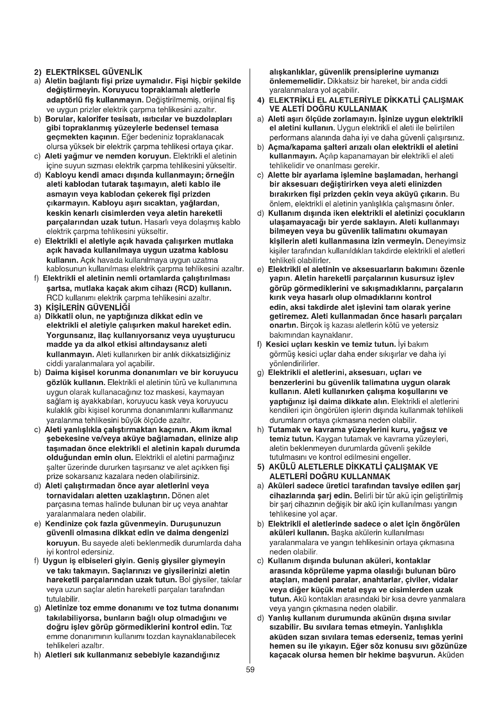 a) Aleti aşırı ölçüde zorlamayın. İşinize uygun elektrikli el aletini kullanın. Uygun elektrikli el aleti ile belirtilen performans alanında daha iyi ve daha güvenli çalışırsınız. b) Açma/kapama şalteri arızalı olan elektrikli el aletini kullanmayın. Açılıp kapanamayan bir elektrikli el aleti tehlikelidir ve onarılması gerekir. c) Alette bir ayarlama işlemine başlamadan, herhangi bir aksesuarı değiştirirken veya aleti elinizden bırakırken şi prizden çekin veya aküyü çıkarın. Bu önlem, elektrikli el aletinin yanlışlıkla çalışmasını önler. d) Kullanım dışında iken elektrikli el aletinizi çocukların ulaşamayacağı bir yerde saklayın. Aleti kullanmayı bilmeyen veya bu güvenlik talimatını okumayan kişilerin aleti kullanmasına izin vermeyin. Deneyimsiz kişiler tarafından kullanıldıkları takdirde elektrikli el aletleri tehlikeli olabilirler. e) Elektrikli el aletinin ve aksesuarların bakımını özenle yapın. Aletin hareketli parçalarının kusursuz işlev görüp görmediklerini ve sıkışmadıklarını, parçaların kırık veya hasarlı olup olmadıklarını kontrol edin, aksi takdirde alet işlevini tam olarak yerine getiremez. Aleti kullanmadan önce hasarlı parçaları onartın. Birçok iş kazası aletlerin kötü ve yetersiz bakımından kaynaklanır. f) Kesici uçları keskin ve temiz tutun. İyi bakım görmüş kesici uçlar daha ender sıkışırlar ve daha iyi yönlendirilirler. g) Elektrikli el aletlerini, aksesuarı, uçları ve benzerlerini bu güvenlik talimatına uygun olarak kullanın. Aleti kullanırken çalışma koşullarını ve yaptığınız işi daima dikkate alın. Elektrikli el aletlerini kendileri için öngörülen işlerin dışında kullanmak tehlikeli durumların ortaya çıkmasına neden olabilir. h) Tutamak ve kavrama yüzeylerini kuru, yağsız ve temiz tutun. Kaygan tutamak ve kavrama yüzeyleri, aletin beklenmeyen durumlarda güvenli şekilde tutulmasını ve kontrol edilmesini engeller.