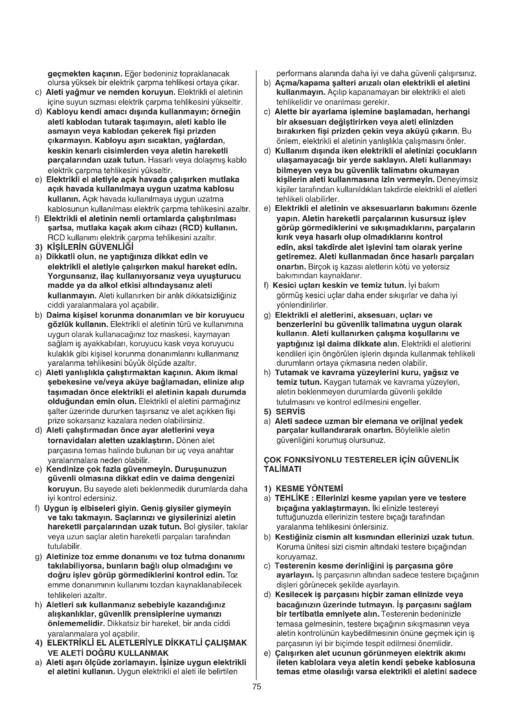 a) Aleti sadece uzman bir elemana ve orijinal yedek parçalar kullandırarak onartın. Böylelikle aletin güvenliğini korumuş olursunuz. ÇOK FONKSİYONLU TESTERELER İÇİN GÜVENLİK TALİMATI
