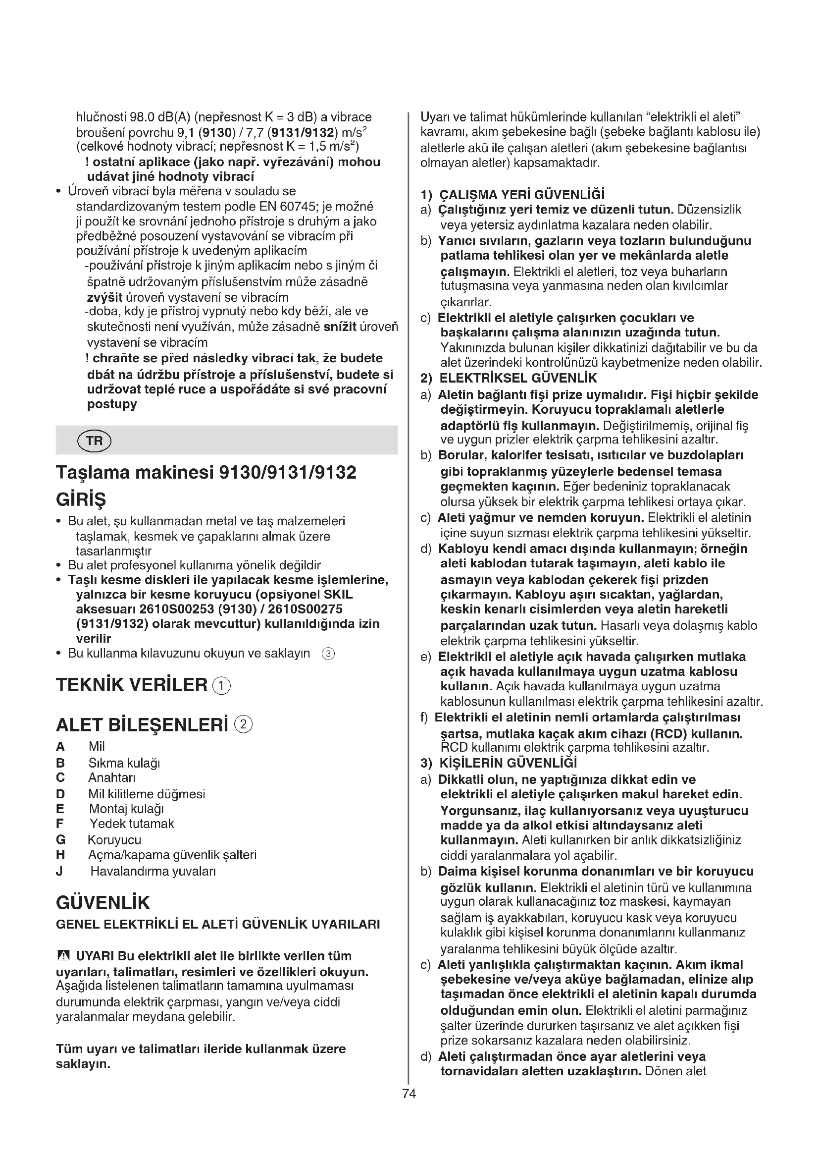 a) Dikkatli olun, ne yaptığınıza dikkat edin ve elektrikli el aletiyle çalışırken makul hareket edin. Yorgunsanız, ilaç kullanıyorsanız veya uyuşturucu madde ya da alkol etkisi altındaysanız aleti kullanmayın. Aleti kullanırken bir anlık dikkatsizliğiniz ciddi yaralanmalara yol açabilir. b) Daima kişisel korunma donanımları ve bir koruyucu gözlük kullanın. Elektrikli el aletinin türü ve kullanımına uygun olarak kullanacağınız toz maskesi, kaymayan sağlam iş ayakkabıları, koruyucu kask veya koruyucu kulaklık gibi kişisel korunma donanımlarını kullanmanız yaralanma tehlikesini büyük ölçüde azaltır. c) Aleti yanlışlıkla çalıştırmaktan kaçının. Akım ikmal şebekesine ve/veya aküye bağlamadan, elinize alıp taşımadan önce elektrikli el aletinin kapalı durumda olduğundan emin olun. Elektrikli el aletini parmağınız şalter üzerinde dururken taşırsanız ve alet açıkken şi prize sokarsanız kazalara neden olabilirsiniz. d) Aleti çalıştırmadan önce ayar aletlerini veya tornavidaları aletten uzaklaştırın. Dönen alet hlučnosti 98.0 dB(A) (nepřesnost K = 3 dB) a vibrace broušení povrchu 9,1 (9130) / 7,7 (9131/9132) m/s² (celkové hodnoty vibrací; nepřesnost K = 1,5 m/s²) ! ostatní aplikace (jako např. vyřezávání) mohou udávat jiné hodnoty vibrací