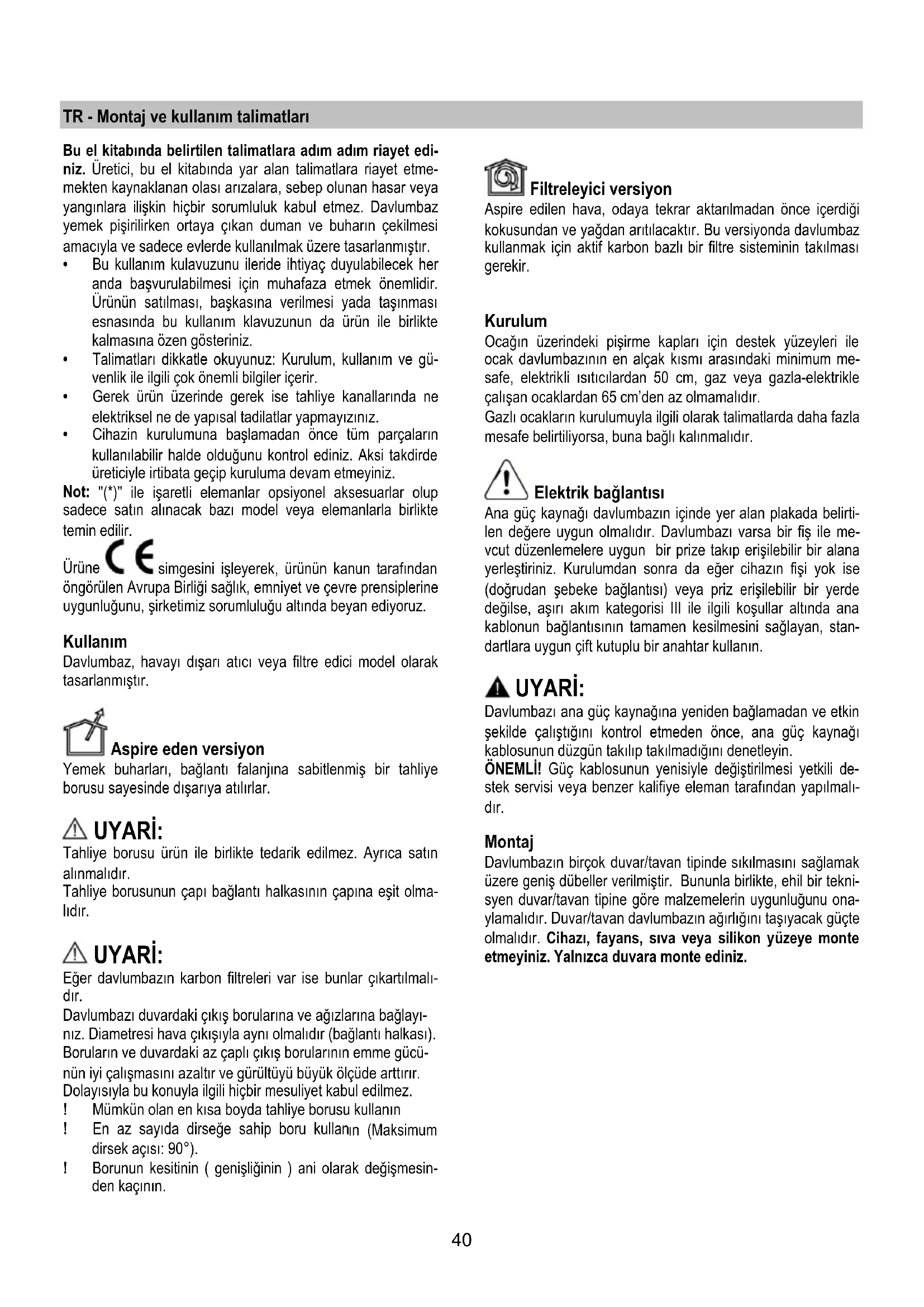- Cihazin kurulumuna başlamadan önce tüm parçaların kullanılabilir halde olduğunu kontrol ediniz. Aksi takdirde üreticiyle irtibata geçip kuruluma devam etmeyiniz. Not: "(*)" ile işaretli elemanlar opsiyonel aksesuarlar olup sadece satın alınacak bazı model veya elemanlarla birlikte temin edilir. Ürüne simgesini işleyerek, ürünün kanun tarafından öngörülen Avrupa Birliği sağlık, emniyet ve çevre prensiplerine uygunluğunu, şirketimiz sorumluluğu altında beyan ediyoruz. Kullanım Davlumbaz, havayı dışarı atıcı veya filtre edici model olarak tasarlanmıştır. Aspire eden versiyon Yemek buharları, bağlantı falanjına sabitlenmiş bir tahliye borusu sayesinde dışarıya atılırlar. UYARİ: Tahliye borusu ürün ile birlikte tedarik edilmez. Ayrıca satın alınmalıdır. Tahliye borusunun çapı bağlantı halkasının çapına eşit olma- lıdır. UYARİ: Eğer davlumbazın karbon filtreleri var ise bunlar çıkartılmalı- dır. Davlumbazı duvardaki çıkış borularına ve ağızlarına bağlayı- nız. Diametresi hava çıkışıyla aynı olmalıdır (bağlantı halkası). Boruların ve duvardaki az çaplı çıkış borularının emme gücü- nün iyi çalışmasını azaltır ve gürültüyü büyük ölçüde arttırır. Dolayısıyla bu konuyla ilgili hiçbir mesuliyet kabul edilmez. ! Mümkün olan en kısa boyda tahliye borusu kullanın ! En az sayıda dirseğe sahip boru kullan ın (Maksimum dirsek açısı: 90°). ! Borunun kesitinin ( genişliğinin ) ani olarak değişmesin- den kaçının. Filtreleyici versiyon Aspire edilen hava, odaya tekrar aktarılmadan önce içerdiği kokusundan ve yağdan arıtılacaktır. Bu versiyonda davlumbaz kullanmak için aktif karbon bazlı bir filtre sisteminin takılması gerekir.