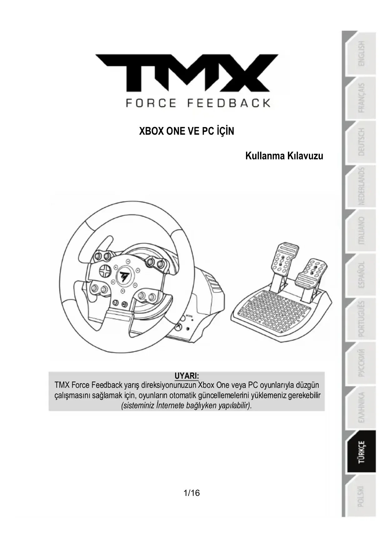 - TMX Force Feedback ile uyumlu Xbox One oyunlarının listesi şu adreste mevcuttur: http://support.thrustmaster.com (Racing Wheels / TMX Force Feedback’ye tıklayın). Bu liste düzenli olarak güncellenir.9/16
