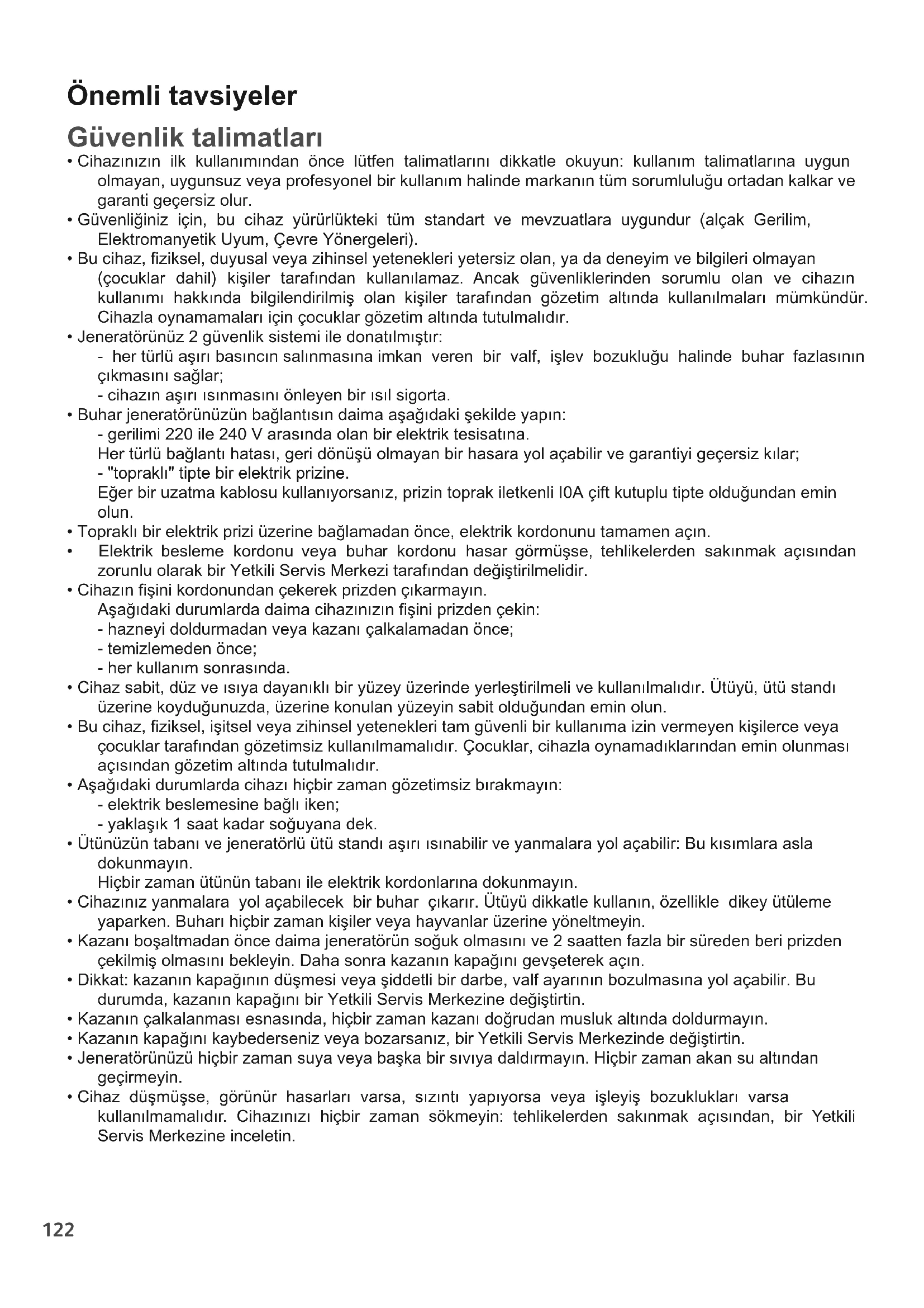 - Elektrik besleme kordonu veya buhar kordonu hasar görmüşse, tehlikelerden sakınmak açısından zorunlu olarak bir Yetkili Servis Merkezi tarafından değiştirilmelidir.