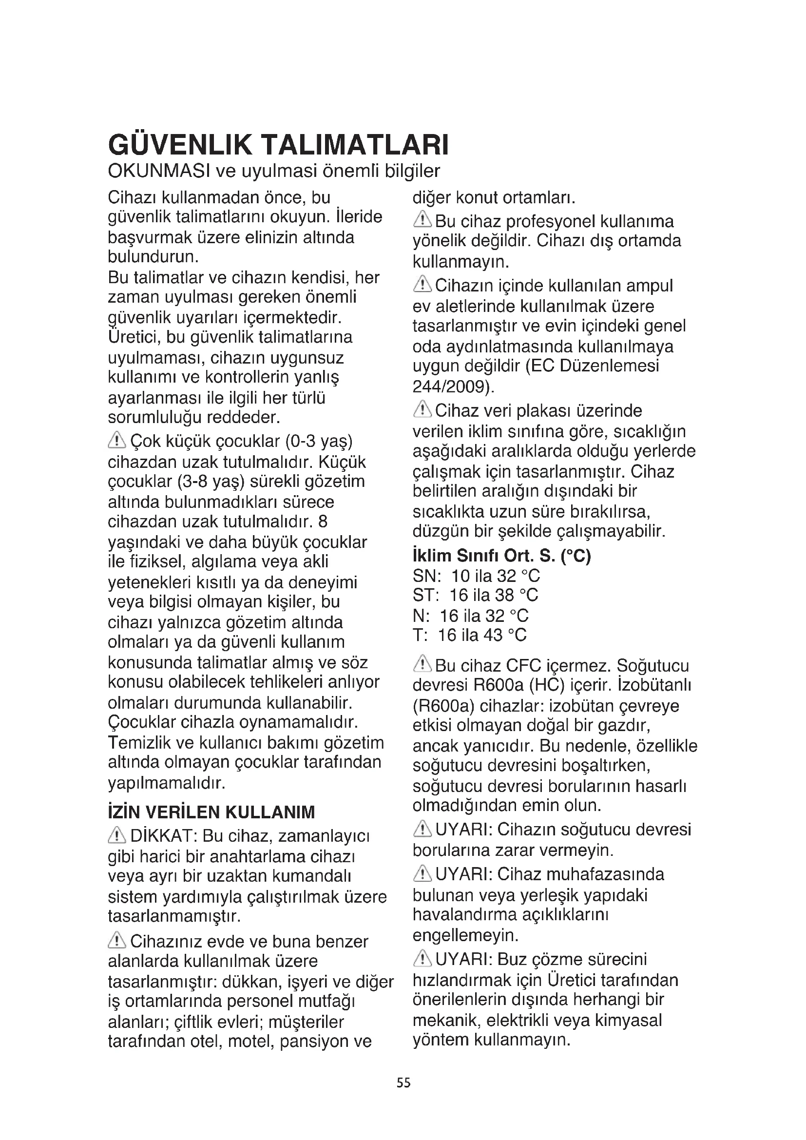 DİKKAT: Bu cihaz, zamanlayıcı gibi harici bir anahtarlama cihazı veya ayrı bir uzaktan kumandalı sistem yardımıyla çalıştırılmak üzere tasarlanmamıştır. Cihazınız evde ve buna benzer alanlarda kullanılmak üzere tasarlanmıştır: dükkan, işyeri ve diğer iş ortamlarında personel mutfağı alanları; çiftlik evleri; müşteriler tarafından otel, motel, pansiyon ve diğer konut ortamları. Bu cihaz profesyonel kullanıma yönelik değildir. Cihazı dış ortamda kullanmayın. Cihazın içinde kullanılan ampul ev aletlerinde kullanılmak üzere tasarlanmıştır ve evin içindeki genel oda aydınlatmasında kullanılmaya uygun değildir (EC Düzenlemesi 244/2009). Cihaz veri plakası üzerinde verilen iklim sınıfına göre, sıcaklığın aşağıdaki aralıklarda olduğu yerlerde çalışmak için tasarlanmıştır. Cihaz belirtilen aralığın dışındaki bir sıcaklıkta uzun süre bırakılırsa, düzgün bir şekilde çalışmayabilir. İklim Sınıfı Ort. S. (°C) SN: 10 ila 32 °C ST: 16 ila 38 °C N: 16 ila 32 °C T: 16 ila 43 °C Bu cihaz CFC içermez. Soğutucu devresi R600a (HC) içerir. İzobütanlı (R600a) cihazlar: izobütan çevreye etkisi olmayan doğal bir gazdır, ancak yanıcıdır. Bu nedenle, özellikle soğutucu devresini boşaltırken, soğutucu devresi borularının hasarlı olmadığından emin olun. UYARI: Cihazın soğutucu devresi borularına zarar vermeyin. UYARI: Cihaz muhafazasında bulunan veya yerleşik yapıdaki havalandırma açıklıklarını engellemeyin. UYARI: Buz çözme sürecini hızlandırmak için Üretici tarafından önerilenlerin dışında herhangi bir mekanik, elektrikli veya kimyasal yöntem kullanmayın.56 UYARI: Üretici tarafından açıkça onay izin verilen tipte değillerse, cihaz bölmelerinin içinde elektrikli cihazlar kullanmayın veya cihaz içine yerleştirmeyin. UYARI: direk olarak su tesisatına bağlı olmayan buz ve/veya su üreteçleri, sadece içilebilir su ile doldurulmalıdır. UYARI: Otomatik buz yapıcılar ve/veya su dağıtıcılar, sadece şebeke su basıncı 0,17 ve 0,81 MPa (1,7 ve 8,1 bar) arasında olan ve içme suyu veren bir su şebekesine bağlanmalıdır. Bu cihazın içinde, yanıcı maddeler barındıran aerosol sprey kutuları gibi patlayıcı maddeler saklamayın. Buz paketlerinin (bazı modellerle verilir) içindeki maddeleri (toksik olmayan) yutmayın. Soğuk yanıklarına neden olabileceğinden, buz küplerini veya buzlu şekerleri dondurucudan çıkardıktan hemen sonra yemeyin. Erişilebilir bir fan kapağı içerisinde hava ltresi kullanılacak şekilde tasarlanmış ürünler için; buzdolabı çalışırken ltre daima yerinde olmalıdır. Kırılabileceği için, içi sıvı dolu cam kapları dondurucu bölmesinin içinde saklamayın. Fanı (dahil edilmişse) gıdalarla kapatmayın. Gıdaları yerleştirdikten sonra, bölme kapaklarının, özellikle dondurucu kapağının doğru şekilde kapandığını kontrol edin. Hasarlı contalar mümkün olan en kısa zamanda değiştirilmelidir. Buz dolabı bölmesini sadece taze gıdaları saklamak ve dondurucu, bölmesini sadece donmuş gıdaları saklamak, taze gıdaları dondurmak ve buz küpleri yapmak için kullanın. Paketlenmemiş gıdaları doğrudan buz dolabı veya dondurucu bölmelerinin iç yüzeyleri ile temas edecek şekilde saklamaktan kaçının. Cihazlarda özel bölmeler olabilir (Taze Gıda Bölmesi, Sıfır Derece Kutusu, vs.). İlgili ürün kitapçığında aksi belirtilmemiş ise, bunlar çıkarılabilir ve eşdeğer performans korunabilir. Yalıtım köpüğünde, üeme maddesi olarak C-Pentan kullanılmıştır; bu, yanıcı bir gazdır. MONTAJ Cihaz, iki veya daha fazla kişi ile kaldırılmalı ve monte edilmelidir - yaralanma riski. Paketi açmak ve kurulumu gerçekleştirmek için koruyucu eldivenler kullanın - kesilme riski. Su beslemesi (varsa) ve elektrik bağlantıları dahil montaj ve onarım işlemleri nitelikli bir teknisyen tarafından gerçekleştirilmelidir. Kullanıcı kılavuzunda özellikle belirtilmediği sürece, bu cihazın hiçbir parçasını onarmayın veya değiştirmeyin. Çocukları kurulumun yapıldığı alandan uzak tutun. Cihazın ambalajını açtıktan sonra, cihazın nakliye sırasında TR hasar görmemiş olduğundan emin olun. Eğer bir sorun varsa, cihazı satın aldığınız yeri veya en yakın servisi arayın. Kurulum tamamlandığında, ambalaj atıkları (plastik, yapay köpük parçalar vs.) çocukların ulaşamayacağı yerlerde depolanmalıdır - boğulma riski. Herhangi bir montaj işleminden önce, cihazın şi elektrik prizinden çekilmelidir - elektrik çarpması riski. Montaj işlemi esnasında, cihazın elektrik kablosuna hasar57 vermemesine dikkat edin - yangın veya elektrik çarpması riski. Cihazı, ancak montaj tamamlandıktan sonra etkinleştirin. Cihazı taşırken zemine zarar vermemeye dikkat edin (örn. parkeler). Cihazı, zemin üzerine kurun veya ebat ve kullanım amacına uygun bir yerde ve ağırlığını taşıyacak sağlamlıkta destekleyin. Cihazın bir ısı kaynağının yakınında olmadığından ve dört ayağının da sabit ve yerle temas ettiğinden emin olun, bunları gerektiği şekilde ayarlayın ve bir su terazisi kullanarak cihazın mükemmel bir şekilde düz olduğunu kontrol edin. Cihazın soğutucu devresinin tam olarak etkin hale gelmesini sağlamak için, cihazı çalıştırmadan önce en az iki saat bekleyin. UYARI: Dengesizlik yüzünden oluşacak bir tehlikeden kaçınmak için; cihazın yerleştirilmesi veya sabitlenmesi, üretici talimatlarına göre gerçekleştirilmelidir. Buzdolabının, gazlı ocağın metal hortumu, metal gaz veya su boruları ya da elektrik kabloları buzdolabının arka duvarı (kondansatör bobini) ile temas edecek şekilde yerleştirilmesi yasaktır. Cihazın montajı için gereken tüm boyutlar ve aralıklar, Montaj talimatları kitapçığında belirtilmiştir.
