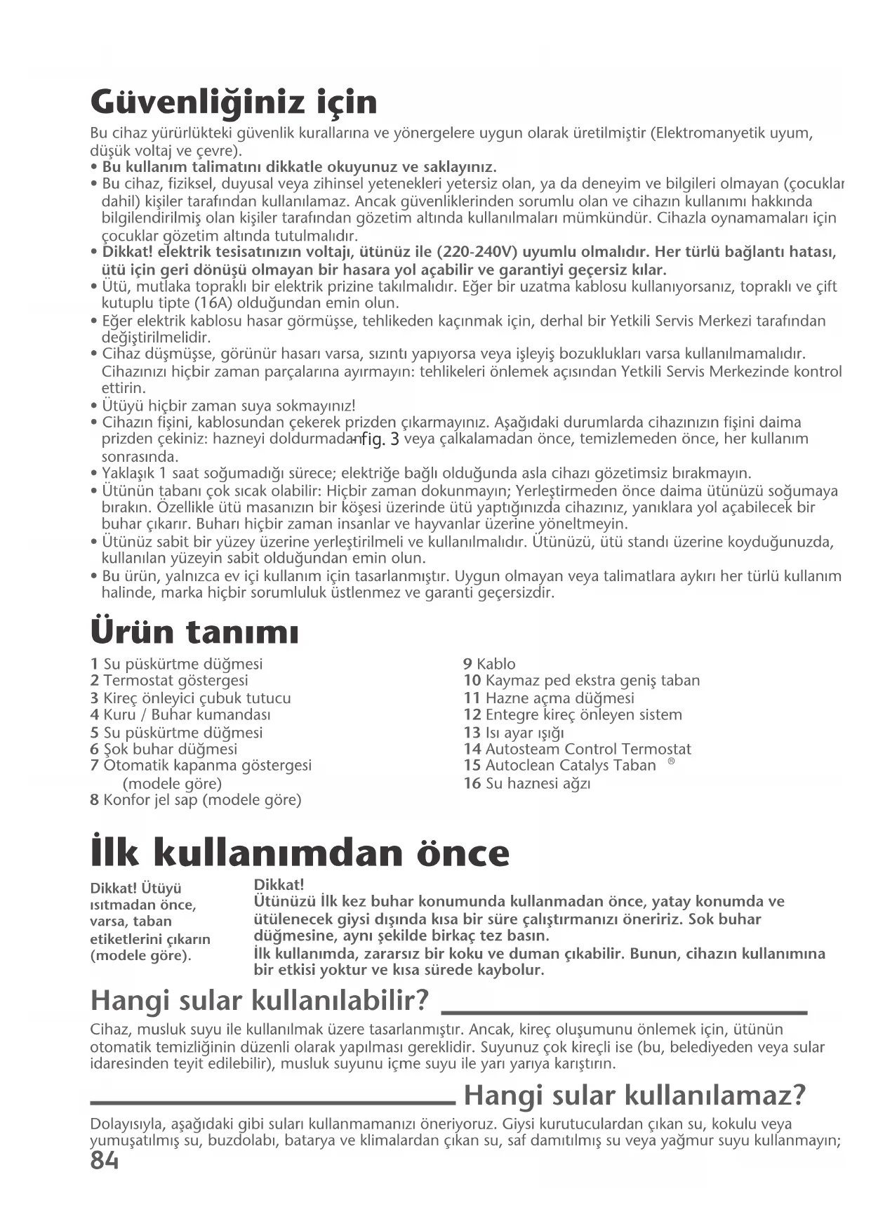 W przypadku wystàpienia innego problemu, nale˝y zg∏osiç si´ do autoryzowanego serwisu w celu sprawdzenia ˝elazka.Problemy Mo˝liwe przyczyny Rozwiàzania• Woda wyp∏ywa przez otwory wstopie.• Przycisk uderzenia pary jest zbyt cz´stou˝ywany.• ˚elazko jest ustawione w pozycjipoziomej, pojemnik nie jestopró˝niony, a regulator pary nie jestustawiony w pozycji SEC.• Poczekaç kilka sekund przedka˝dorazowym u˝yciem.• Patrz cz´Êç "Przechowywanie˝elazka".• Brunatne zacieki wydobywajàsi´ ze stopy i zanieczyszczajàbielizn´.• U˝ywane sà chemiczne Êrodki dousuwania kamienia.• U˝ywana woda jest nieprawid∏owa.• Nie dodawaç do wody w pojemniku˝adnego Êrodka do usuwaniakamienia.• Patrz rozdzia∏ "jakiej wody nale˝yunikaç?".• Stopa jest brudna i mo˝ezanieczyÊciç bielizn´.• Prasowano przy u˝yciunieodpowiedniego programu(temperatura za wysoka).• Bielizna nie jest odpowiednio p∏ukanalub u˝ywany jest krochmal.• Wybraç odpowiedni program. Patrzrozdzia∏ « Czyszczenie stopy ».• Rozpyliç krochmal po drugiej stronieni˝ ta przeznaczona do prasowania.• ˚elazko nie wytwarza pary lubwytwarzana iloÊç jest zbyt ma∏a.• Pojemnik na wod´ jest pusty.• Sztyft anty-wapienny jestzanieczyszczony.• ˚elazko jest zanieczyszczone osadem zkamienia.• ˚elazko by∏o zbyt d∏ugo u˝ywane wpozycji prasowania na sucho.• Nape∏niç go wodà z kranu.• OczyÊciç sztyft antywapienny• OczyÊciç sztyft antywapienny iuruchomiç system samooczyszczania.• W∏àczyç system samooczyszczania.• Stopa jest porysowana lubzniszczona.• ˚elazko by∏o ustawione na metalowejpodstawce.• Czyszczono przy u˝yciu szorstkiego lubmetalowego zmywaka.• Umieszczaç zawsze ˝elazko w pozycjipionowej. • Patrz rozdzia∏ « Czyszczenie stopy ».• Woda cieknie z klapkizbiorniczka.• Klapka zbiorniczka zosta∏a êledomkni´ta.• Sprawdziç, czy klapka zbiorniczka jestdobrze zamkni´ta (a˝ do us∏yszeniaklikni´cia).• Z ˝elazka wydobywa si´ parapod koniec nape∏nianiapojemnika.• Regulator pary nie jest ustawiony wpozycji SEC .• Sprawdziç, czy regulator pary jestustawiony w pozycji SEC .• Nie dzia∏a funkcja spray i/lubsuperpressing.• Pojemnik na wod´ jest pusty. • Nape∏niç pojemnik wodà.• Z przodu ˝elazka wyciekawoda.• Podczas nape∏niania zbiorniczkaprzekroczono poziom MAX.• Wylaç nadmiar ze zbiorniczka. UltimateAutoclean-1800113015-110x154:Mise en page 1 23/07/08 9:18 Page 8384 1 Su püskürtme dü¤mesi2 Termostat göstergesi3 Kireç önleyici çubuk tutucu4 Kuru / Buhar kumandas›5 Su püskürtme dü¤mesi6 fiok buhar dü¤mesi7 Otomatik kapanma göstergesi (modele göre)8 Konfor jel sap (modele göre)9 Kablo10 Kaymaz ped ekstra genifl taban11 Hazne açma dü¤mesi12 Entegre kireç önleyen sistem13 Is› ayar ›fl›¤›14 Autosteam Control Termostat15 Autoclean Catalys Taban 16 Su haznesi a¤z› ‹lk kullan›mdan önce Dikkat!Ütünüzü ‹lk kez buhar konumunda kullanmadan önce, yatay konumda veütülenecek giysi d›fl›nda k›sa bir süre çal›flt›rman›z› öneririz. Sok buhardü¤mesine, ayn› flekilde birkaç tez bas›n.‹lk kullan›mda, zarars›z bir koku ve duman ç›kabilir. Bunun, cihaz›n kullan›m›nabir etkisi yoktur ve k›sa sürede kaybolur. Hangi sular kullan›labilir? Cihaz, musluk suyu ile kullan›lmak üzere tasarlanm›flt›r. Ancak, kireç oluflumunu önlemek için, ütününotomatik temizli¤inin düzenli olarak yap›lmas› gereklidir. Suyunuz çok kireçli ise (bu, belediyeden veya sularidaresinden teyit edilebilir), musluk suyunu içme suyu ile yar› yar›ya kar›flt›r›n. Hangi sular kullan›lamaz? Dolay›s›yla, afla¤›daki gibi sular› kullanmaman›z› öneriyoruz. Giysi kurutuculardan ç›kan su, kokulu veyayumuflat›lm›fl su, buzdolab›, batarya ve klimalardan ç›kan su, saf dam›t›lm›fl su veya ya¤mur suyu kullanmay›n;Dikkat! Ütüyü›s›tmadan önce,varsa, tabanetiketlerini ç›kar›n(modele göre). Güvenli¤iniz için Bu cihaz yürürlükteki güvenlik kurallar›na ve yönergelere uygun olarak üretilmifltir (Elektromanyetik uyum,düflük voltaj ve çevre).• Bu kullan›m talimat›n› dikkatle okuyunuz ve saklay›n›z.• Bu cihaz, fiziksel, duyusal veya zihinsel yetenekleri yetersiz olan, ya da deneyim ve bilgileri olmayan (çocuklardahil) kifliler taraf›ndan kullan›lamaz. Ancak güvenliklerinden sorumlu olan ve cihaz›n kullan›m› hakk›ndabilgilendirilmifl olan kifliler taraf›ndan gözetim alt›nda kullan›lmalar› mümkündür. Cihazla oynamamalar› içinçocuklar gözetim alt›nda tutulmal›d›r.• Dikkat! elektrik tesisat›n›z›n voltaj›, ütünüz ile (220-240V) uyumlu olmal›d›r. Her türlü ba¤lant› hatas›,ütü için geri dönüflü olmayan bir hasara yol açabilir ve garantiyi geçersiz k›lar.• Ütü, mutlaka toprakl› bir elektrik prizine tak›lmal›d›r. E¤er bir uzatma kablosu kullan›yorsan›z, toprakl› ve çiftkutuplu tipte (16A) oldu¤undan emin olun.• E¤er elektrik kablosu hasar görmüflse, tehlikeden kaç›nmak için, derhal bir Yetkili Servis Merkezi taraf›ndande¤ifltirilmelidir.• Cihaz düflmüflse, görünür hasar› varsa, s›z›nt› yap›yorsa veya iflleyifl bozukluklar› varsa kullan›lmamal›d›r.Cihaz›n›z› hiçbir zaman parçalar›na ay›rmay›n: tehlikeleri önlemek aç›s›ndan Yetkili Servis Merkezinde kontrolettirin.• Ütüyü hiçbir zaman suya sokmay›n›z!• Cihaz›n fiflini, kablosundan çekerek prizden ç›karmay›n›z. Afla¤›daki durumlarda cihaz›n›z›n fiflini daimaprizden çekiniz: hazneyi doldurmadan - fig. 3veya çalkalamadan önce, temizlemeden önce, her kullan›msonras›nda.• Yaklafl›k 1 saat so¤umad›¤› sürece; elektri¤e ba¤l› oldu¤unda asla cihaz› gözetimsiz b›rakmay›n.• Ütünün taban› çok s›cak olabilir: Hiçbir zaman dokunmay›n; Y