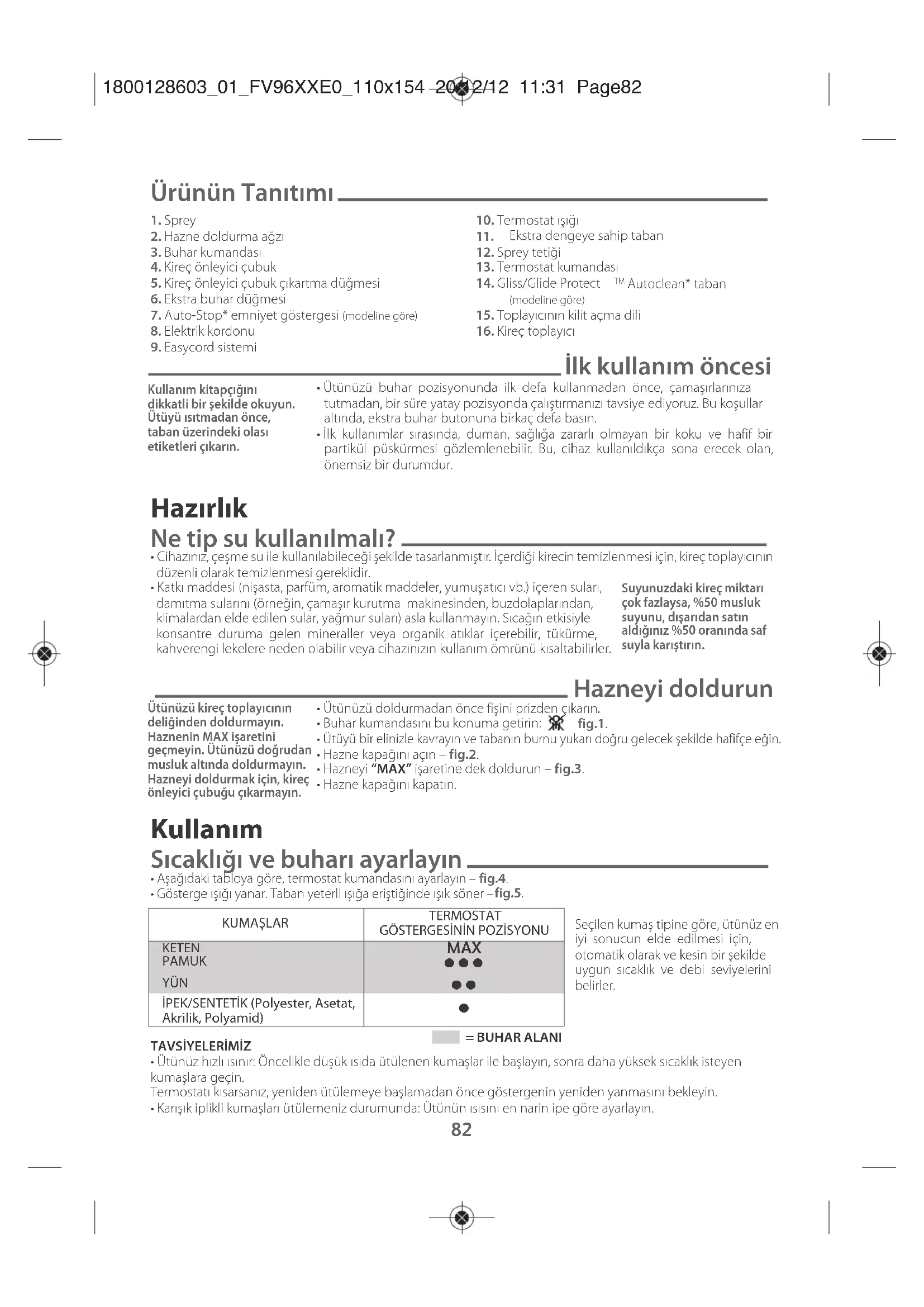 - Karışık iplikli kumaşları ütülemeniz durumunda: Ütünün ısısını en narin ipe göre ayarlayın. Kullanım kitapçığını dikkatli bir şekilde okuyun. Ütüyü ısıtmadan önce, taban üzerindeki olası etiketleri çıkarın. Ütünüzü kireç toplayıcının deliğinden doldurmayın. Haznenin MAX işaretini geçmeyin. Ütünüzü doğrudan musluk altında doldurmayın. Hazneyi doldurmak için, kireç önleyici çubuğu çıkarmayın. Suyunuzdaki kireç miktarı çok fazlaysa, %50 musluk suyunu, dışarıdan satın aldığınız %50 oranında saf suyla karıştırın. = BUHAR ALANI KUMAŞLAR TERMOSTAT