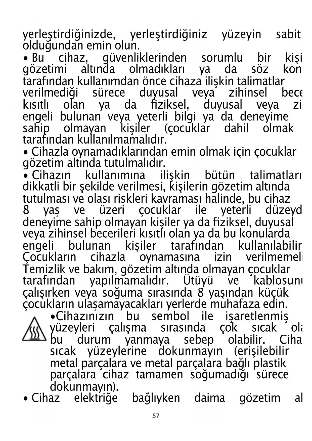 - Cihazın kullanımına ilişkin bütün talimatların dikkatlibirşekildeverilmesi,kişileringözetimaltında tutulmasıveolasırisklerikavramasıhalinde,bucihaz 8 yaş ve üzeri çocuklar ile yeterli düzeyde bilgi ve deneyimesahipolmayankişileryadaziksel,duyusal veyazihinselbecerilerikısıtlıolanyadabukonularda engeli bulunan kişiler tarafından kullanılabilir. Çocukların cihazla oynamasına izin verilmemelidir. Temizlikvebakım,gözetimaltındaolmayançocuklar tarafından yapılmamalıdır. Ütüyü ve kablosunu, çalışırken veya soğuma sırasında 8 yaşından küçük çocuklarınulaşamayacaklarıyerlerdemuhafazaedin.