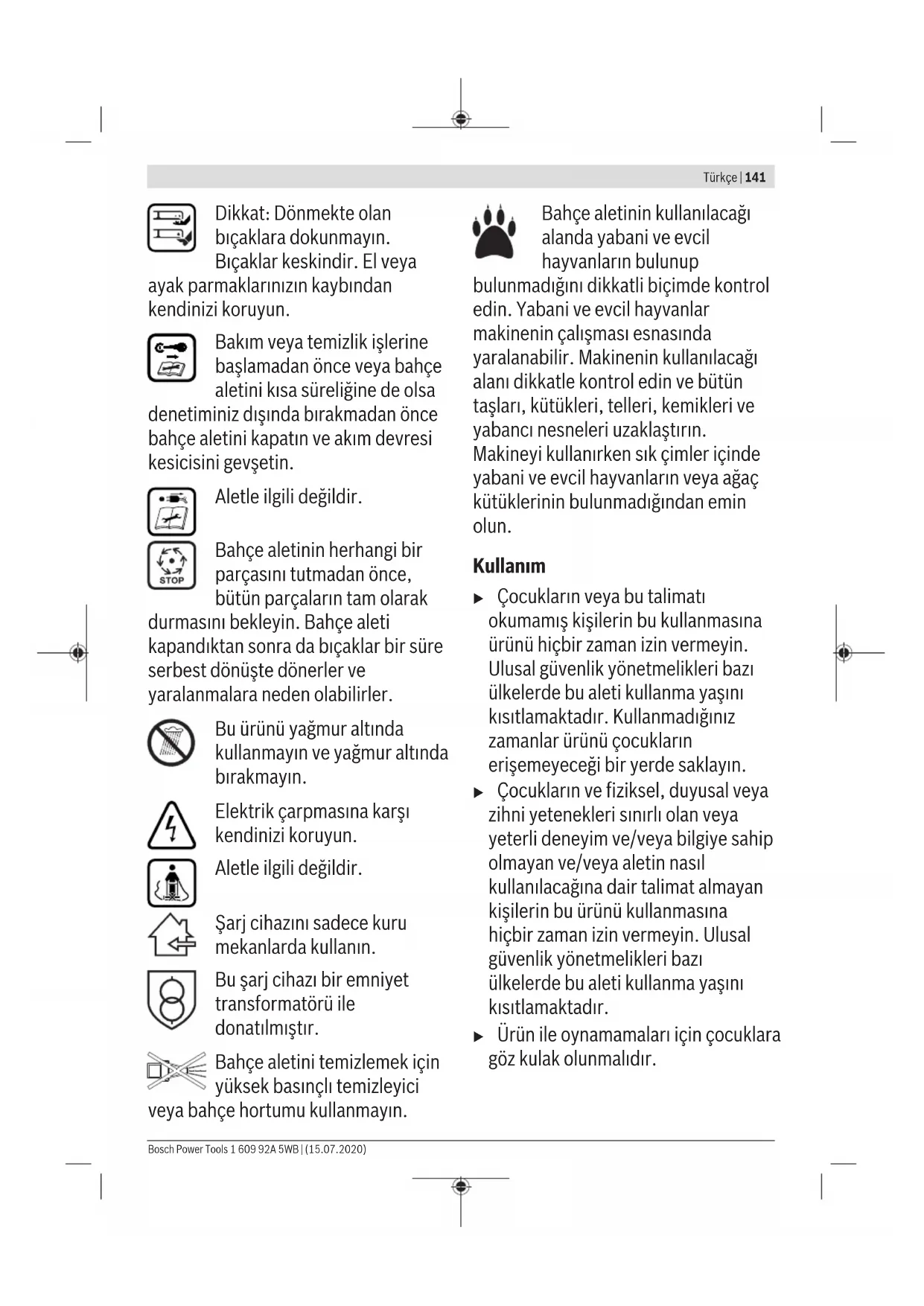 Τα μηχανήματα κήπου, οι μπαταρίες, τα εξαρτήματα και οι συσκευασίες πρέπει να ανακυκλώνονται με τρόπο φιλικό προς το περιβάλλον. Μην ρίξετε τα μηχανήματα κήπου και τις μπαταρίες στα απορρίμματα του σπιτιού σας! Μόνο για χώρες τηςΕΕ: Σύμφωνα με την Κοινοτική Οδηγία 2012/19/EE οι άχρηστες ηλεκτρικές και ηλεκτρονικές συσκευές και σύμφωνα με την Κοινοτική Οδηγία 2006/66/EΚ οι χαλασμένες ή αναλωμένες μπαταρίες πρέπει να συλλέγονται ξεχωριστά για να ανακυκλωθούν με τρόπο φιλικό προς το περιβάλλον. Μπαταρίες/Επαναφορτιζόμενες μπαταρίες: Μπαταρίες ιόντων λιθίου: Παρακαλούμε δώστε προσοχή στο κεφάλαιο Μεταφορά. Türkçe Güvenlik Talimatı Dikkat! Aşağıdaki talimatı dikkatlice okuyun. Kumanda elemanlarının işlevini ve ürünün usulüne uygun olarak kullanılmasını öğrenin. Bu kullanım kılavuzunu ileride başvurmak üzere güvenli bir yerde saklayın. Bahçe aleti üzerindeki sembollerin açıklaması Genel tehlike uyarısı. Kullanım kılavuzunu tam olarak okuyun. Çalışırken yakınınızda duran kişilerin etrafa savrulan yabancı cisimlerle yaralanmamasına dikkat edin. Uyarı: Ürün çalışır durumda iken aletle aranızda güvenli bir mesafe bırakın. 1 609 92A 5WB | (15.07.2020) Bosch Power ToolsTürkçe | 141 Dikkat: Dönmekte olan bıçaklara dokunmayın. Bıçaklar keskindir. El veya ayak parmaklarınızın kaybından kendinizi koruyun. Bakım veya temizlik işlerine başlamadan önce veya bahçe aletini kısa süreliğine de olsa denetiminiz dışında bırakmadan önce bahçe aletini kapatın ve akım devresi kesicisini gevşetin. Aletle ilgili değildir. Bahçe aletinin herhangi bir parçasını tutmadan önce, bütün parçaların tam olarak durmasını bekleyin. Bahçe aleti kapandıktan sonra da bıçaklar bir süre serbest dönüşte dönerler ve yaralanmalara neden olabilirler. Bu ürünü yağmur altında kullanmayın ve yağmur altında bırakmayın. Elektrik çarpmasına karşı kendinizi koruyun. Aletle ilgili değildir. Şarj cihazını sadece kuru mekanlarda kullanın. Bu şarj cihazı bir emniyet transformatörü ile donatılmıştır. Bahçe aletini temizlemek için yüksek basınçlı temizleyici veya bahçe hortumu kullanmayın. Bahçe aletinin kullanılacağı alanda yabani ve evcil hayvanların bulunup bulunmadığını dikkatli biçimde kontrol edin. Yabani ve evcil hayvanlar makinenin çalışması esnasında yaralanabilir. Makinenin kullanılacağı alanı dikkatle kontrol edin ve bütün taşları, kütükleri, telleri, kemikleri ve yabancı nesneleri uzaklaştırın. Makineyi kullanırken sık çimler içinde yabani ve evcil hayvanların veya ağaç kütüklerinin bulunmadığından emin olun. Kullanım u Çocukların veya bu talimatı okumamış kişilerin bu kullanmasına ürünü hiçbir zaman izin vermeyin. Ulusal güvenlik yönetmelikleri bazı ülkelerde bu aleti kullanma yaşını kısıtlamaktadır. Kullanmadığınız zamanlar ürünü çocukların erişemeyeceği bir yerde saklayın. u Çocukların ve fiziksel, duyusal veya zihni yetenekleri sınırlı olan veya yeterli deneyim ve/veya bilgiye sahip olmayan ve/veya aletin nasıl kullanılacağına dair talimat almayan kişilerin bu ürünü kullanmasına hiçbir zaman izin vermeyin. Ulusal güvenlik yönetmelikleri bazı ülkelerde bu aleti kullanma yaşını kısıtlamaktadır. u Ürün ile oynamamaları için çocuklara göz kulak olunmalıdır. Bosch Power Tools 1 609 92A 5WB | (15.07.2020)142 | Türkçe u Bahçe aletini özellikle çocukların ve evcil hayvanların çok yakınında kullanmayın. u Bu aleti kullananlar başkalarının başına gelebilecek kazalardan veya bunların özel mülkiyetinde bulunan mallarda meydana gelebilecek hasarlardan sorumludur. u Bu ürünü kullanırken açık lastik ayakkabılar veya sandaletler kullanmayın. Sağlam iş ayakkabıları ve uzun pantolon kullanın. Bu ürünü hiçbir zaman çıplak ayakla kullanmayın. u İşleyeceğiniz yüzeyi dikkatli biçimde inceleyin ve taş, dal, tel, kemik ve benzeri yabancı nesneleri temizleyin. u Aleti kullanmaya başlamadan önce daima bıçakların, bıçak cıvatalarının veya kesme modülünün aşınmış veya hasarlı olup olmadığını kontrol edin. Balanssız çalışmayı önlemek için aşınmış veya hasar görmüş bıçakları ve bıçak cıvatalarını her zaman takım halinde değiştirin. u Sadece gün ışığında veya iyi aydınlatma koşullarında biçme yapın. u Elverişsiz hava koşullarında, özellikle fırtına ve sağanak yağış beklenirken çim biçme makinesi ile çalışmayın. u Bahçe aletini mümkün olduğu kadar ıslak çimlerde kullanmayın. u Her zaman sakin çalışın, acele etmeyin. u Bahçe aletini arızalı koruma donanımlarıyla, kapaklarla ve örneğin çarpma emniyeti ve/veya çim tutma selesi gibi emniyet donanımları olmadan kullanmayın. u Kendi sağlığınız açısından koruyucu kulaklık kullanmanızı tavsiye ederiz. u Yorgun veya hastaysanız veya alkol, hap veya aldığınız ilaçların etkisi altındaysanız ürünü kullanmayın. u Meyilli yüzeylerde çalışmak tehlikeli olabilir: –Çok meyilli yüzeylerde biçme yapmayın. –Meyilli yüzeylerde veya ıslak çimlerde yere sağlam basmaya dikkat edin. –Dik yüzeylerde her zaman enine biçme yapın, aşağı yukarı yapmayın. –Dik yerlerde yön değiştirirken özellikle dikkatli olun. u Geriye doğru giderken veya bahçe aletini çekerken çok dikkatli olun. u Biçme yaparken bahçe aletini d