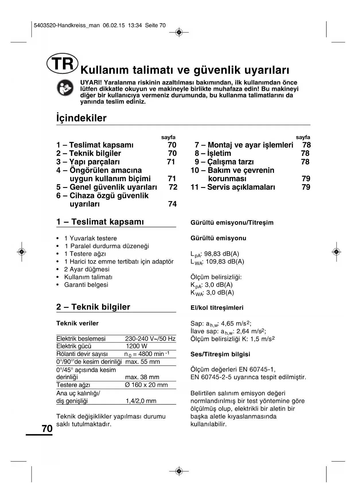 - 1 Yuvarlak testere• 1 Paralel durdurma düzeneπi• 1 Testere aπzı• 1 Harici toz emme tertibatı için adaptör • 2 Ayar düπmesi• Kullan∂m talimat∂• Garanti belgesi 2 – Teknik bilgiler Teknik veriler Elektrik beslemesi 230-240 V~/50 Hz Elektrik gücü 1200 WRölanti devir sayısı n = 4800 min 0°/90°’de kesim derinliπi max. 55 mm0°/45° açısında kesim derinliği max. 38 mm Testere aπzı Ø 160 x 20 mmAna uç kal∂nl∂π∂/diμ geniμliπi 1,4/2,0 mmTeknik deπiμiklikler yap∂lmas∂ durumusakl∂ tutulmaktad∂r.Gürültü emisyonu/TitreμimGürültü emisyonu