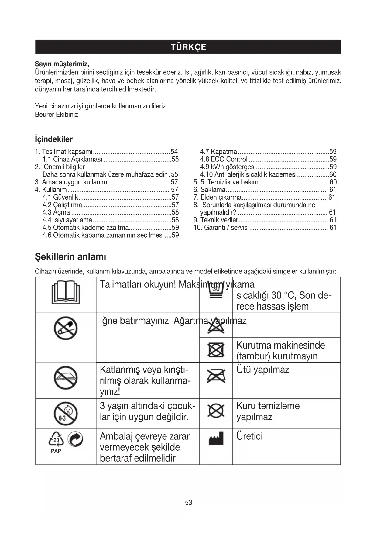 Sayın müşterimiz, Ürünlerimizden birini seçtiğiniz için teşekkür ederiz. Isı, ağırlık, kan basıncı, vücut sıcaklığı, nabız, yumuşak terapi, masaj, güzellik, hava ve bebek alanlarına yönelik yüksek kaliteli ve titizlikle test edilmiş ürünlerimiz, dünyanın her tarafında tercih edilmektedir. Yeni cihazınızı iyi günlerde kullanmanızı dileriz. Beurer Ekibiniz54 Bu ürün geçerli Avrupa Birliği yönergelerinin ve ulusal yönergelerin gereklerini yerine getir