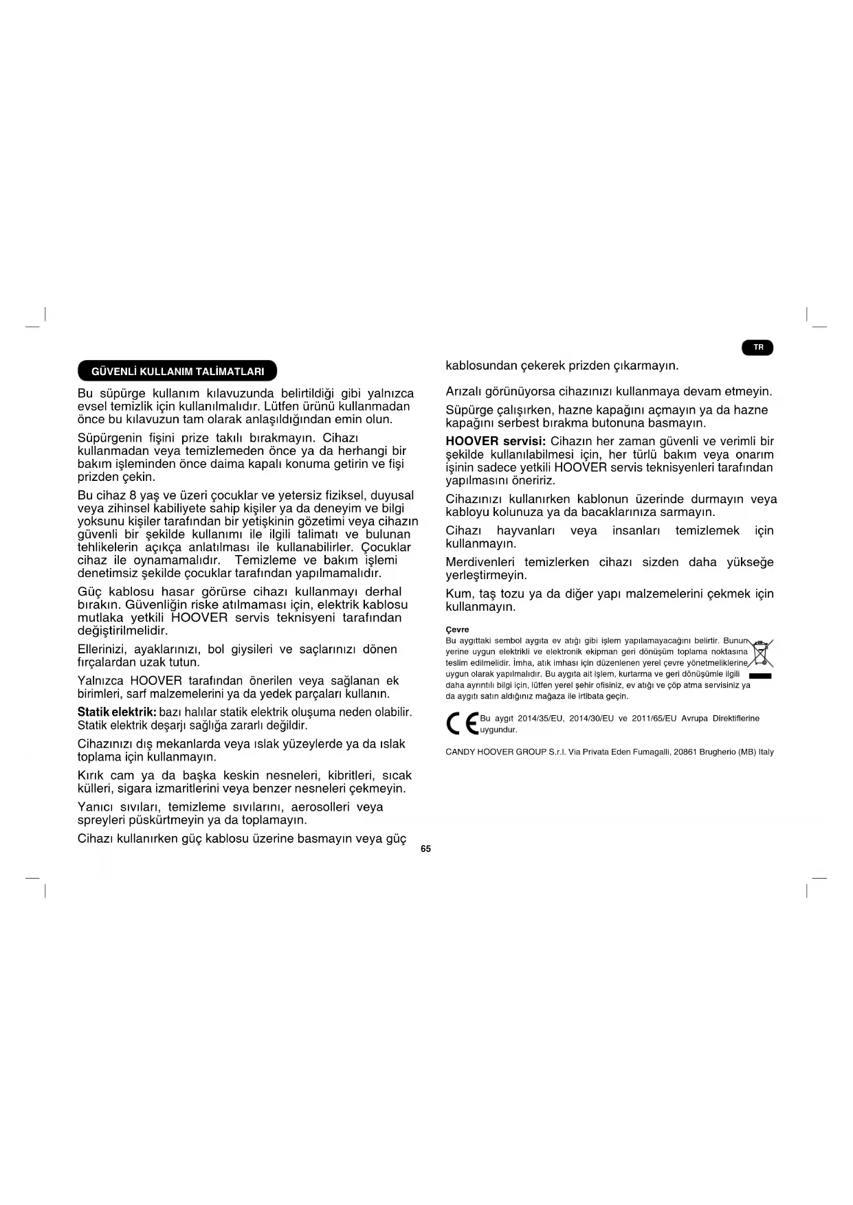 Bu süpürge kullanım kılavuzunda belirtildiği gibi yalnızca evsel temizlik için kullanılmalıdır. Lütfen ürünü kullanmadan önce bu kılavuzun tam olarak anlaşıldığından emin olun. Süpürgenin şini prize takılı bırakmayın. Cihazı kullanmadan veya temizlemeden önce ya da herhangi bir bakım işleminden önce daima kapalı konuma getirin ve şi prizden çekin. Bu cihaz 8 yaş ve üzeri çocuklar ve yetersiz ziksel, duyusal veya zihinsel kabiliyete sahip kişiler ya da deneyim ve bilgi yoksunu kişiler tarafından bir yetişkinin gözetimi veya cihazın güvenli bir şekilde kullanımı ile ilgili talimatı ve bulunan tehlikelerin açıkça anlatılması ile kullanabilirler. Çocuklar cihaz ile oynamamalıdır. Temizleme ve bakım işlemi denetimsiz şekilde çocuklar tarafından yapılmamalıdır. Güç kablosu hasar görürse cihazı kullanmayı derhal bırakın. Güvenliğin riske atılmaması için, elektrik kablosu mutlaka yetkili HOOVER servis teknisyeni tarafından değiştirilmelidir. Ellerinizi, ayaklarınızı, bol giysileri ve saçlarınızı dönen fırçalardan uzak tutun. Yalnızca HOOVER tarafından önerilen veya sağlanan ek birimleri, sarf malzemelerini ya da yedek parçaları kullanın. Statik elektrik: bazı halılar statik elektrik oluşuma neden olabilir. Statik elektrik deşarjı sağlığa zararlı değildir. Cihazınızı dış mekanlarda veya ıslak yüzeylerde ya da ıslak toplama için kullanmayın. Kırık cam ya da başka keskin nesneleri, kibritleri, sıcak külleri, sigara izmaritlerini veya benzer nesneleri çekmeyin. Yanıcı sıvıları, temizleme sıvılarını, aerosolleri veya spreyleri püskürtmeyin ya da toplamayın. Cihazı kullanırken güç kablosu üzerine basmayın veya güç kablosundan çekerek prizden çıkarmayın. Arızalı görünüyorsa cihazınızı kullanmaya devam etmeyin. Süpürge çalışırken, hazne kapağını açmayın ya da hazne kapağını serbest bırakma butonuna basmayın. HOOVER servisi: Cihazın her zaman güvenli ve verimli bir şekilde kullanılabilmesi için, her türlü bakım veya onarım işinin sadece yetkili HOOVER servis teknisyenleri tarafından yapılmasını öneririz. Cihazınızı kullanırken kablonun üzerinde durmayın veya kabloyu kolunuza ya da bacaklarınıza sarmayın. Cihazı hayvanları veya insanları temizlemek için kullanmayın. Merdivenleri temizlerken cihazı sizden daha yükseğe yerleştirmeyin. Kum, taş tozu ya da diğer yapı malzemelerini çekmek için kullanmayın. Çevre Bu aygıttaki sembol aygıta ev atığı gibi işlem yapılamayacağını belirtir. Bunun yerine uygun elektrikli ve elektronik ekipman geri dönüşüm toplama noktasına teslim edilmelidir. İmha, atık imhası için düzenlenen yerel çevre yönetmeliklerine uygun olarak yapılmalıdır. Bu aygıta ait işlem, kurtarma ve geri dönüşümle ilgili daha ayrıntılı bilgi için, lütfen yerel şehir osiniz, ev atığı ve çöp atma servisiniz ya da aygıtı satın aldığınız mağaza ile irtibata geçin. Bu aygıt 2014/35/EU, 2014/30/EU ve 2011/65/EU Avrupa Direktierine uygundur. CANDY HOOVER GROUP S.r.l. Via Privata Eden Fumagalli, 20861 Brugherio (MB) Italy TR66 A. Açma/Kapama Pedalı B. Ön Motor Filtre Kapağı C. Hazne Kolu D. İç Hazne Gövdesi E. Hazne Kapağını Serbest Bırakma Bu- tonu F. Dolu Hazne Mekanik Dedektörü G. Hortum Ucu Mandal Butonu H. Hortum
