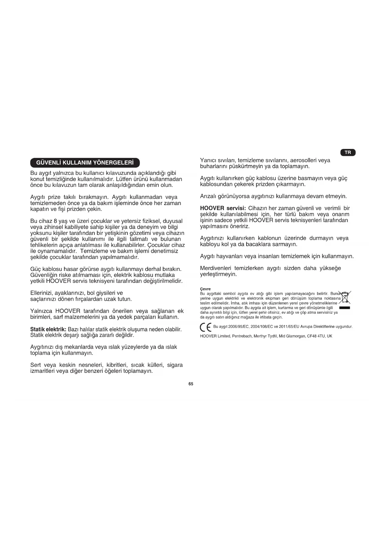 Bu aygıt yalnızca bu kullanıcı kılavuzunda açıklandığı gibi konut temizliğinde kullanılmalıdır. Lütfen ürünü kullanmadan önce bu kılavuzun tam olarak anlaşıldığından emin olun. Aygıtı prize takılı bırakmayın. Aygıtı kullanmadan veya temizlemeden önce ya da bakım işleminde önce her zaman kapatın ve şi prizden çekin. Bu cihaz 8 yaş ve üzeri çocuklar ve yetersiz ziksel, duyusal veya zihinsel kabiliyete sahip kişiler ya da deneyim ve bilgi yoksunu kişiler tarafından bir yetişkinin gözetimi veya cihazın güvenli bir şekilde kullanımı ile ilgili talimatı ve bulunan tehlikelerin açıça anlatılması ile kullanabilirler. Çocuklar cihaz ile oynamamalıdır. Temizleme ve bakım işlemi denetimsiz şekilde çocuklar tarafından yapılmamalıdır. Güç kablosu hasar görürse aygıtı kullanmayı derhal bırakın. Güvenliğin riske atılmaması için, elektrik kablosu mutlaka yetkili HOOVER servis teknisyeni tarafından değiştirilmelidir. Ellerinizi, ayaklarınızı, bol giysileri ve saçlarınızı dönen fırçalardan uzak tutun. Yalnızca HOOVER tarafından önerilen veya sağlanan ek birimleri, sarf malzemelerini ya da yedek parçaları kullanın. Statik elektrik: Bazı halılar statik elektrik oluşuma neden olabilir. Statik elektrik deşarjı sağlığa zararlı değildir. Aygıtınızı dış mekanlarda veya ıslak yüzeylerde ya da ıslak toplama için kullanmayın. Sert veya keskin nesneleri, kibritleri, sıcak külleri, sigara izmaritleri veya diğer benzeri öğeleri toplamayın. Yanıcı sıvıları, temizleme sıvılarını, aerosolleri veya buharlarını püskürtmeyin ya da toplamayın. Aygıtı kullanırken güç kablosu üzerine basmayın veya güç kablosundan çekerek prizden çıkarmayın. Arızalı görünüyorsa aygıtınızı kullanmaya devam etmeyin. HOOVER servisi: Cihazın her zaman güvenli ve verimli bir şekilde kullanılabilmesi için, her türlü bakım veya onarım işinin sadece yetkili HOOVER servis teknisyenleri tarafından yapılmasını öneririz. Aygıtınızı kullanırken kablonun üzerinde durmayın veya kabloyu kol ya da bacaklara sarmayın. Aygıtı hayvanları veya insanları temizlemek için kullanmayın. Merdivenleri temizlerken aygıtı sizden daha yükseğe yerleştirmeyin. Çevre Bu aygıttaki sembol aygıta ev atığı gibi işlem yapılamayacağını belirtir. Bunun yerine uygun elektrikli ve elektronik ekipman geri dönüşüm toplama noktasına teslim edilmelidir. İmha, atık imhası için düzenlenen yerel çevre yönetmeliklerine uygun olarak yapılmalıdır. Bu aygıta ait işlem, kurtarma ve geri dönüşümle ilgili daha ayrıntılı bilgi için, lütfen yerel şehir osiniz, ev atığı ve çöp atma servisiniz ya da aygıtı satın aldığınız mağaza ile irtibata geçin. Bu aygıt 2006/95/EC, 2004/108/EC ve 2011/65/EU Avrupa Direktierine uygundur. HOOVER Limited, Pentrebach, Merthyr Tydl, Mid Glamorgan, CF48 4TU, UK TR66 ELEKTRİK SÜPÜRGENİZİ TANIYIN A. Elektrikli süpürge ana gövdesi B. Toz Haznesi C. Toz Haznesi tutamağı D. On /Off (Açma/Kapama) düğmesi E. Kablo Geri Sarma Düğmesi F. Toz Haznesi Açma Düğmesi G. Toz Haznesi Kapağını Açma Tetiği H. Filtre Grubu