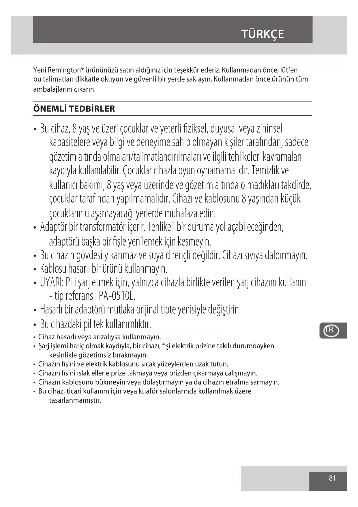 - UYARI: Pili şarj etmek için, yalnızca cihazla birlikte verilen şarj cihazını kullanın - tip referansı PA-0510E.