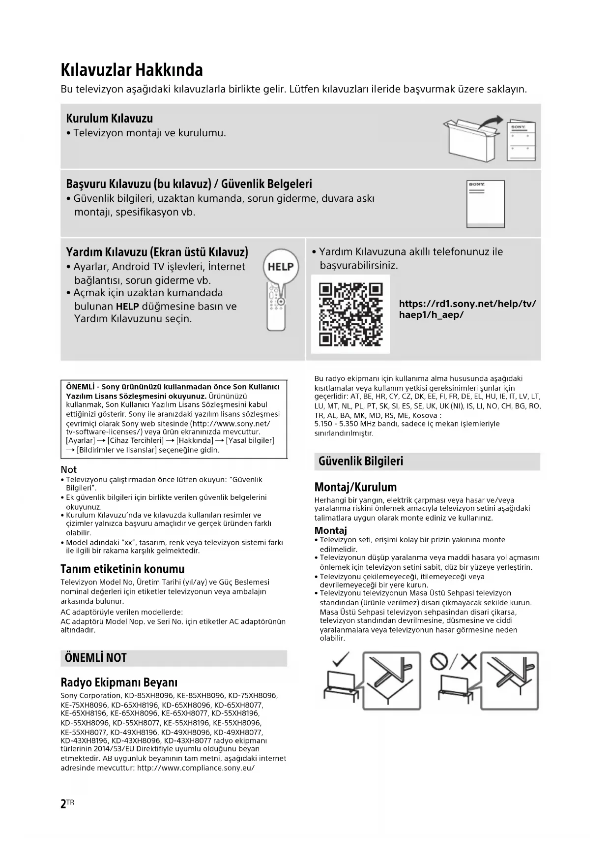 - Yardım Kılavuzuna akıllı telefonunuz ile başvurabilirsiniz. https://rd1.sony.net/help/tv/ haep1/h_aep/ ÖNEMLİ - Sony ürününüzü kullanmadan önce Son Kullanıcı Yazılım Lisans Sözleşmesini okuyunuz. Ürününüzü kullanmak, Son Kullanıcı Yazılım Lisans Sözleşmesini kabul ettiğinizi gösterir. Sony ile aranızdaki yazılım lisans sözleşmesi çevrimiçi olarak Sony web sitesinde (http://www.sony.net/ tv-software-licenses/) veya ürün ekranınızda mevcuttur. [Ayarlar] [Cihaz Tercihleri] [Hakkında] [Yasal bilgiler] [Bildirimler ve lisanslar] seçeneğine gidin. ÖNEMLİ NOT Güvenlik Bilgileri3