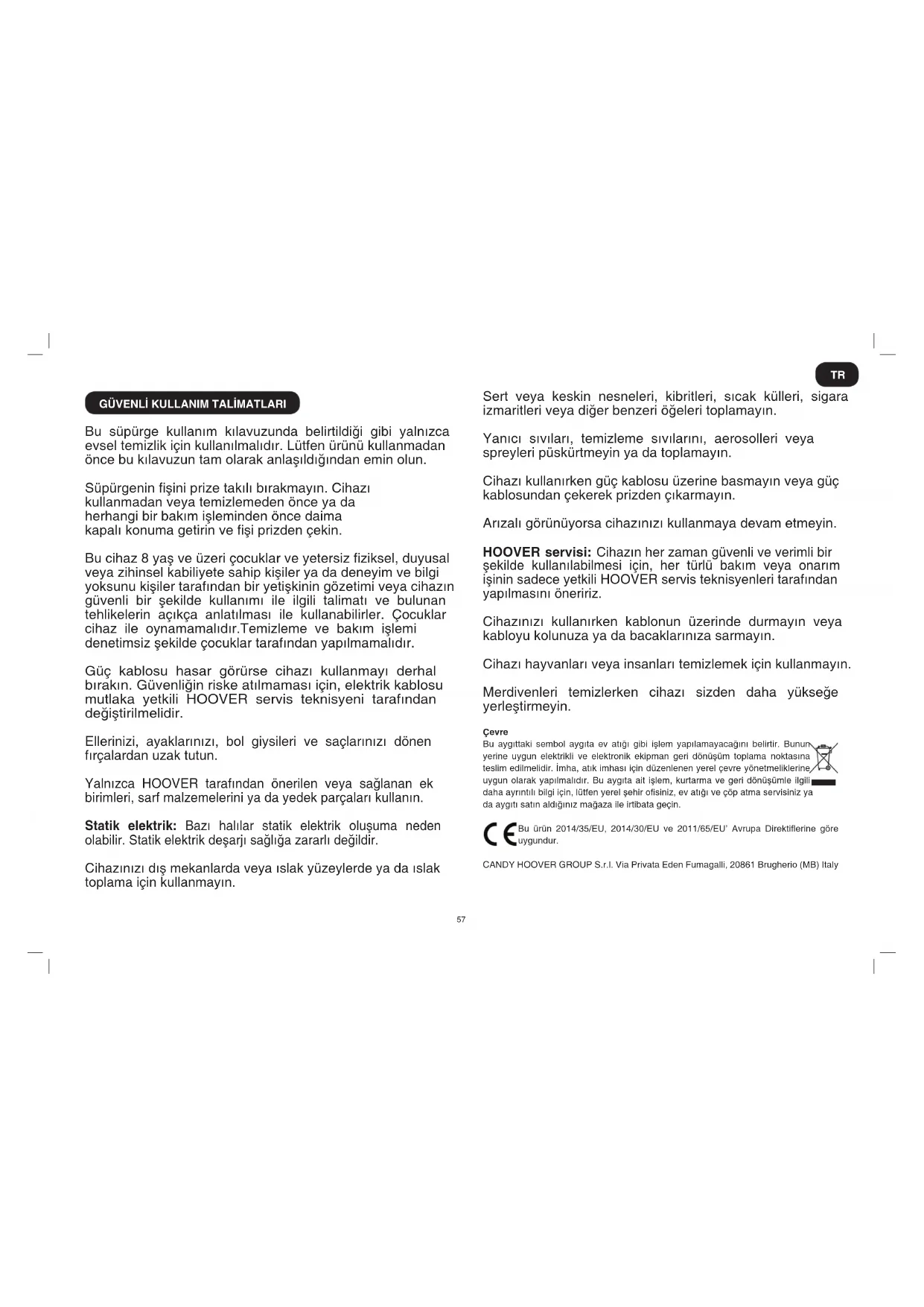Bu süpürge kullanım kılavuzunda belirtildiği gibi yalnızca evsel temizlik için kullanılmalıdır. Lütfen ürünü kullanmadan önce bu kılavuzun tam olarak anlaşıldığından emin olun. Süpürgenin şini prize takılı bırakmayın. Cihazı kullanmadan veya temizlemeden önce ya da herhangi bir bakım işleminden önce daima kapalı konuma getirin ve şi prizden çekin. Bu cihaz 8 yaş ve üzeri çocuklar ve yetersiz ziksel, duyusal veya zihinsel kabiliyete sahip kişiler ya da deneyim ve bilgi yoksunu kişiler tarafından bir yetişkinin gözetimi veya cihazın güvenli bir şekilde kullanımı ile ilgili talimatı ve bulunan tehlikelerin açıkça anlatılması ile kullanabilirler. Çocuklar cihaz ile oynamamalıdır.Temizleme ve bakım işlemi denetimsiz şekilde çocuklar tarafından yapılmamalıdır. Güç kablosu hasar görürse cihazı kullanmayı derhal bırakın. Güvenliğin riske atılmaması için, elektrik kablosu mutlaka yetkili HOOVER servis teknisyeni tarafından değiştirilmelidir. Ellerinizi, ayaklarınızı, bol giysileri ve saçlarınızı dönen fırçalardan uzak tutun. Yalnızca HOOVER tarafından önerilen veya sağlanan ek birimleri, sarf malzemelerini ya da yedek parçaları kullanın. Statik elektrik: Bazı halılar statik elektrik oluşuma neden olabilir. Statik elektrik deşarjı sağlığa zararlı değildir. Cihazınızı dış mekanlarda veya ıslak yüzeylerde ya da ıslak toplama için kullanmayın. Sert veya keskin nesneleri, kibritleri, sıcak külleri, sigara izmaritleri veya diğer benzeri öğeleri toplamayın. Yanıcı sıvıları, temizleme sıvılarını, aerosolleri veya spreyleri püskürtmeyin ya da toplamayın. Cihazı kullanırken güç kablosu üzerine basmayın veya güç kablosundan çekerek prizden çıkarmayın. Arızalı görünüyorsa cihazınızı kullanmaya devam etmeyin. HOOVER servisi: Cihazın her zaman güvenli ve verimli bir şekilde kullanılabilmesi için, her türlü bakım veya onarım işinin sadece yetkili HOOVER servis teknisyenleri tarafından yapılmasını öneririz. Cihazınızı kullanırken kablonun üzerinde durmayın veya kabloyu kolunuza ya da bacaklarınıza sarmayın. Cihazı hayvanları veya insanları temizlemek için kullanmayın. Merdivenleri temizlerken cihazı sizden daha yükseğe yerleştirmeyin. Çevre Bu aygıttaki sembol aygıta ev atığı gibi işlem yapılamayacağını belirtir. Bunun yerine uygun elektrikli ve elektronik ekipman geri dönüşüm toplama noktasına teslim edilmelidir. İmha, atık imhası için düzenlenen yerel çevre yönetmeliklerine uygun olarak yapılmalıdır. Bu aygıta ait işlem, kurtarma ve geri dönüşümle ilgili daha ayrıntılı bilgi için, lütfen yerel şehir osiniz, ev atığı ve çöp atma servisiniz ya da aygıtı satın aldığınız mağaza ile irtibata geçin. Bu ürün 2014/35/EU, 2014/30/EU ve 2011/65/EU’ Avrupa Direktierine göre uygundur. CANDY HOOVER GROUP S.r.l. Via Privata Eden Fumagalli, 20861 Brugherio (MB) Italy TR58 *Sadece bazı modeller için ** Yalnızca belirli modeller, başlıklar modele göre değişiklik gösterebilir
