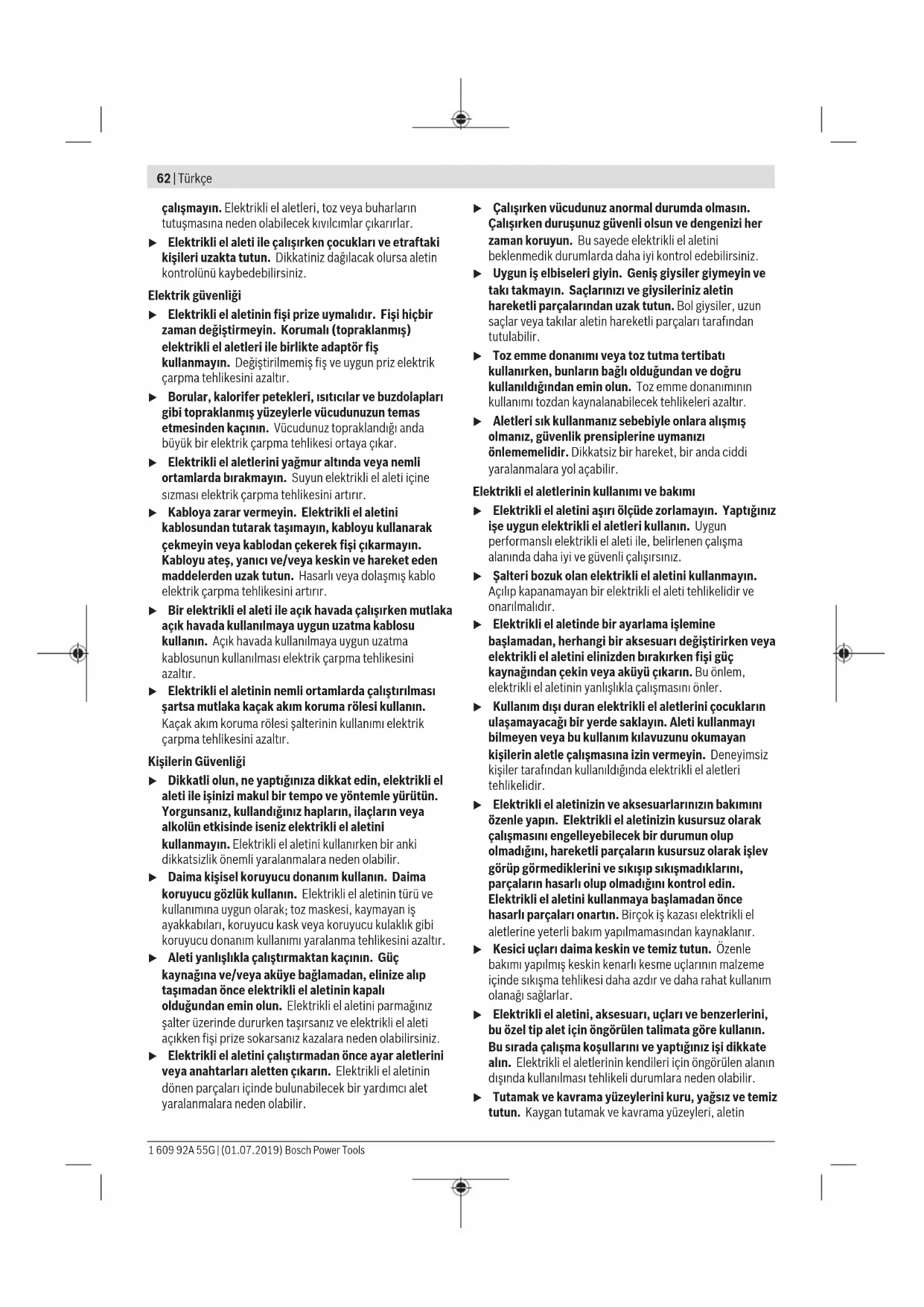 Τα ηλεκτρικά εργαλεία, τα εξαρτήματα και οι συσκευασίες πρέπει να ανακυκλώνονται με τρόπο φιλικό προς το περιβάλλον. Μην ρίχνετε τα ηλεκτρικά εργαλεία στα απορρίμματα του σπιτιού σας! Μόνο για χώρες τηςΕΕ: Σύμφωνα με την Ευρωπαϊκή Οδηγία 2012/19/ΕΕ σχετικά με τις παλιές ηλεκτρικές και ηλεκτρονικές συσκευές και τη μεταφορά της οδηγίας αυτής σε εθνικό δίκαιο δεν είναι πλέον υποχρεωτικό, τα άχρηστα ηλεκτρικά εργαλεία να συλλέγονται ξεχωριστά για να ανακυκλωθούν με τρόπο φιλικό προς το περιβάλλον. Türkçe Güvenlik talimatı Elektrikli el aletleri için genel güvenlik uyarıları UYARI Bu elektrikli el aletiyle birlikte gelen tüm güvenlik uyarılarını, talimatları, resim ve açıklamaları okuyun. Aşağıda bulunan talimatlara uyulmaması halinde elektrik çarpmalarına, yangınlara ve/veya ağır yaralanmalara neden olabilir. Bütün uyarıları ve talimat hükümlerini ileride kullanmak üzere saklayın. Uyarı ve talimat hükümlerinde kullanılan "elektrikli el aleti" terimi, akım şebekesine bağlı (elektrikli) aletlerle akü ile çalışan aletleri (akülü) kapsamaktadır. Çalışma yeri güvenliği u Çalıştığınız yeri temiz tutun ve iyi aydınlatın. Dağınık veya karanlık alanlar kazalara davetiye çıkarır. u Yakınında patlayıcı maddeler, yanıcı sıvı, gaz veya tozların bulunduğu yerlerde elektrikli el aleti ile Bosch Power Tools 1 609 92A 55G | (01.07.2019)62 | Türkçe çalışmayın. Elektrikli el aletleri, toz veya buharların tutuşmasına neden olabilecek kıvılcımlar çıkarırlar. u Elektrikli el aleti ile çalışırken çocukları ve etraftaki kişileri uzakta tutun. Dikkatiniz dağılacak olursa aletin kontrolünü kaybedebilirsiniz. Elektrik güvenliği u Elektrikli el aletinin fişi prize uymalıdır. Fişi hiçbir zaman değiştirmeyin. Korumalı (topraklanmış) elektrikli el aletleri ile birlikte adaptör fiş kullanmayın. Değiştirilmemiş fiş ve uygun priz elektrik çarpma tehlikesini azaltır. u Borular, kalorifer petekleri, ısıtıcılar ve buzdolapları gibi topraklanmış yüzeylerle vücudunuzun temas etmesinden kaçının. Vücudunuz topraklandığı anda büyük bir elektrik çarpma tehlikesi ortaya çıkar. u Elektrikli el aletlerini yağmur altında veya nemli ortamlarda bırakmayın. Suyun elektrikli el aleti içine sızması elektrik çarpma tehlikesini artırır. u Kabloya zarar vermeyin. Elektrikli el aletini kablosundan tutarak taşımayın, kabloyu kullanarak çekmeyin veya kablodan çekerek fişi çıkarmayın. Kabloyu ateş, yanıcı ve/veya keskin ve hareket eden maddelerden uzak tutun. Hasarlı veya dolaşmış kablo elektrik çarpma tehlikesini artırır. u Bir elektrikli el aleti ile açık havada çalışırken mutlaka açık havada kullanılmaya uygun uzatma kablosu kullanın. Açık havada kullanılmaya uygun uzatma kablosunun kullanılması elektrik çarpma tehlikesini azaltır. u Elektrikli el aletinin nemli ortamlarda çalıştırılması şartsa mutlaka kaçak akım koruma rölesi kullanın. Kaçak akım koruma rölesi şalterinin kullanımı elektrik çarpma tehlikesini azaltır. Kişilerin Güvenliği u Dikkatli olun, ne yaptığınıza dikkat edin, elektrikli el aleti ile işinizi makul bir tempo ve yöntemle yürütün. Yorgunsanız, kullandığınız hapların, ilaçların veya alkolün etkisinde iseniz elektrikli el aletini kullanmayın. Elektrikli el aletini kullanırken bir anki dikkatsizlik önemli yaralanmalara neden olabilir. u Daima kişisel koruyucu donanım kullanın. Daima koruyucu gözlük kullanın. Elektrikli el aletinin türü ve kullanımına uygun olarak; toz maskesi, kaymayan iş ayakkabıları, koruyucu kask veya koruyucu kulaklık gibi koruyucu donanım kullanımı yaralanma tehlikesini azaltır. u Aleti yanlışlıkla çalıştırmaktan kaçının. Güç kaynağına ve/veya aküye bağlamadan, elinize alıp taşımadan önce elektrikli el aletinin kapalı olduğundan emin olun. Elektrikli el aletini parmağınız şalter üzerinde dururken taşırsanız ve elektrikli el aleti açıkken fişi prize sokarsanız kazalara neden olabilirsiniz. u Elektrikli el aletini çalıştırmadan önce ayar aletlerini veya anahtarları aletten çıkarın. Elektrikli el aletinin dönen parçaları içinde bulunabilecek bir yardımcı alet yaralanmalara neden olabilir. u Çalışırken vücudunuz anormal durumda olmasın. Çalışırken duruşunuz güvenli olsun ve dengenizi her zaman koruyun. Bu sayede elektrikli el aletini beklenmedik durumlarda daha iyi kontrol edebilirsiniz. u Uygun iş elbiseleri giyin. Geniş giysiler giymeyin ve takı takmayın. Saçlarınızı ve giysileriniz aletin hareketli parçalarından uzak tutun. Bol giysiler, uzun saçlar veya takılar aletin hareketli parçaları tarafından tutulabilir. u Toz emme donanımı veya toz tutma tertibatı kullanırken, bunların bağlı olduğundan ve doğru kullanıldığından emin olun. Toz emme donanımının kullanımı tozdan kaynalanabilecek tehlikeleri azaltır. u Aletleri sık kullanmanız sebebiyle onlara alışmış olmanız, güvenlik prensiplerine uymanızı önlememelidir. Dikkatsiz bir hareket, bir anda ciddi yaralanmalara yol açabilir. Elektrikli el aletlerinin kullanımı ve bakımı u Elektrikli el aletini aşırı ölçüde zorlamayın. Yaptığınız işe uygun elektrikli el aletleri kullanın. Uygun performanslı elektrikli el aleti ile, belirlenen çalışma alanında daha iyi ve güvenli çalışırsınız. u Şalteri bozuk olan elektrikli el aletini kullanmayın. Açılıp kapanamayan bir elektrikli el a