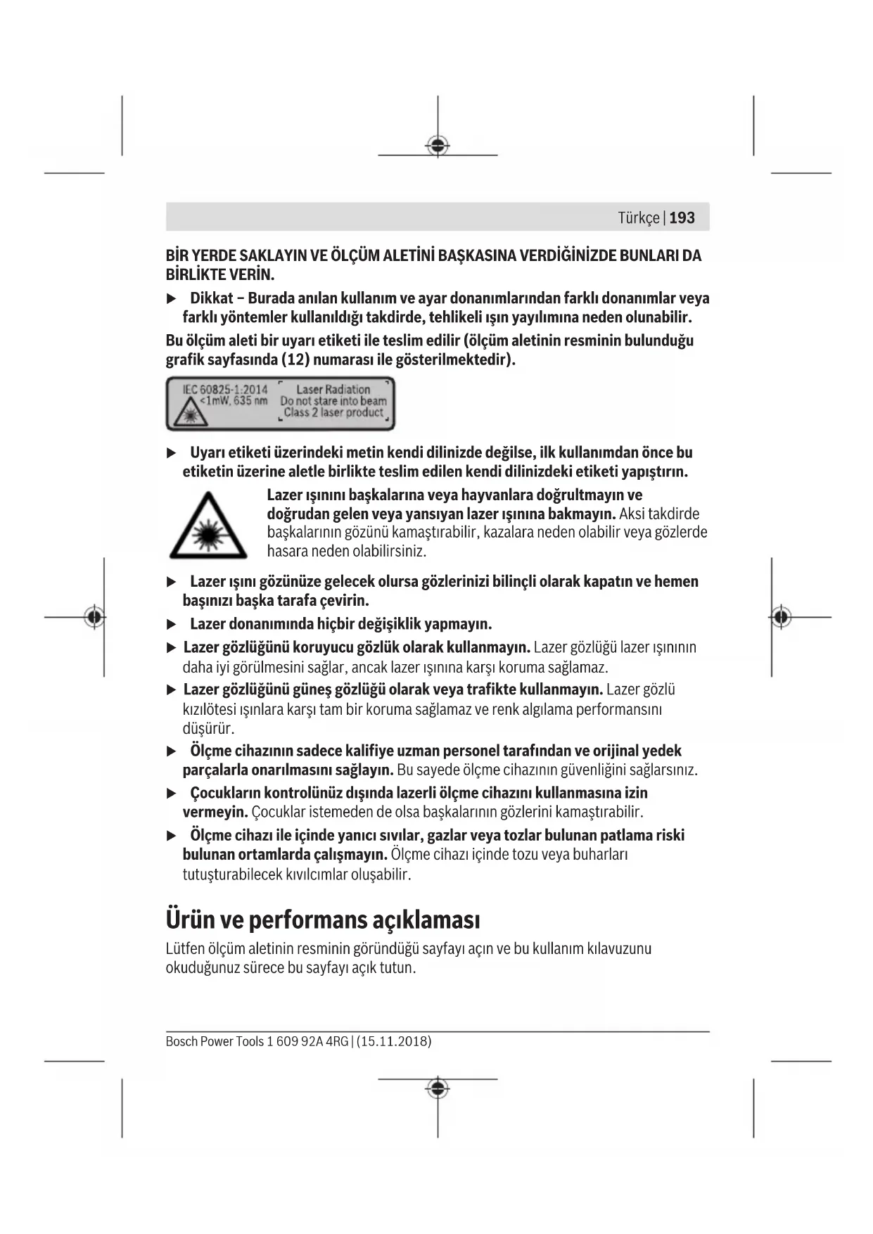 Τα όργανα μέτρησης, τα εξαρτήματα και οι συσκευασίες πρέπει να ανακυκλώνονται με τρόπο φιλικό προς το περιβάλλον. Μη ρίχνετε τα όργανα μέτρησης και τις επαναφορτιζόμενες μπαταρίες/ μπαταρίες στα οικιακά απορρίμματα! Μόνο για χώρες τηςΕΕ: Σύμφωνα με την Ευρωπαϊκή οδηγία 2012/19/ΕΕ τα άχρηστα όργανα μέτρησης και σύμφωνα με την Ευρωπαϊκή οδηγία 2006/66/ΕΚ οι χαλασμένες ή χρησιμοποιημένες μπαταρίες δεν είναι πλέον υποχρεωτικό να συλλέγονται ξεχωριστά για να ανακυκλωθούν με τρόπο φιλικό προς το περιβάλλον. Türkçe Güvenlik talimatı Ölçüm aleti ile tehlikesiz ve güvenli biçimde çalışabilmek için bütün talimatlar okunmalıdır. Ölçüm aleti bu talimatlara uygun olarak kullanılmazsa, ölçüm aletine entegre koruyucu donanımların işlevi kısıtlanabilir. Ölçüm aleti üzerindeki uyarı etiketlerini hiçbir zaman görünmez duruma getirmeyin. BU TALİMATLARI İYİ VE GÜVENLİBİR YERDE SAKLAYIN VE ÖLÇÜM ALETİNİ BAŞKASINA VERDİĞİNİZDE BUNLARI DA BİRLİKTE VERİN. u Dikkat – Burada anılan kullanım ve ayar donanımlarından farklı donanımlar veya farklı yöntemler kullanıldığı takdirde, tehlikeli ışın yayılımına neden olunabilir. Bu ölçüm aleti bir uyarı etiketi ile teslim edilir (ölçüm aletinin resminin bulunduğu grafik sayfasında (12) numarası ile gösterilmektedir). u Uyarı etiketi üzerindeki metin kendi dilinizde değilse, ilk kullanımdan önce bu etiketin üzerine aletle birlikte teslim edilen kendi dilinizdeki etiketi yapıştırın. Lazer ışınını başkalarına veya hayvanlara doğrultmayın ve doğrudan gelen veya yansıyan lazer ışınına bakmayın. Aksi takdirde başkalarının gözünü kamaştırabilir, kazalara neden olabilir veya gözlerde hasara neden olabilirsiniz. u Lazer ışını gözünüze gelecek olursa gözlerinizi bilinçli olarak kapatın ve hemen başınızı başka tarafa çevirin. u Lazer donanımında hiçbir değişiklik yapmayın. u Lazer gözlüğünü koruyucu gözlük olarak kullanmayın. Lazer gözlüğü lazer ışınının daha iyi görülmesini sağlar, ancak lazer ışınına karşı koruma sağlamaz. u Lazer gözlüğünü güneş gözlüğü olarak veya trafikte kullanmayın. Lazer gözlü kızılötesi ışınlara karşı tam bir koruma sağlamaz ve renk algılama performansını düşürür. u Ölçme cihazının sadece kalifiye uzman personel tarafından ve orijinal yedek parçalarla onarılmasını sağlayın. Bu sayede ölçme cihazının güvenliğini sağlarsınız. u Çocukların kontrolünüz dışında lazerli ölçme cihazını kullanmasına izin vermeyin. Çocuklar istemeden de olsa başkalarının gözlerini kamaştırabilir. u Ölçme cihazı ile içinde yanıcı sıvılar, gazlar veya tozlar bulunan patlama riski bulunan ortamlarda çalışmayın. Ölçme cihazı içinde tozu veya buharları tutuşturabilecek kıvılcımlar oluşabilir. Ürün ve performans açıklaması Lütfen ölçüm aletinin resminin göründüğü sayfayı açın ve bu kullanım kılavuzunu okuduğunuz sürece bu sayfayı açık tutun. Türkçe | 193 Bosch Power Tools 1 609 92A 4RG | (15.11.2018)194 | Türkçe 1 609 92A 4RG | (15.11.2018) Bosch Power Tools Usulüne uygun kullanım Bu ölçüm aleti, uzaklıkların, uzunlukların, yüksekliklerin, mesafelerin, eğimlerin ölçülmesi ve yüzey ve hacimlerin hesaplanması için tasarlanmıştır. Bu ölçme cihazı kapalı mekanlarda ve açık havada kullanılmaya uygundur. Şekli gösterilen elemanlar Şekli gösterilen elemanların numaraları ile grafik sayfasındaki ölçme cihazı resmindeki numaralar aynıdır. (1) Ekran (2) Ölçme tuşu [ ] (3) Artı tuşu [+] (4) Referans düzlemi seçme tuşu (5) Açma/kapama tuşu [ ] (6) Bellek tuşu [ ] (7) Fonksiyon tuşu [Func] (8) Eksi tuşu [−] (9) Pil haznesi kapağı (10) Pil haznesi kapağı kilidi (11) Seri numarası (12) Lazer uyarı etiketi (13) 1/4" tripod dişi (14) Algılama merceği (15) Lazer ışını çıkış deliği (16) Lazer hedef tablası
