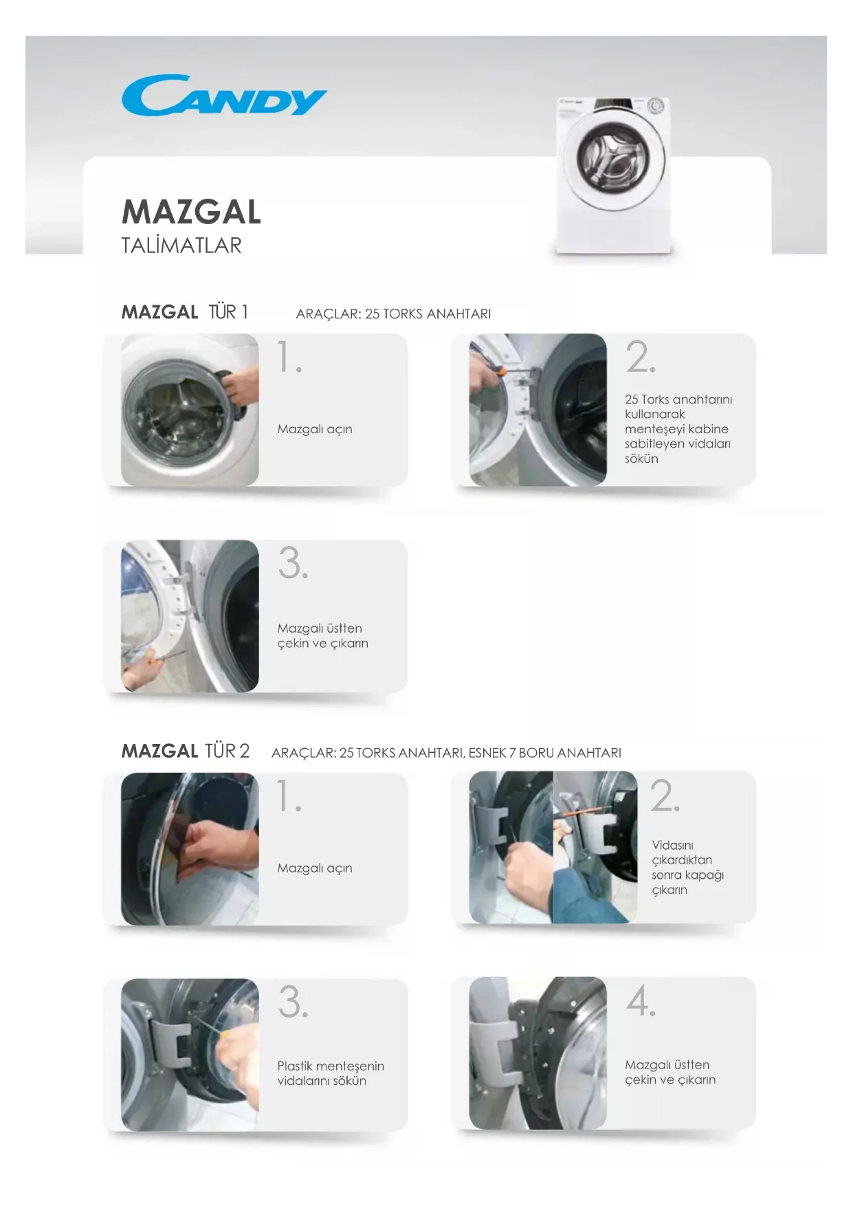 MAZGAL TÜR 1 ARAÇLAR: 25 TORKS ANAHTARI MAZGAL TÜR 2 ARAÇLAR: 25 TORKS ANAHTARI, ESNEK 7 BORU ANAHTARI MAZGAL TALİMATLAR1. Mazgalı açınVidasını çıkardıktan sonra kapağı çıkarın Plastik menteşenin vidalarını sökün Mazgalı üstten çekin ve çıkarın