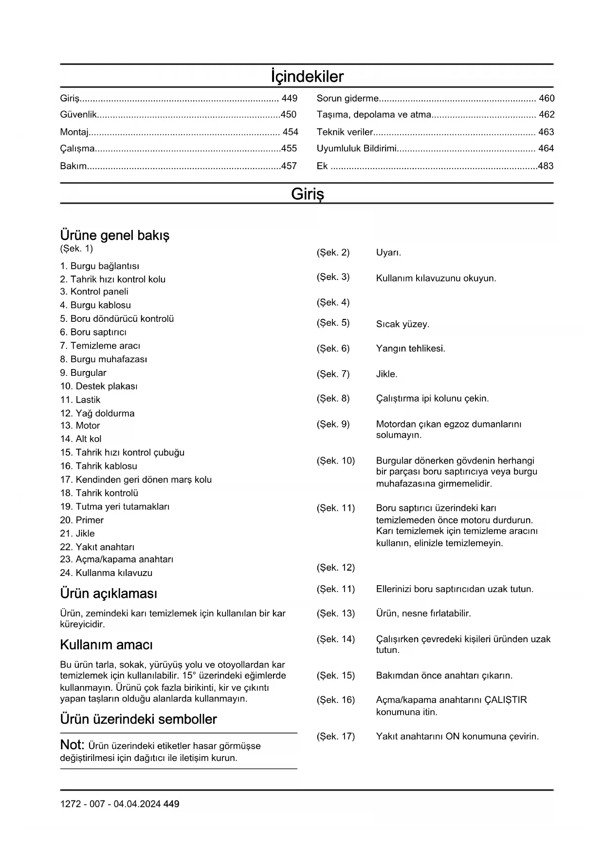 - Gözlerinizi makineden fırlatılabilecek yabancı nesnelerden korumak için kullanım sırasında veya 450 1272 - 007 - 04.04.2024bir ayar ya da onarım yaparken her zaman gözlük veya göz koruyucu takın.