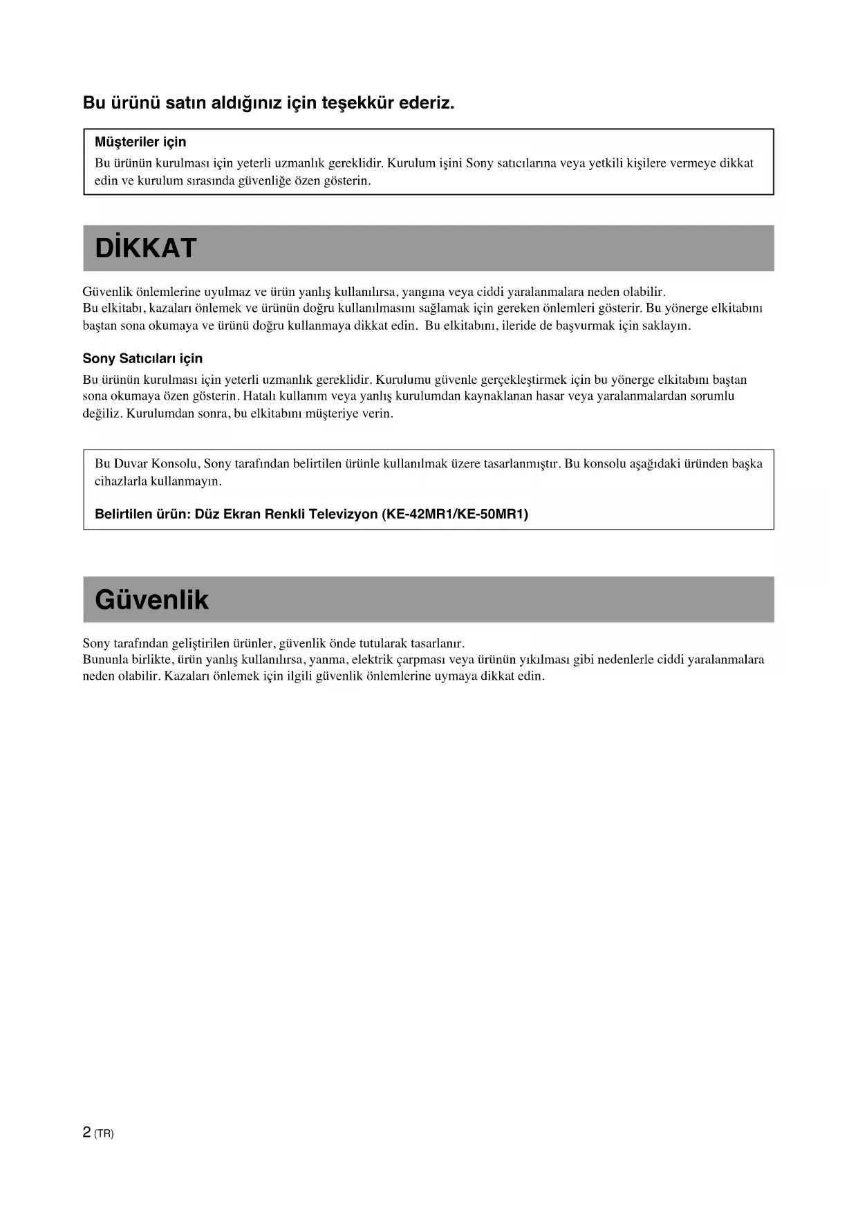 ∆¯ÓÈο ¯·Ú·ÎÙËÚÈÛÙÈο ªÔÓ¿‰·: mm µ¿ÚÔ˜: 8,0 kg ∏ ۯ‰›·ÛË Î·È Ù· Ù¯ÓÈο ¯·Ú·ÎÙËÚÈÛÙÈο ÌÔÚ› Ó· ·ÏÏ¿ÍÔ˘Ó ¯ˆÚ›˜ ÚÔÂȉÔÔ›ËÛË. SU-PW1_AEP_Gre 10/15/02, 4:02 PM15Wall-Mount Bracket 4-092-246-21 (1) 2 (TR) Bu ürünü sat›n ald›¤›n›z için teflekkür ederiz. Müflteriler için Bu ürünün kurulmas› için yeterli uzmanl›k gereklidir. Kurulum iflini Sony sat›c›lar›na veya yetkili kiflilere vermeye dikkat edin ve kurulum s›ras›nda güvenli¤e özen gösterin. D‹KKAT Güvenlik önlemlerine uyulmaz ve ürün yanl›fl kullan›l›rsa, yang›na veya ciddi yaralanmalara neden olabilir. Bu elkitab›, kazalar› önlemek ve ürünün do¤ru kullan›lmas›n› sa¤lamak için gereken önlemleri gösterir. Bu yönerge elkitab›n› bafltan sona okumaya ve ürünü do¤ru kullanmaya dikkat edin. Bu elkitab›n›, ileride de baflvurmak için saklay›n. Sony Sat›c›lar› için Bu ürünün kurulmas› için yeterli uzmanl›k gereklidir. Kurulumu güvenle gerçeklefltirmek için bu yönerge elkitab›n› bafltan sona okumaya özen gösterin. Hatal› kullan›m veya yanl›fl kurulumdan kaynaklanan hasar veya yaralanmalardan sorumlu de¤iliz. Kurulumdan sonra, bu elkitab›n› müflteriye verin. Bu Duvar Konsolu, Sony taraf›ndan belirtilen ürünle kullan›lmak üzere tasarlanm›flt›r. Bu konsolu afla¤›daki üründen baflka cihazlarla kullanmay›n. Belirtilen ürün: Düz Ekran Renkli Televizyon (KE-42MR1/KE-50MR1) Güvenlik Sony taraf›ndan gelifltirilen ürünler, güvenlik önde tutularak tasarlan›r. Bununla birlikte, ürün yanl›fl kullan›l›rsa, yanma, elektrik çarpmas› veya ürünün y›k›lmas› gibi nedenlerle ciddi yaralanmalara neden olabilir. Kazalar› önlemek için ilgili güvenlik önlemlerine uymaya dikkat edin. SU-PW1_AEP_Tur 10/15/02, 3:45 PM2Wall-Mount Bracket 4-092-246-21 (1) 3 (TR) Müflteriler için D‹KKAT Afla¤›daki önlemlere uyulmamas› durumunda, yang›n, elektrik çarpmas› veya patlama sonucu ölümveya ciddi yaralanma olas›l›¤› vard›r. Kurulum iflini yetkili kiflilere vermeye dikkat edin ve kurulum s›ras›nda çocuklar› uzakta tutun. Duvar Konsolu’nu yetkili olmayan kifliler kurarsa, afla¤›daki kazalar olabilir.• Deprem durumunda Görüntü Birimi düflebilir ve ezilme veya k›r›lma gibi ciddibir yaralanmaya neden olabilir.• Duvar Konsolu’nun kuruldu¤u duvar sabit, düz veya zemine dik de¤ilse, birimdüflebilir ve yaralanmaya veya mal kayb›na neden olabilir. Duvar, GörüntüBirimi’nin a¤›rl›¤›n›n en az dört (4) kat› kadar a¤›rl›¤› tafl›yabilmelidir (KE-42MR1: 53 kg × 4 = 212 kg, KE-50MR1: 39 kg × 4 = 156 kg).• Duvar Konsolu’nun duvardaki kurulumu yeterince sa¤lam de¤ilse, birimdüflebilir ve yaralanmaya veya mal kayb›na neden olabilir. Duvar Konsolu’nun tafl›nmas› veya sökülmesi s›ras›nda, kurulum iflini yetkili kiflilere vermeye dikkat edin. Duvar Konsolu’nu tafl›ma veya sökme iflini yetkili olmayan kifliler yaparsa, Görüntü Birimi düflebilir ve yaralanma veya malkayb›na yol açabilir. Duvar Konsolu’nu tafl›ma veya sökme iflini en az iki kiflinin yapmas›n› sa¤lay›n. Görüntü Birimi’nin üstüne hiçbir s›v› dökmeyin. Görüntü Birimi’nin ›slanmas›na izin verirseniz, bu durum yang›na veya elektrik çarpmas›na neden olabilir. Görüntü Birimi monte edildikten sonra c›vatalar›, vb. ç›karmay›n. Aksi taktirde, Görüntü Birimi düflebilir. Duvar Konsolu’nu sökmeyin veya parçalar›nda de¤ifliklik yapmay›n. Yaparsan›z, Duvar Konsolu düflebilir ve yaralanmaya veya mal kayb›na neden olabilir. Belirtilen üründen baflka gereçler takmay›n. Bu Duvar Konsolu, belirtilen ürünle kullan›lmak üzere tasarlanm›flt›r. Belirtilenden baflka ürün takarsan›z, düflüp yaralanmalara veya mal kayb›na neden olabilir. Türkçe