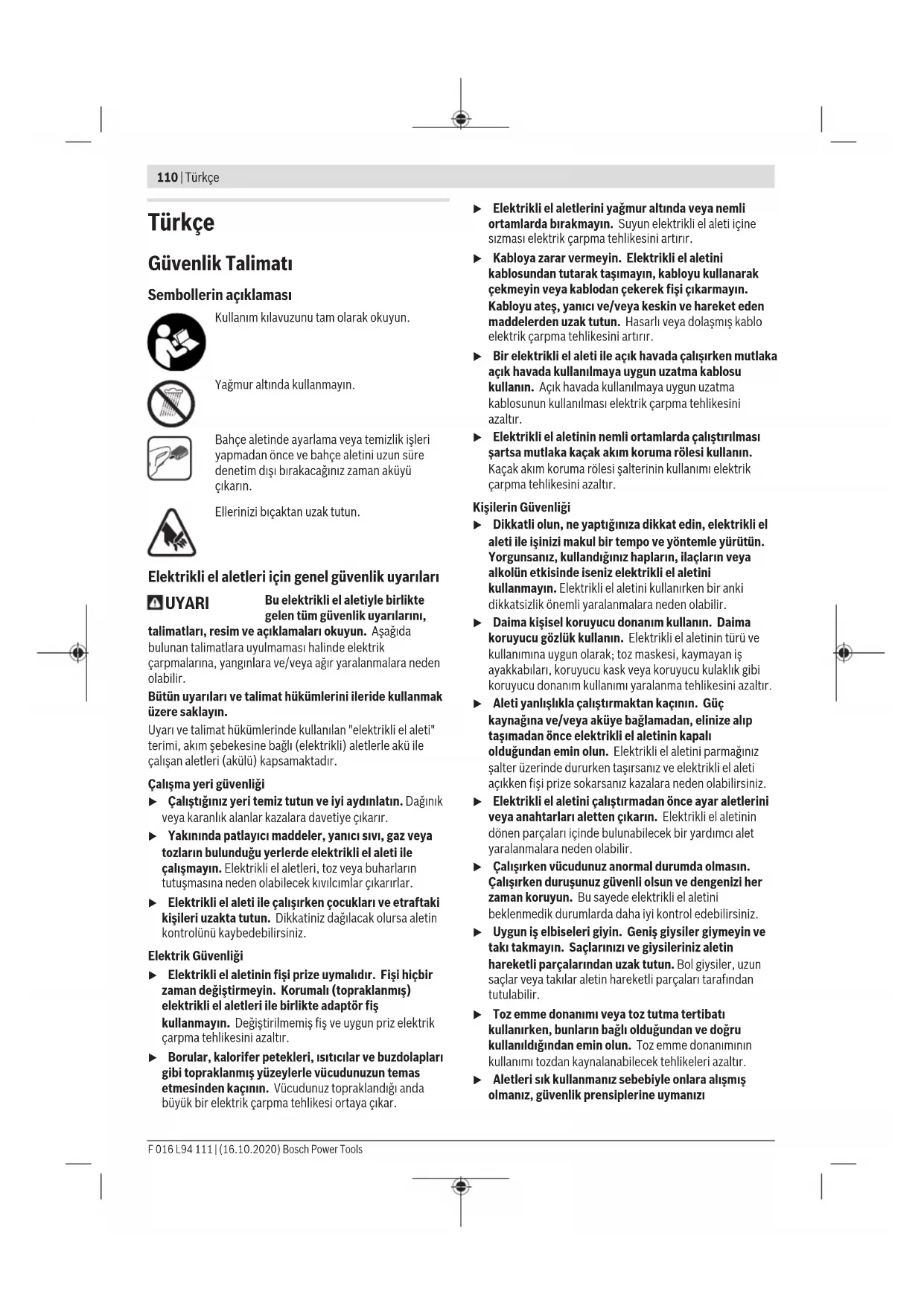 Ελέγξτε την τάση δικτύου και, ενδεχομένως, δώστε τον φορτιστή για έλεγχο σε ένα εξουσιοδοτημένο κατάστημα σέρβις για ηλεκτρικά εργαλεία της Bosch F 016 L94 111 | (16.10.2020) Bosch Power Toolsloading-circle-1110 | Türkçe Türkçe Güvenlik Talimatı Sembollerin açıklaması Kullanım kılavuzunu tam olarak okuyun. Yağmur altında kullanmayın. Bahçe aletinde ayarlama veya temizlik işleri yapmadan önce ve bahçe aletini uzun süre denetim dışı bırakacağınız zaman aküyü çıkarın. Ellerinizi bıçaktan uzak tutun. Elektrikli el aletleri için genel güvenlik uyarıları UYARI Bu elektrikli el aletiyle birlikte gelen tüm güvenlik uyarılarını, talimatları, resim ve açıklamaları okuyun. Aşağıda bulunan talimatlara uyulmaması halinde elektrik çarpmalarına, yangınlara ve/veya ağır yaralanmalara neden olabilir. Bütün uyarıları ve talimat hükümlerini ileride kullanmak üzere saklayın. Uyarı ve talimat hükümlerinde kullanılan "elektrikli el aleti" terimi, akım şebekesine bağlı (elektrikli) aletlerle akü ile çalışan aletleri (akülü) kapsamaktadır. Çalışma yeri güvenliği u Çalıştığınız yeri temiz tutun ve iyi aydınlatın. Dağınık veya karanlık alanlar kazalara davetiye çıkarır. u Yakınında patlayıcı maddeler, yanıcı sıvı, gaz veya tozların bulunduğu yerlerde elektrikli el aleti ile çalışmayın. Elektrikli el aletleri, toz veya buharların tutuşmasına neden olabilecek kıvılcımlar çıkarırlar. u Elektrikli el aleti ile çalışırken çocukları ve etraftaki kişileri uzakta tutun. Dikkatiniz dağılacak olursa aletin kontrolünü kaybedebilirsiniz. Elektrik Güvenliği u Elektrikli el aletinin fişi prize uymalıdır. Fişi hiçbir zaman değiştirmeyin. Korumalı (topraklanmış) elektrikli el aletleri ile birlikte adaptör fiş kullanmayın. Değiştirilmemiş fiş ve uygun priz elektrik çarpma tehlikesini azaltır. u Borular, kalorifer petekleri, ısıtıcılar ve buzdolapları gibi topraklanmış yüzeylerle vücudunuzun temas etmesinden kaçının. Vücudunuz topraklandığı anda büyük bir elektrik çarpma tehlikesi ortaya çıkar. u Elektrikli el aletlerini yağmur altında veya nemli ortamlarda bırakmayın. Suyun elektrikli el aleti içine sızması elektrik çarpma tehlikesini artırır. u Kabloya zarar vermeyin. Elektrikli el aletini kablosundan tutarak taşımayın, kabloyu kullanarak çekmeyin veya kablodan çekerek fişi çıkarmayın. Kabloyu ateş, yanıcı ve/veya keskin ve hareket eden maddelerden uzak tutun. Hasarlı veya dolaşmış kablo elektrik çarpma tehlikesini artırır. u Bir elektrikli el aleti ile açık havada çalışırken mutlaka açık havada kullanılmaya uygun uzatma kablosu kullanın. Açık havada kullanılmaya uygun uzatma kablosunun kullanılması elektrik çarpma tehlikesini azaltır. u Elektrikli el aletinin nemli ortamlarda çalıştırılması şartsa mutlaka kaçak akım koruma rölesi kullanın. Kaçak akım koruma rölesi şalterinin kullanımı elektrik çarpma tehlikesini azaltır. Kişilerin Güvenliği u Dikkatli olun, ne yaptığınıza dikkat edin, elektrikli el aleti ile işinizi makul bir tempo ve yöntemle yürütün. Yorgunsanız, kullandığınız hapların, ilaçların veya alkolün etkisinde iseniz elektrikli el aletini kullanmayın. Elektrikli el aletini kullanırken bir anki dikkatsizlik önemli yaralanmalara neden olabilir. u Daima kişisel koruyucu donanım kullanın. Daima koruyucu gözlük kullanın. Elektrikli el aletinin türü ve kullanımına uygun olarak; toz maskesi, kaymayan iş ayakkabıları, koruyucu kask veya koruyucu kulaklık gibi koruyucu donanım kullanımı yaralanma tehlikesini azaltır. u Aleti yanlışlıkla çalıştırmaktan kaçının. Güç kaynağına ve/veya aküye bağlamadan, elinize alıp taşımadan önce elektrikli el aletinin kapalı olduğundan emin olun. Elektrikli el aletini parmağınız şalter üzerinde dururken taşırsanız ve elektrikli el aleti açıkken fişi prize sokarsanız kazalara neden olabilirsiniz. u Elektrikli el aletini çalıştırmadan önce ayar aletlerini veya anahtarları aletten çıkarın. Elektrikli el aletinin dönen parçaları içinde bulunabilecek bir yardımcı alet yaralanmalara neden olabilir. u Çalışırken vücudunuz anormal durumda olmasın. Çalışırken duruşunuz güvenli olsun ve dengenizi her zaman koruyun. Bu sayede elektrikli el aletini beklenmedik durumlarda daha iyi kontrol edebilirsiniz. u Uygun iş elbiseleri giyin. Geniş giysiler giymeyin ve takı takmayın. Saçlarınızı ve giysileriniz aletin hareketli parçalarından uzak tutun. Bol giysiler, uzun saçlar veya takılar aletin hareketli parçaları tarafından tutulabilir. u Toz emme donanımı veya toz tutma tertibatı kullanırken, bunların bağlı olduğundan ve doğru kullanıldığından emin olun. Toz emme donanımının kullanımı tozdan kaynalanabilecek tehlikeleri azaltır. u Aletleri sık kullanmanız sebebiyle onlara alışmış olmanız, güvenlik prensiplerine uymanızı F 016 L94 111 | (16.10.2020) Bosch Power ToolsTürkçe | 111 önlememelidir. Dikkatsiz bir hareket, bir anda ciddi yaralanmalara yol açabilir. Elektrikli el aletlerinin kullanımı ve bakımı u Elektrikli el aletini aşırı ölçüde zorlamayın. Yaptığınız işe uygun elektrikli el aletleri kullanın. Uygun performanslı elektrikli el aleti ile, belirlenen çalışma alanında daha iyi ve güvenli çalışırsınız. u Şalteri bozuk olan elektrikli el aletini kullanmayın. Açılıp kapanamayan bir elektrikli el aleti tehlikelidir ve onarılmalıdır. u Elektrikli el aletinde bir ayarlama işlemine başlamadan, herhangi bir aksesuarı değiştirirken veya elektrikli el aletini elinizden bırakırken fişi güç kaynağından çekin veya aküyü çıkarın. Bu önlem, elektrikli el aletinin yan