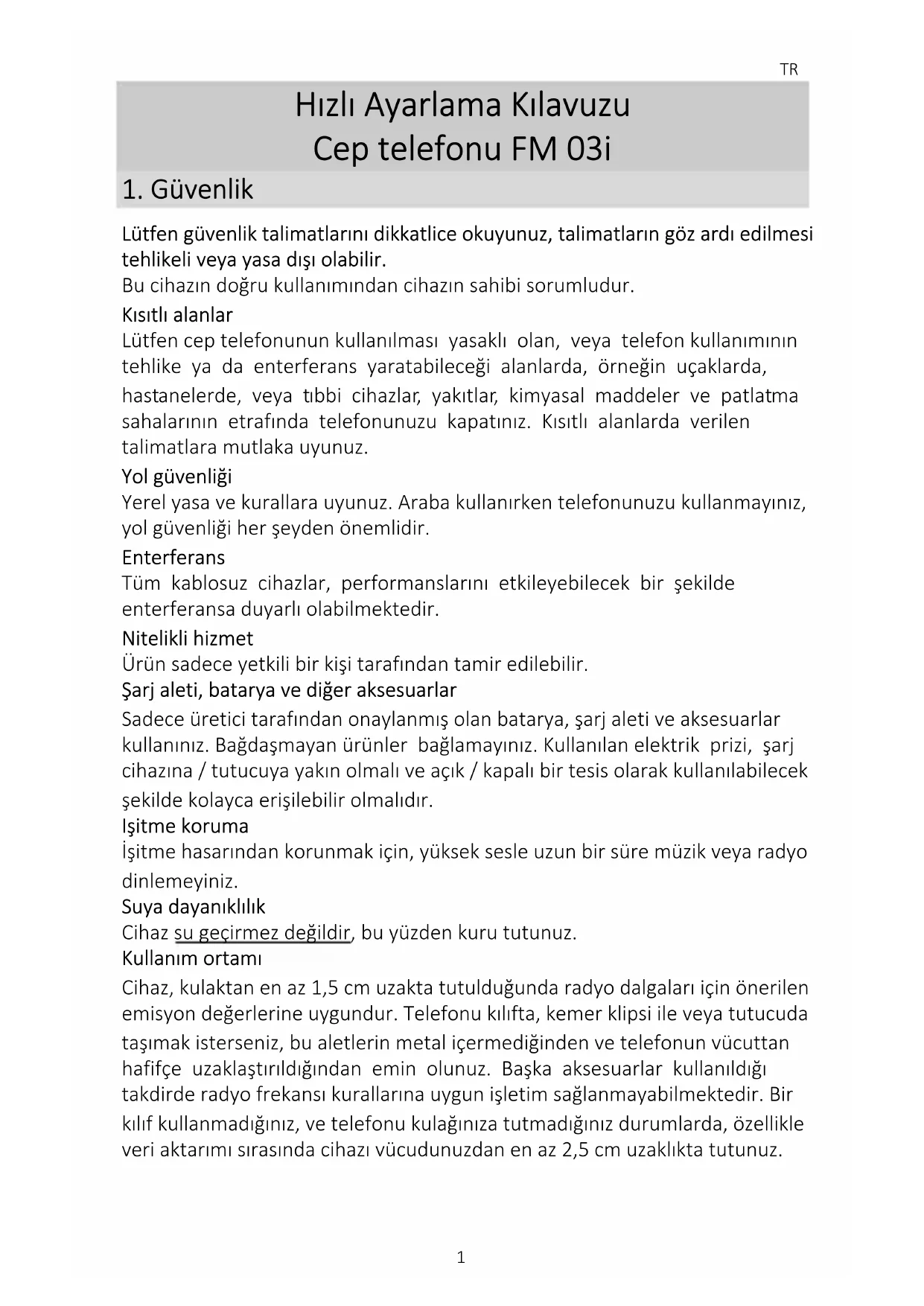 Lütfen güvenlik talimatlarını dikkatlice okuyunuz, talimatların göz ardı edilmesi tehlikeli veya yasa dışı olabilir. Bu cihazın doğru kullanımından cihazın sahibi sorumludur. Kısıtlı alanlar Lütfen cep telefonunun kullanılması yasaklı olan, veya telefon kullanımının tehlike ya da enterferans yaratabileceği alanlarda, örneğin uçaklarda, hastanelerde, veya tıbbi cihazlar, yakıtlar, kimyasal maddeler ve patlatma sahalarının etrafında telefonunuzu kapatınız. Kısıtlı alanlarda verilen talimatlara mutlaka uyunuz. Yol güvenliği Yerel yasa ve kurallara uyunuz. Araba kullanırken telefonunuzu kullanmayınız, yol güvenliği her şeyden önemlidir. Enterferans Tüm kablosuz cihazlar, performanslarını etkileyebilecek bir şekilde enterferansa duyarlı olabilmektedir. Nitelikli hizmet Ürün sadece yetkili bir kişi tarafından tamir edilebilir. Şarj aleti, batarya ve diğer aksesuarlar Sadece üretici tarafından onaylanmış olan batarya, şarj aleti ve aksesuarlar kullanınız. Bağdaşmayan ürünler bağlamayınız. Kullanılan elektrik prizi, şarj cihazına / tutucuya yakın olmalı ve açık / kapalı bir tesis olarak kullanılabilecek şekilde kolayca erişilebilir olmalıdır. Işitme koruma İşitme hasarından korunmak için, yüksek sesle uzun bir süre müzik veya radyo dinlemeyiniz. Suya dayanıklılık Cihaz su geçirmez değildir, bu yüzden kuru tutunuz. Kullanım ortamı Cihaz, kulaktan en az 1,5 cm uzakta tutulduğunda radyo dalgaları için önerilen emisyon değerlerine uygundur. Telefonu kılıfta, kemer klipsi ile veya tutucuda taşımak isterseniz, bu aletlerin metal içermediğinden ve telefonun vücuttan hafifçe uzaklaştırıldığından emin olunuz. Başka aksesuarlar kullanıldığı takdirde radyo frekansı kurallarına uygun işletim sağlanmayabilmektedir. Bir kılıf kullanmadığınız, ve telefonu kulağınıza tutmadığınız durumlarda, özellikle veri aktarımı sırasında cihazı vücudunuzdan en az 2,5 cm uzaklıkta tutunuz.TR
