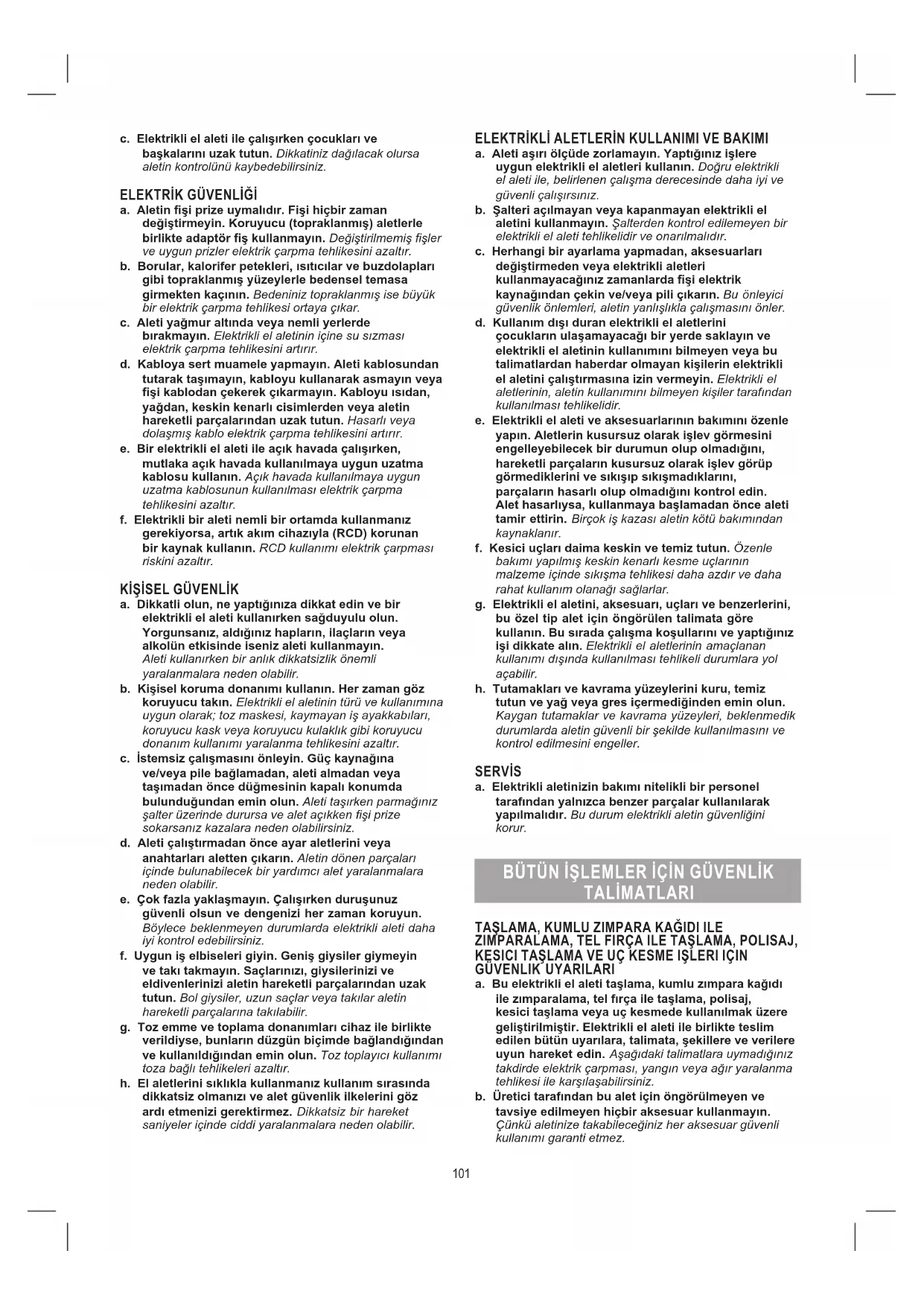 a. Dikkatli olun, ne yaptığınıza dikkat edin ve bir elektrikli el aleti kullanırken sağduyulu olun. Yorgunsanız, aldığınız hapların, ilaçların veya alkolün etkisinde iseniz aleti kullanmayın. Aleti kullanırken bir anlık dikkatsizlik önemli yaralanmalara neden olabilir. b. Kişisel koruma donanımı kullanın. Her zaman göz koruyucu takın. Elektrikli el aletinin türü ve kullanımına uygun olarak; toz maskesi, kaymayan iş ayakkabıları, koruyucu kask veya koruyucu kulaklık gibi koruyucu donanım kullanımı yaralanma tehlikesini azaltır. c. İstemsiz çalışmasını önleyin. Güç kaynağına ve/veya pile bağlamadan, aleti almadan veya taşımadan önce düğmesinin kapalı konumda bulunduğundan emin olun. Aleti taşırken parmağınız şalter üzerinde durursa ve alet açıkken şi prize sokarsanız kazalara neden olabilirsiniz. d. Aleti çalıştırmadan önce ayar aletlerini veya anahtarları aletten çıkarın. Aletin dönen parçaları içinde bulunabilecek bir yardımcı alet yaralanmalara neden olabilir. e. Çok fazla yaklaşmayın. Çalışırken duruşunuz güvenli olsun ve dengenizi her zaman koruyun. Böylece beklenmeyen durumlarda elektrikli aleti daha iyi kontrol edebilirsiniz. f. Uygun iş elbiseleri giyin. Geniş giysiler giymeyin ve takı takmayın. Saçlarınızı, giysilerinizi ve eldivenlerinizi aletin hareketli parçalarından uzak tutun. Bol giysiler, uzun saçlar veya takılar aletin hareketli parçalarına takılabilir. g. Toz emme ve toplama donanımları cihaz ile birlikte verildiyse, bunların düzgün biçimde bağlandığından ve kullanıldığından emin olun. Toz toplayıcı kullanımı toza bağlı tehlikeleri azaltır. h. El aletlerini sıklıkla kullanmanız kullanım sırasında dikkatsiz olmanızı ve alet güvenlik ilkelerini göz ardı etmenizi gerektirmez. Dikkatsiz bir hareket saniyeler içinde ciddi yaralanmalara neden olabilir. ELEKTRİKLİ ALETLERİN KULLANIMI VE BAKIMI a. Aleti aşırı ölçüde zorlamayın. Yaptığınız işlere uygun elektrikli el aletleri kullanın. Doğru elektrikli el aleti ile, belirlenen çalışma derecesinde daha iyi ve güvenli çalışırsınız. b. Şalteri açılmayan veya kapanmayan elektrikli el aletini kullanmayın. Şalterden kontrol edilemeyen bir elektrikli el aleti tehlikelidir ve onarılmalıdır. c. Herhangi bir ayarlama yapmadan, aksesuarları değiştirmeden veya elektrikli aletleri kullanmayacağınız zamanlarda şi elektrik kaynağından çekin ve/veya pili çıkarın. Bu önleyici güvenlik önlemleri, aletin yanlışlıkla çalışmasını önler. d. Kullanım dışı duran elektrikli el aletlerini çocukların ulaşamayacağı bir yerde saklayın ve elektrikli el aletinin kullanımını bilmeyen veya bu talimatlardan haberdar olmayan kişilerin elektrikli el aletini çalıştırmasına izin vermeyin. Elektrikli el aletlerinin, aletin kullanımını bilmeyen kişiler tarafından kullanılması tehlikelidir. e. Elektrikli el aleti ve aksesuarlarının bakımını özenle yapın. Aletlerin kusursuz olarak işlev görmesini engelleyebilecek bir durumun olup olmadığını, hareketli parçaların kusursuz olarak işlev görüp görmediklerini ve sıkışıp sıkışmadıklarını, parçaların hasarlı olup olmadığını kontrol edin. Alet hasarlıysa, kullanmaya başlamadan önce aleti tamir ettirin. Birçok iş kazası aletin kötü bakımından kaynaklanır. f. Kesici uçları daima keskin ve temiz tutun. Özenle bakımı yapılmış keskin kenarlı kesme uçlarının malzeme içinde sıkışma tehlikesi daha azdır ve daha rahat kullanım olanağı sağlarlar. g. Elektrikli el aletini, aksesuarı, uçları ve benzerlerini, bu özel tip alet için öngörülen talimata göre kullanın. Bu sırada çalışma koşullarını ve yaptığınız işi dikkate alın. Elektrikli el aletlerinin amaçlanan kullanımı dışında kullanılması tehlikeli durumlara yol açabilir. h. Tutamakları ve kavrama yüzeylerini kuru, temiz tutun ve yağ veya gres içermediğinden emin olun. Kaygan tutamaklar ve kavrama yüzeyleri, beklenmedik durumlarda aletin güvenli bir şekilde kullanılmasını ve kontrol edilmesini engeller. SERVİS a. Elektrikli aletinizin bakımı nitelikli bir personel tarafından yalnızca benzer parçalar kullanılarak yapılmalıdır. Bu durum elektrikli aletin güvenliğini korur. BÜTÜN İŞLEMLER İÇİN GÜVENLİK TALİMATLARI TAŞLAMA, KUMLU ZIMPARA KAĞIDI ILE ZIMPARALAMA, TEL FIRÇA ILE TAŞLAMA, POLISAJ, KESICI TAŞLAMA VE UÇ KESME IŞLERI IÇIN