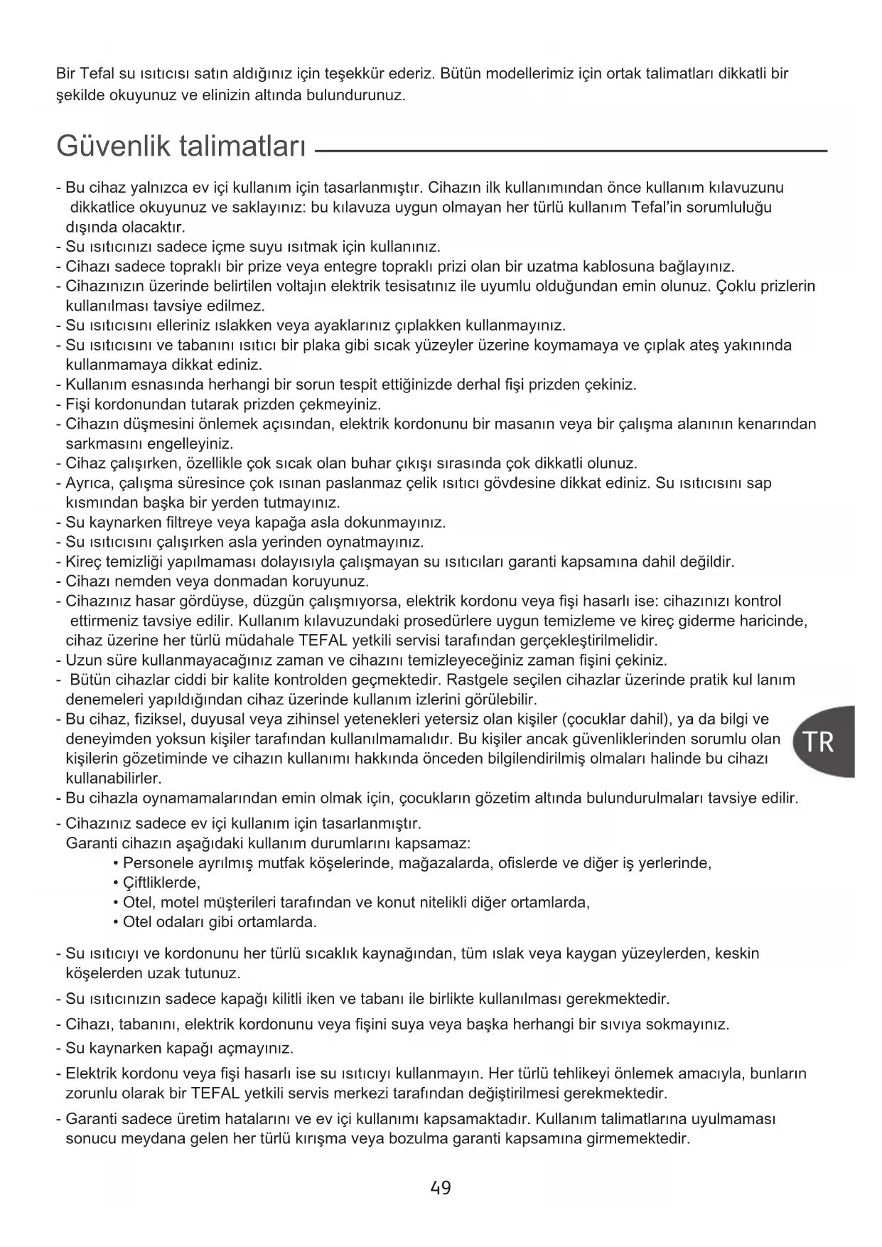 °È· Ó· ·ÔʇÁÂÙÂ Ù˘¯fiÓ ·Ù˘¯‹Ì·Ù·: ÔÙ¤ ÌËÓ Îڷٿ٠ÙÔ ·È‰› ‹ ÙÔ ÌˆÚfi Û·˜ ÛÙ· ¯¤ÚÈ· Û·˜ fiÙ·Ó ›ÓÂÙ ‹ ÌÂٷʤÚÂÙ ¤Ó· ˙ÂÛÙfi ÚfiÊËÌ·. Προστασία του εριβάλλοντος! Ας συµβάλλουµε κι εµείς στην ρστασία τυ του εριβάλλοντος ! ∏ Û˘Û΢‹ Û·˜ ÂÚȤ¯ÂÈ ÔÏÏ¿ ·ÍÈÔÔÈ‹ÛÈÌ· ‹ ·Ó·Î˘ÎÏÒÛÈÌ· ˘ÏÈο. ¶·Ú·‰ÒÛÙ ÙË ·ÏÈ¿ Û˘Û΢‹ Û·˜ Û ΤÓÙÚÔ ‰È·ÏÔÁ‹˜ ‹ ÂÏÏ›„ÂÈ Ù¤ÙÔÈÔ˘ ΤÓÙÚÔ˘ Û ÂÍÔ˘ÛÈÔ‰ÔÙË̤ÓÔ Î¤ÓÙÚÔ Û¤Ú‚È˜ ÙÔ ÔÔ›Ô ı· ·Ó·Ï¿‚ÂÈ ÙËÓ ÂÂÍÂÚÁ·Û›· Ù˘.49 Güvenlik talimatları Bir Tefal su ısıtıcısı satın aldığınız için teşekkür ederiz. Bütün modellerimiz için ortak talimatları dikkatli bir şekilde okuyunuz ve elinizin altında bulundurunuz. - Bu cihaz yalnızca ev içi kullanım için tasarlanmıştır. Cihazın ilk kullanımından önce kullanım kılavuzunu dikkatlice okuyunuz ve saklayınız: bu kılavuza uygun olmayan her türlü kullanım Tefal’in sorumluluğu dışında olacaktır. - Su ısıtıcınızı sadece içme suyu ısıtmak için kullanınız. - Cihazı sadece topraklı bir prize veya entegre topraklı prizi olan bir uzatma kablosuna bağlayınız. - Cihazınızın üzerinde belirtilen voltajın elektrik tesisatınız ile uyumlu olduğundan emin olunuz. Çoklu prizlerin kullanılması tavsiye edilmez. - Su ısıtıcısını elleriniz ıslakken veya ayaklarınız çıplakken kullanmayınız. - Su ısıtıcısını ve tabanını ısıtıcı bir plaka gibi sıcak yüzeyler üzerine koymamaya ve çıplak ateş yakınında kullanmamaya dikkat ediniz. - Kullanım esnasında herhangi bir sorun tespit ettiğinizde derhal fişi prizden çekiniz. - Fişi kordonundan tutarak prizden çekmeyiniz. - Cihazın düşmesini önlemek açısından, elektrik kordonunu bir masanın veya bir çalışma alanının kenarından sarkmasını engelleyiniz. - Cihaz çalışırken, özellikle çok sıcak olan buhar çıkışı sırasında çok dikkatli olunuz. - Ayrıca, çalışma süresince çok ısınan paslanmaz çelik ısıtıcı gövdesine dikkat ediniz. Su ısıtıcısını sap kısmından başka bir yerden tutmayınız. - Su kaynarken filtreye veya kapağa asla dokunmayınız. - Su ısıtıcısını çalışırken asla yerinden oynatmayınız. - Kireç temizliği yapılmaması dolayısıyla çalışmayan su ısıtıcıları garanti kapsamına dahil değildir. - Cihazı nemden veya donmadan koruyunuz. - Cihazınız hasar gördüyse, düzgün çalışmıyorsa, elektrik kordonu veya fişi hasarlı ise: cihazınızı kontrol ettirmeniz tavsiye edilir. Kullanım kılavuzundaki prosedürlere uygun temizleme ve kireç giderme haricinde, cihaz üzerine her türlü müdahale TEFAL yetkili servisi tarafından gerçekleştirilmelidir. - Uzun süre kullanmayacağınız zaman ve cihazını temizleyeceğiniz zaman fişini çekiniz. - Bütün cihazlar ciddi bir kalite kontrolden geçmektedir. Rastgele seçilen cihazlar üzerinde pratik kul lanım denemeleri yapıldığından cihaz üzerinde kullanım izlerini görülebilir. - Bu cihaz, fiziksel, duyusal veya zihinsel yetenekleri yetersiz olan kişiler (çocuklar dahil), ya da bilgi ve deneyimden yoksun kişiler tarafından kullanılmamalıdır. Bu kişiler ancak güvenliklerinden sorumlu olan kişilerin gözetiminde ve cihazın kullanımı hakkında önceden bilgilendirilmiş olmaları halinde bu cihazı kullanabilirler. - Bu cihazla oynamamalarından emin olmak için, çocukların gözetim altında bulundurulmaları tavsiye edilir. - Cihazınız sadece ev içi kullanım için tasarlanmıştır. Garanti cihazın aşağıdaki kullanım durumlarını kapsamaz:
