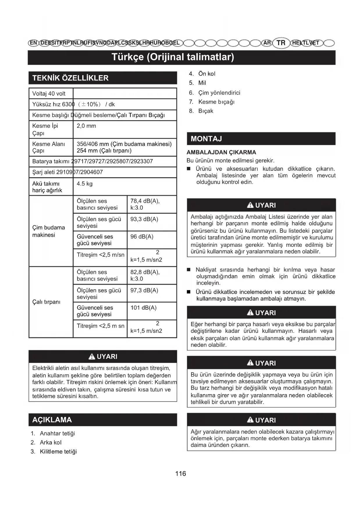 MONTAJ AMBALAJDAN ÇIKARMA Bu ürünün monte edilmesi gerekir. Ürünü ve aksesuarları kutudan dikkatlice çıkarın. Ambalaj listesinde yer alan tüm ögelerin mevcut olduğunu kontrol edin. UYARI Ambalajı açtığınızda Ambalaj Listesi üzerinde yer alan herhangi bir parçanın monte edilmiş halde olduğunu görürseniz bu ürünü kullanmayın. Bu listedeki parçalar üretici tarafından ürüne monte edilmemiştir ve kurulumu müşterinin yapması gerekir. Yanlış monte edilmiş bir ürünü kullanmak ağır yaralanmalara neden olabilir. Nakliyat sırasında herhangi bir kırılma veya hasar oluşmadığından emin olmak için ürünü dikkatlice inceleyin. Ürünü dikkatlice incelemeden ve sorunsuz bir şekilde kullanmaya başlamadan ambalajı atmayın. UYARI Eğer herhangi bir parça hasarlı veya eksikse bu parçalar değiştirilene kadar ürünü kullanmayın. Hasarlı veya eksik parçaları olan ürünü kullanmak ağır yaralanmalara neden olabilir. UYARI Bu ürün üzerinde değişiklik yapmaya veya bu ürün için tavsiye edilmeyen aksesuarlar oluşturmaya çalışmayın. Bu tarz herhangi bir değişiklik veya modikasyon hatalı kullanıma girer ve ağır yaralanmalara neden olabilecek tehlikeli bir durum yaratabilir. UYARI Ağır yaralanmalara neden olabilecek kazara çalıştırmayı önlemek için, parçaları monte ederken batarya takımını daima üründen çıkarın. 116Türkçe (Orijinal talimatlar)