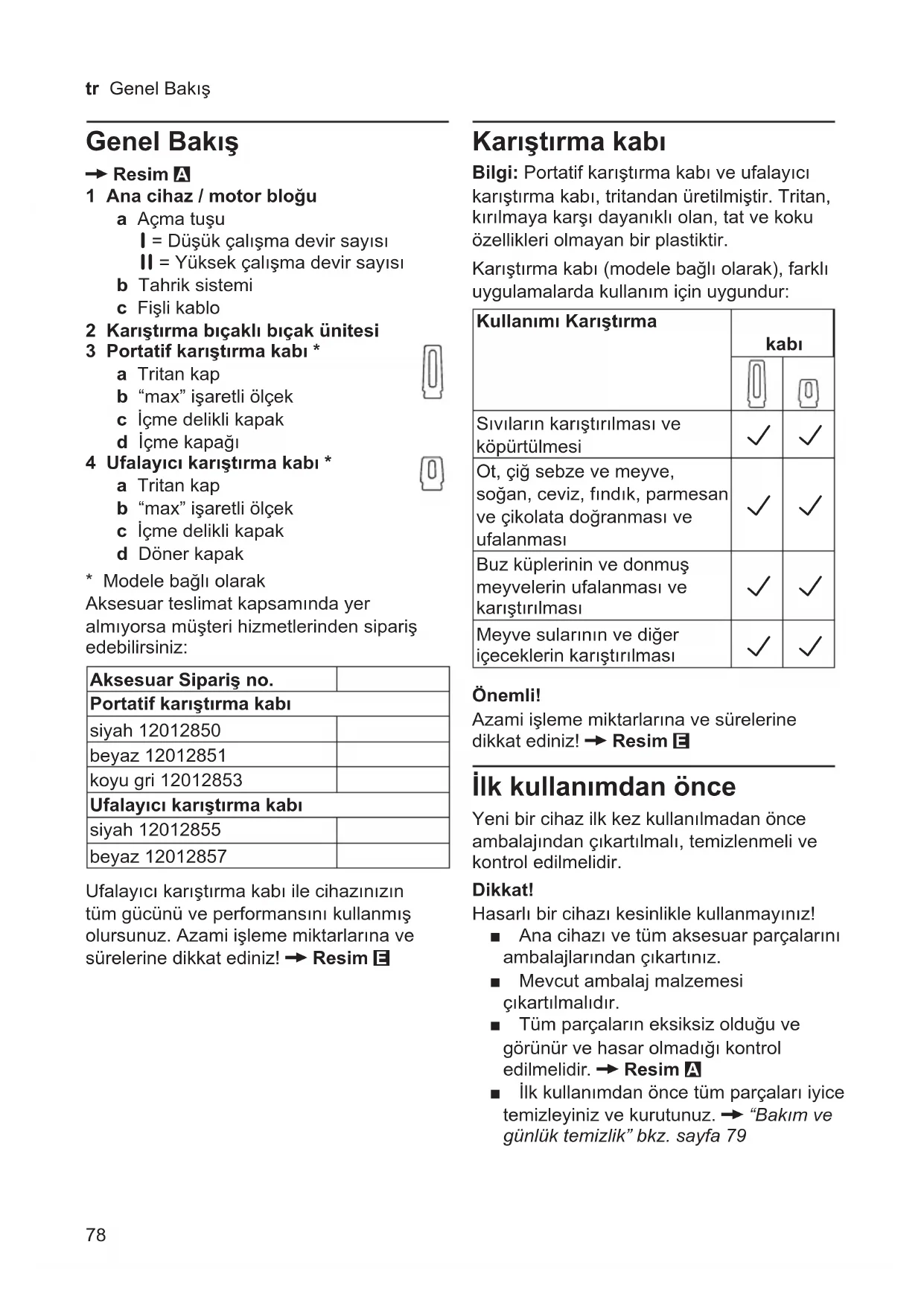 - Modele bağlı olarak Aksesuar teslimat kapsamında yer almıyorsa müşteri hizmetlerinden sipariş edebilirsiniz: Aksesuar Sipariş no. Portatif karıştırma kabı siyah 12012850 beyaz 12012851 koyu gri 12012853 Ufalayıcı karıştırma kabı siyah 12012855 beyaz 12012857 Ufalayıcı karıştırma kabı ile cihazınızın tüm gücünü ve performansını kullanmış olursunuz. Azami işleme miktarlarına ve sürelerine dikkat ediniz! X Resim E Karıştırma kabı Bilgi: Portatif karıştırma kabı ve ufalayıcı karıştırma kabı, tritandan üretilmiştir. Tritan, kırılmaya karşı dayanıklı olan, tat ve koku özellikleri olmayan bir plastiktir. Karıştırma kabı (modele bağlı olarak), farklı uygulamalarda kullanım için uygundur: Kullanımı Karıştırma kabı Sıvıların karıştırılması ve köpürtülmesi G G Ot, çiğ sebze ve meyve, soğan, ceviz, fındık, parmesan ve çikolata doğranması ve ufalanması G G Buz küplerinin ve donmuş meyvelerin ufalanması ve karıştırılması G G Meyve sularının ve diğer içeceklerin karıştırılması G G Önemli! Azami işleme miktarlarına ve sürelerine dikkat ediniz! X Resim E İlk kullanımdan önce Yeni bir cihaz ilk kez kullanılmadan önce ambalajından çıkartılmalı, temizlenmeli ve kontrol edilmelidir. Dikkat! Hasarlı bir cihazı kesinlikle kullanmayınız! ■ Ana cihazı ve tüm aksesuar parçalarını ambalajlarından çıkartınız. ■ Mevcut ambalaj malzemesi çıkartılmalıdır. ■ Tüm parçaların eksiksiz olduğu ve görünür ve hasar olmadığı kontrol edilmelidir. X Resim A ■ İlk kullanımdan önce tüm parçaları iyice temizleyiniz ve kurutunuz. X“Bakımve günlüktemizlik”bkz.sayfa7979