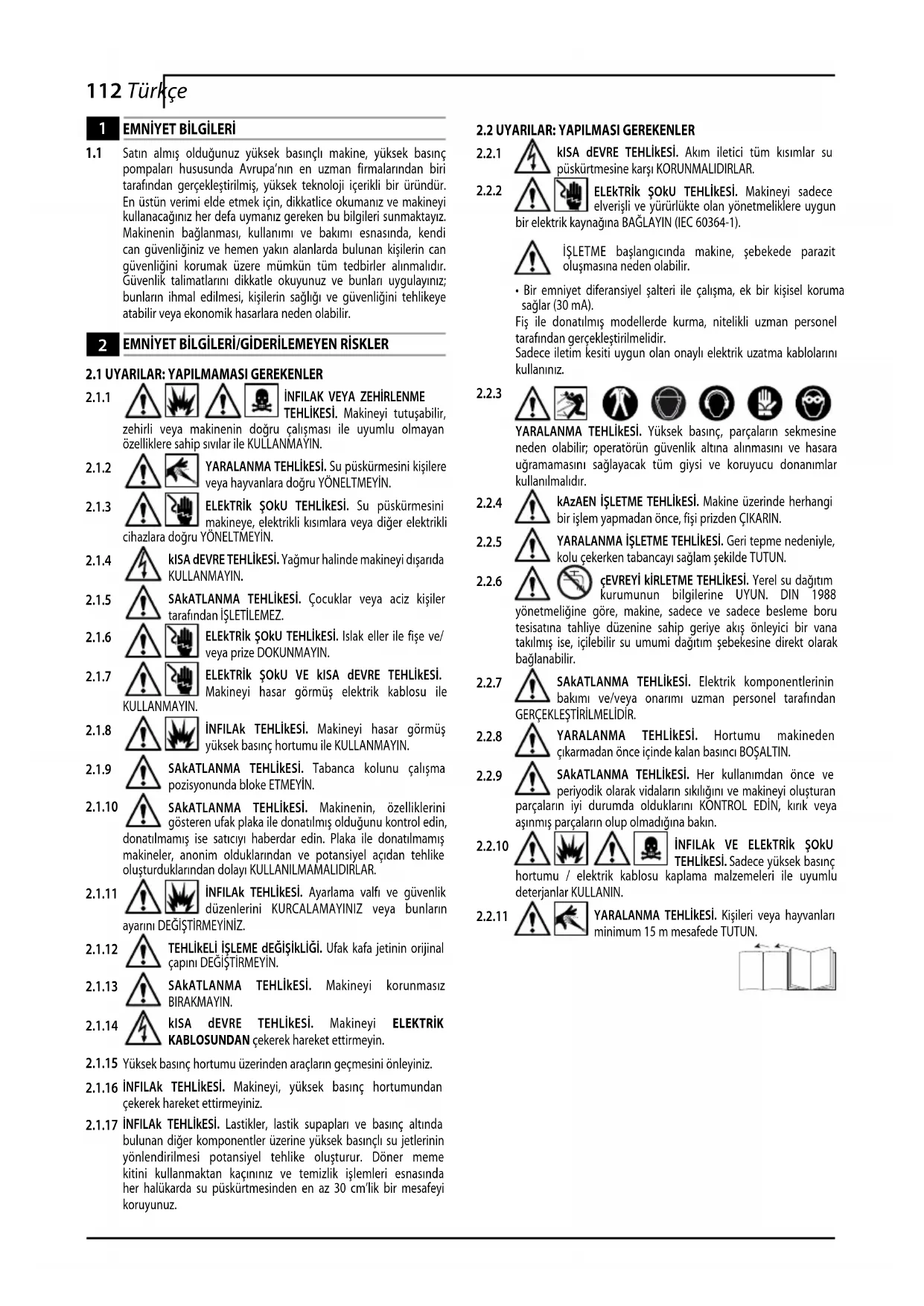 YARALANMA TEHLİkESİ. Yüksek basınç, parçaların sekmesine neden olabilir; operatörün güvenlik altına alınmasını ve hasara uğramamasını sağlayacak tüm giysi ve koruyucu donanımlar kullanılmalıdır. kAzAEN İşLETME TEHLİkESİ. Makine üzerinde herhangi bir işlem yapmadan önce, fişi prizden ÇIKARIN.